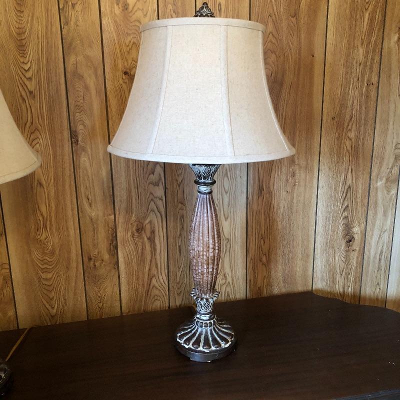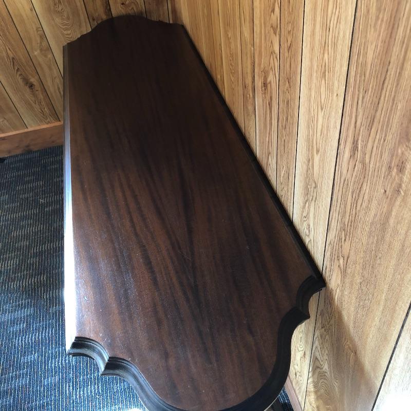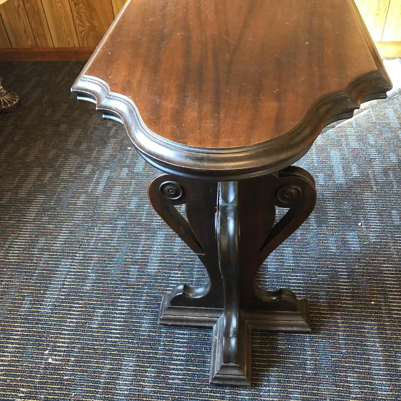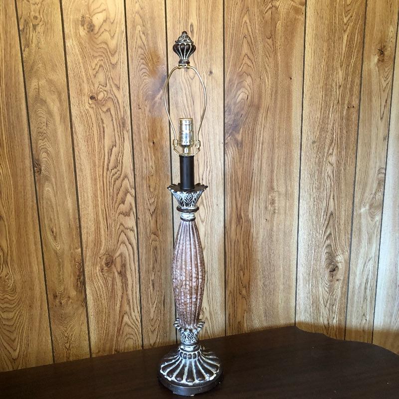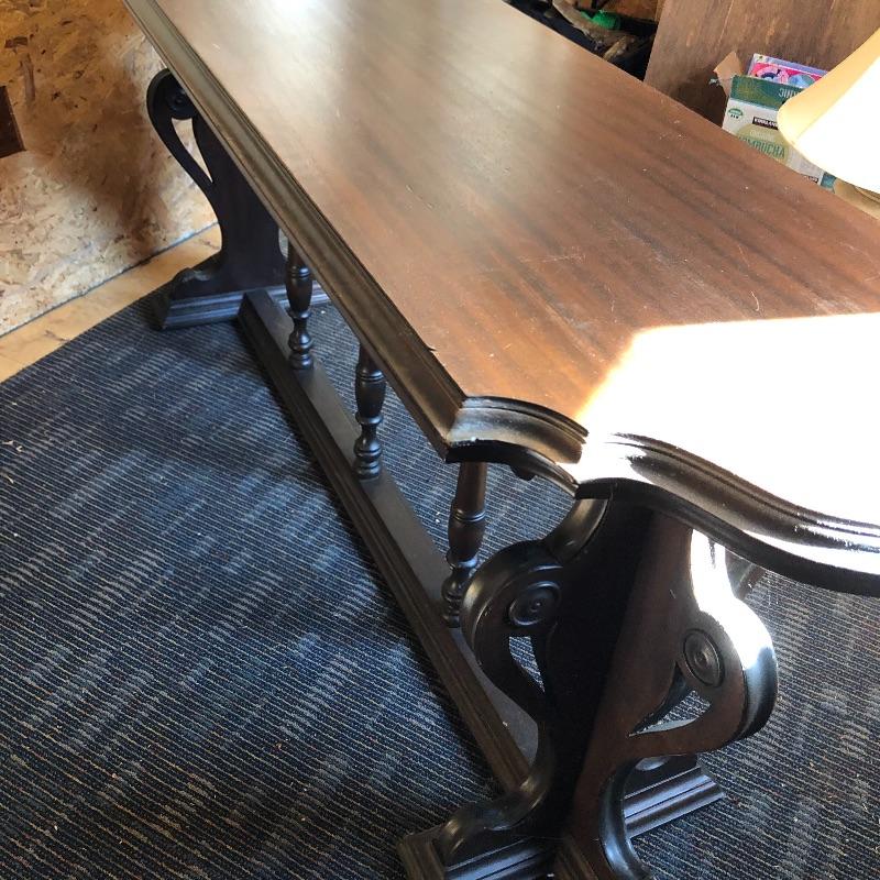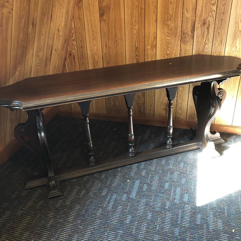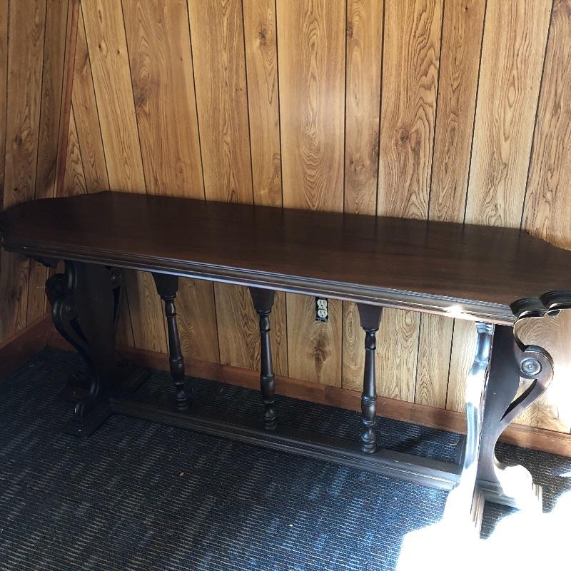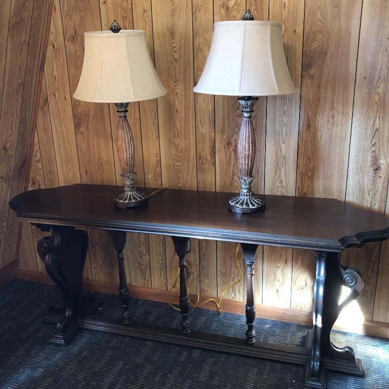 This lot includes a table and two lamps. The table measures 71”L x 19”W x 29” H. Note the wooden table has a few splits in the veneer on the legs (pictured). The ornate lamps measure 32” tall to the top of the finial with a 6.5” base. They appear to be made of ceramic material. Lamps powered on when tested. Local pick up only.