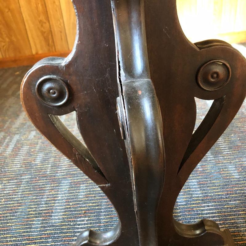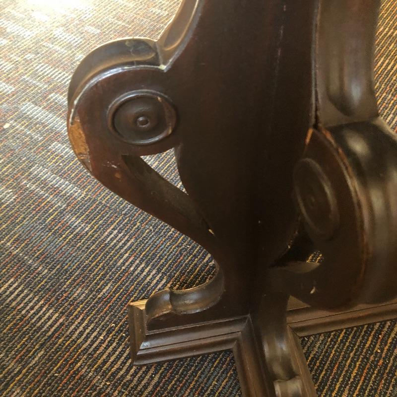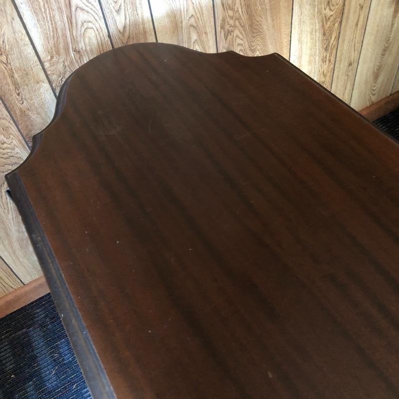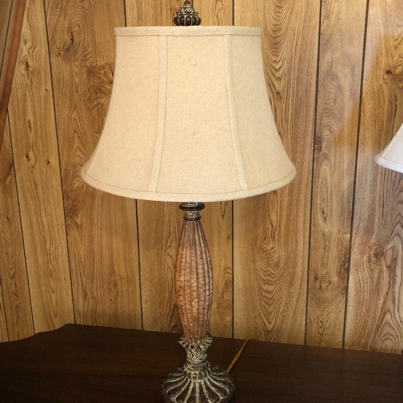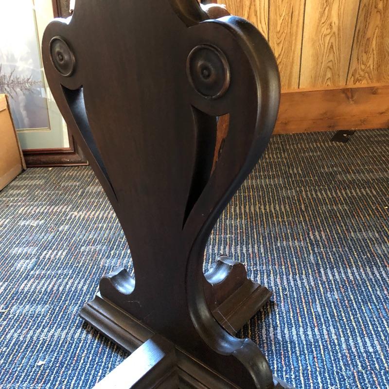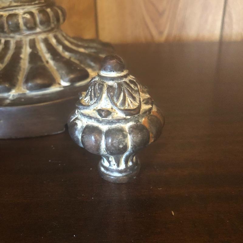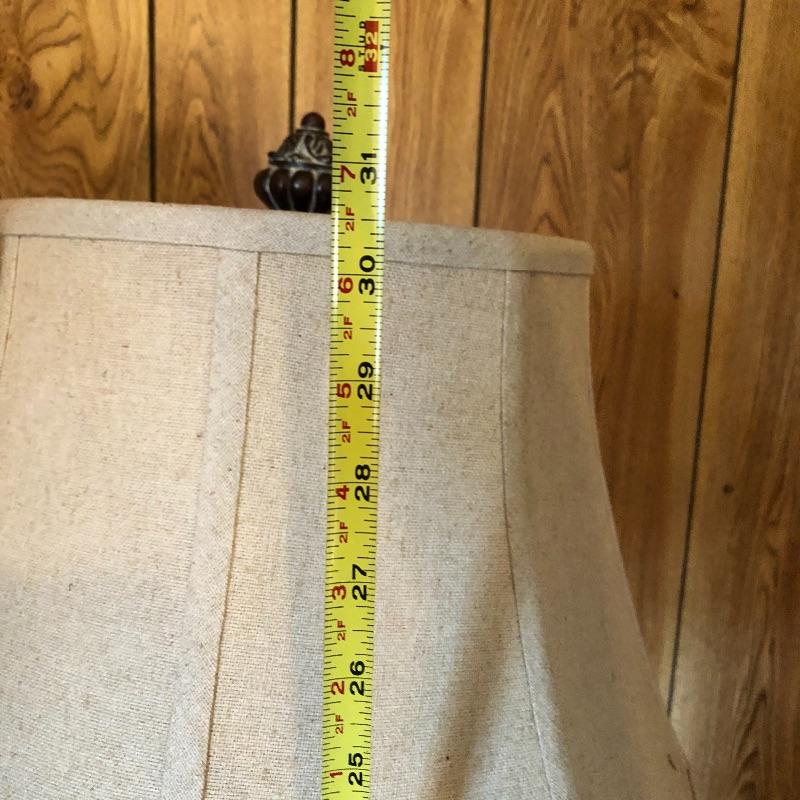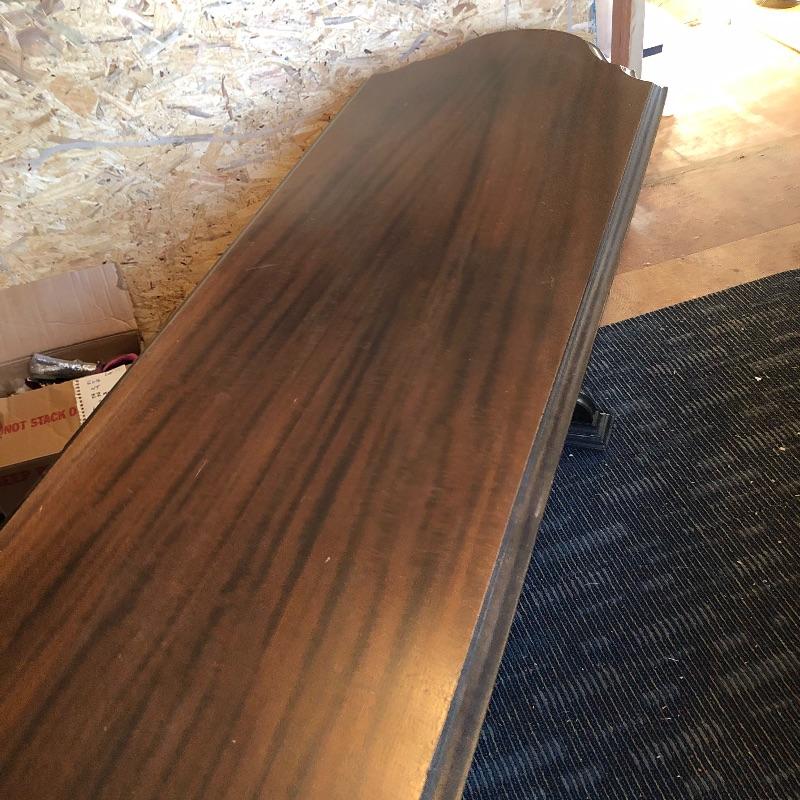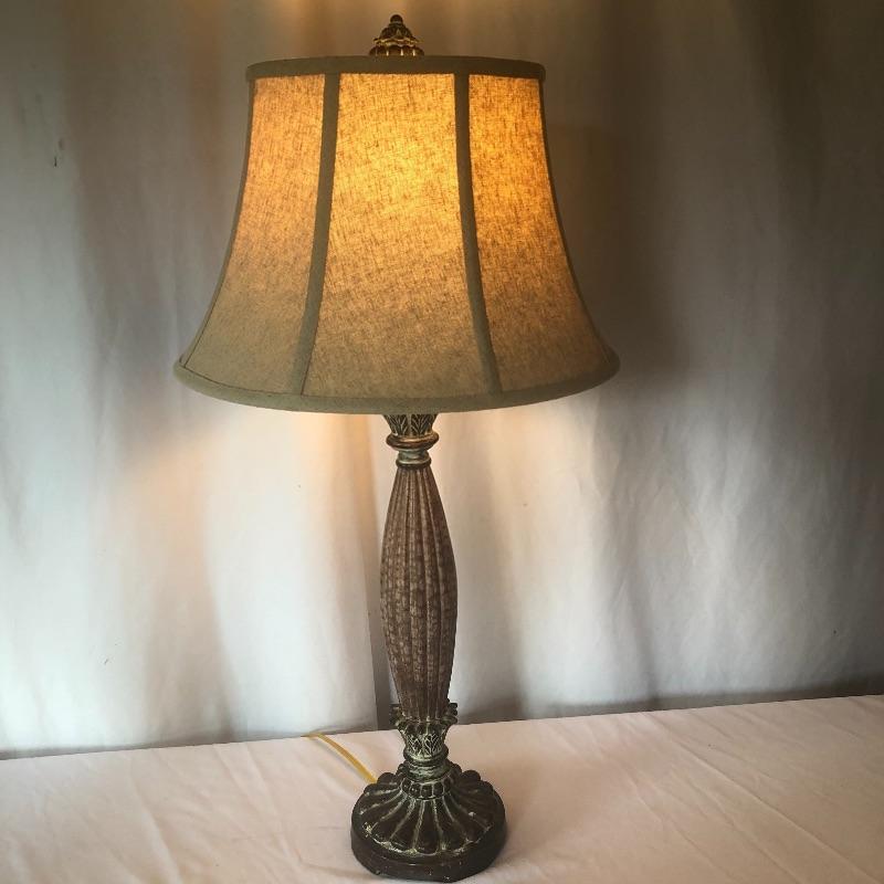 This lot includes a table and two lamps. The table measures 71”L x 19”W x 29” H. Note the wooden table has a few splits in the veneer on the legs (pictured). The ornate lamps measure 32” tall to the top of the finial with a 6.5” base. They appear to be made of ceramic material. Lamps powered on when tested. Local pick up only.