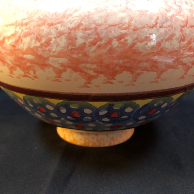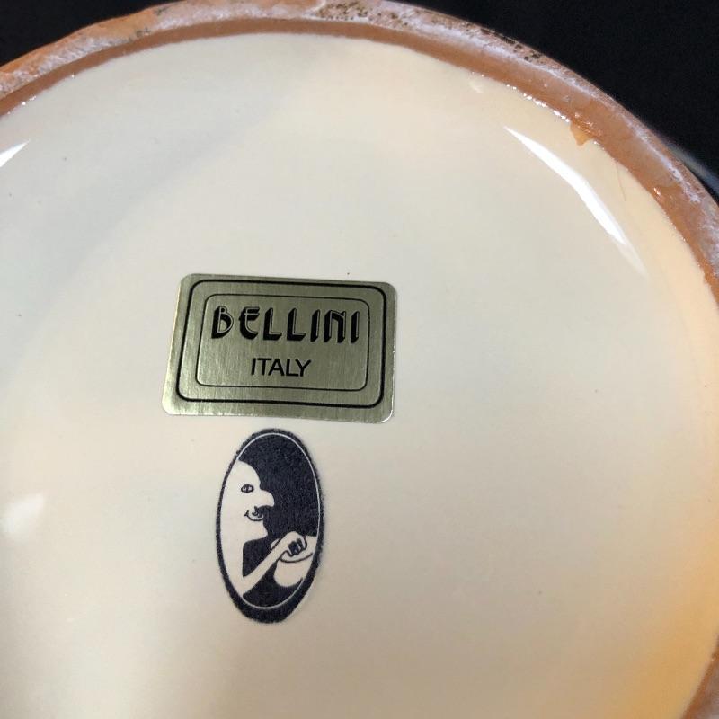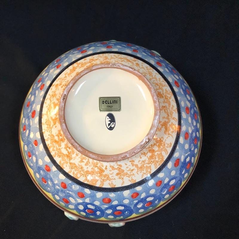 This striking bowl has the Bellini sticker on its base. This vibrant ceramic piece will look great on the dining table. It measures approximately 9” diameter and 7” high.