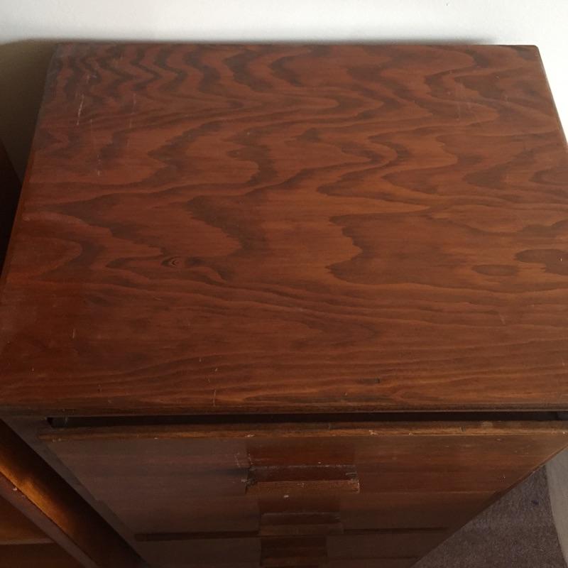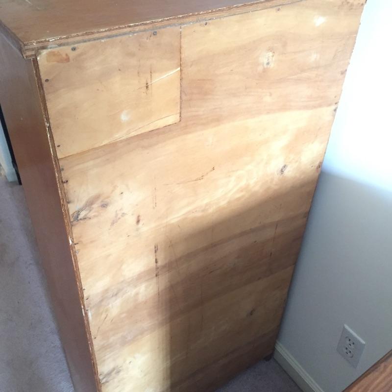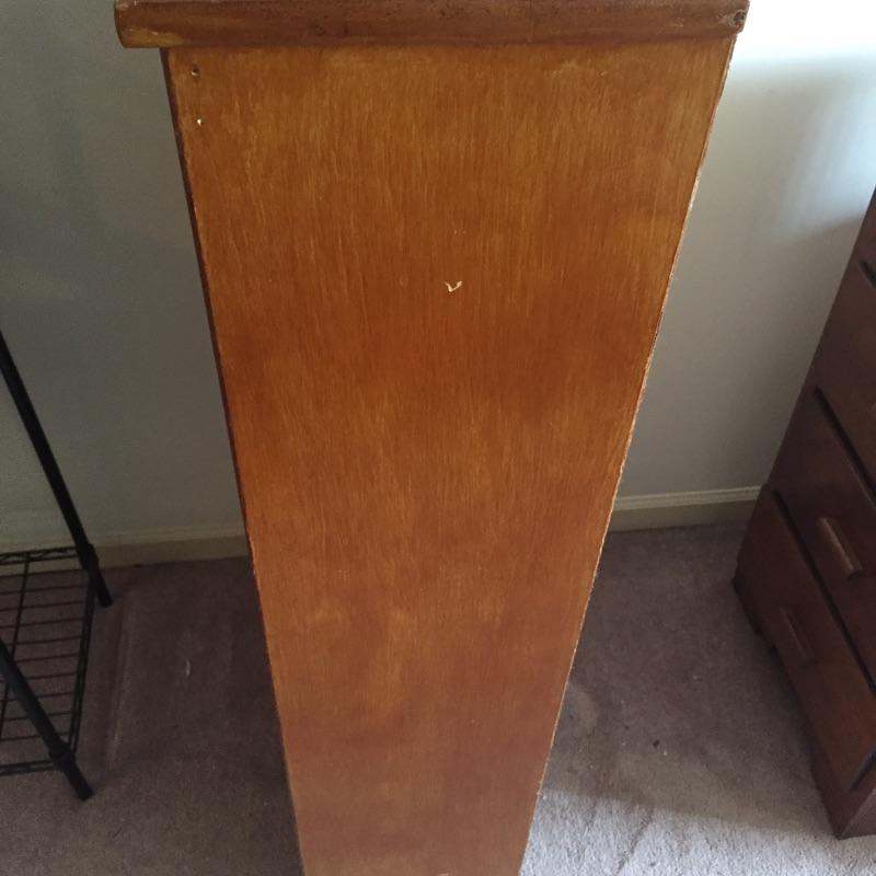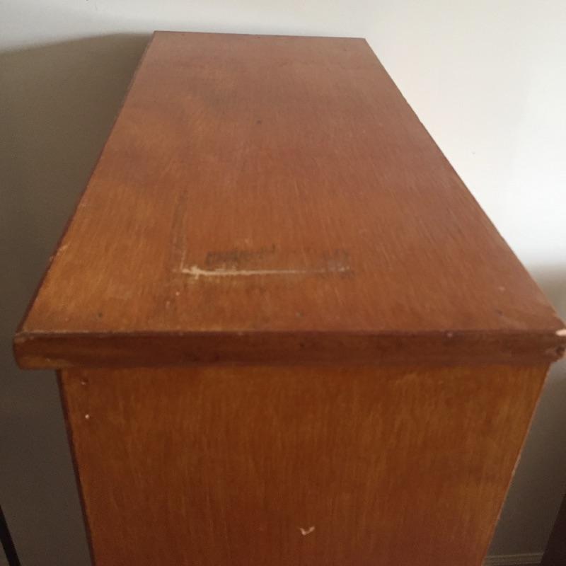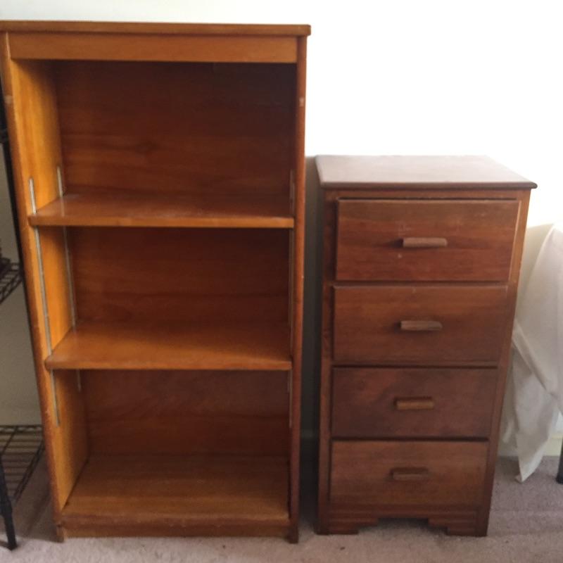 Two chest of drawers and a small bookcase. These are not a matching set. Bookcase measures 11” x 24.5” x 49”. Four drawer chest measures 14” x 18” x 36”. Six drawer chest measures 13” x 36” x 29” and has blemishes on top - see pictures.