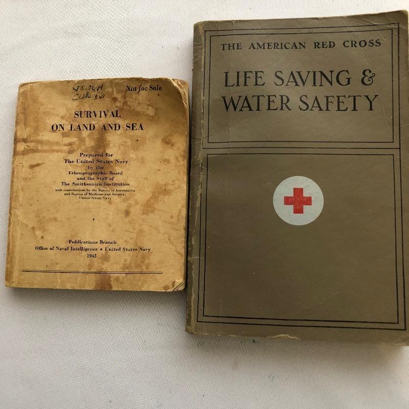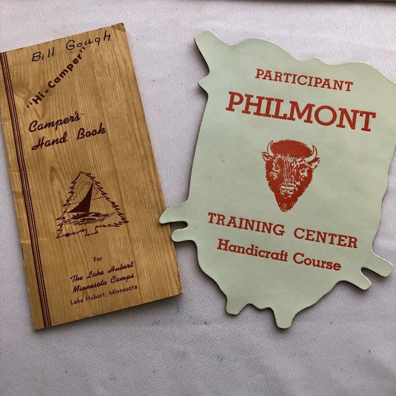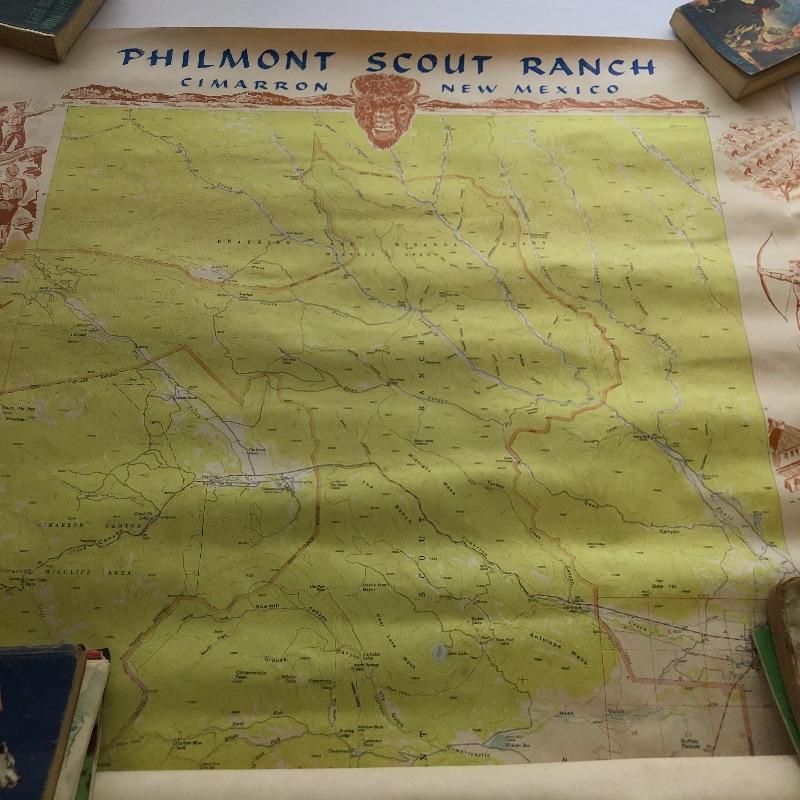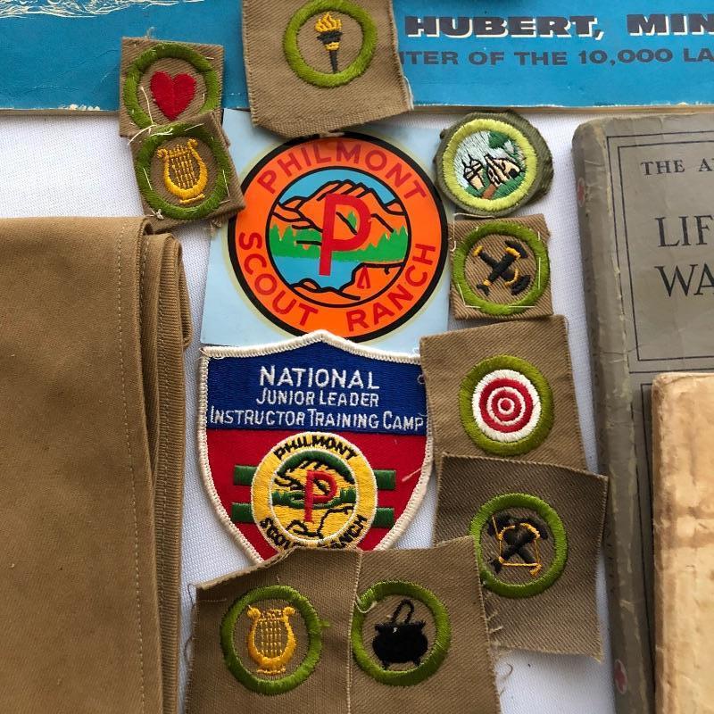 Huge assortment of Boy Scout and other camp and club Memorabilia including 2 maps, survival guides, pins, a ring, a ribbon, lots of books, patches and other swag.