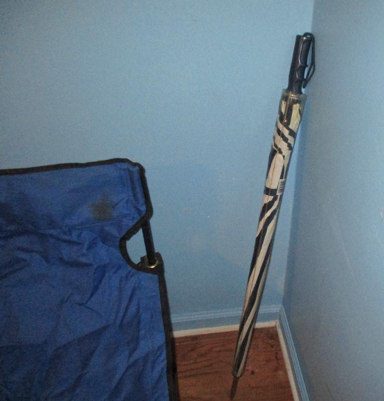 There is one spot on the upper right corner that shows up well in the picture, but I have a hard time seeing it out of the camera lens. The blue and white umbrella is in great shape and ready to keep you dry from the rain or cool from the sunshine!
