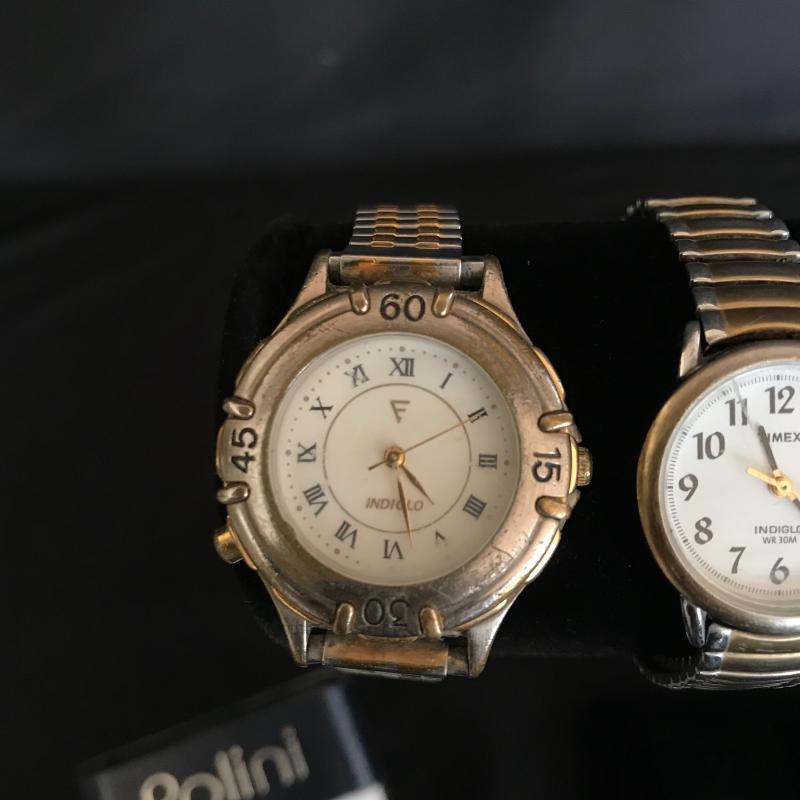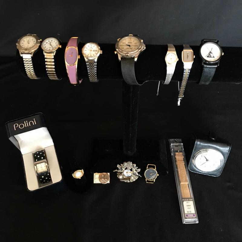 Fun collection of watches from Einstein to Seiko! Small ring watch tells time, while the pins are for fashion only. Lot also includes an unused tan wrist band, a lavender Geneva watch missing glass face cover, a large pocket watch with the ability to fold up like a wallet. See photos for entire inventory. Shipping available.
