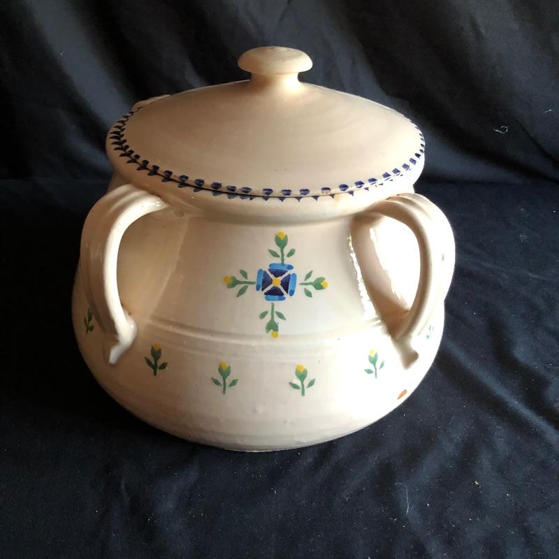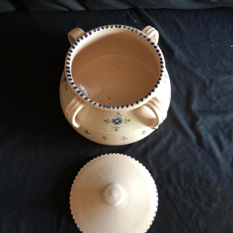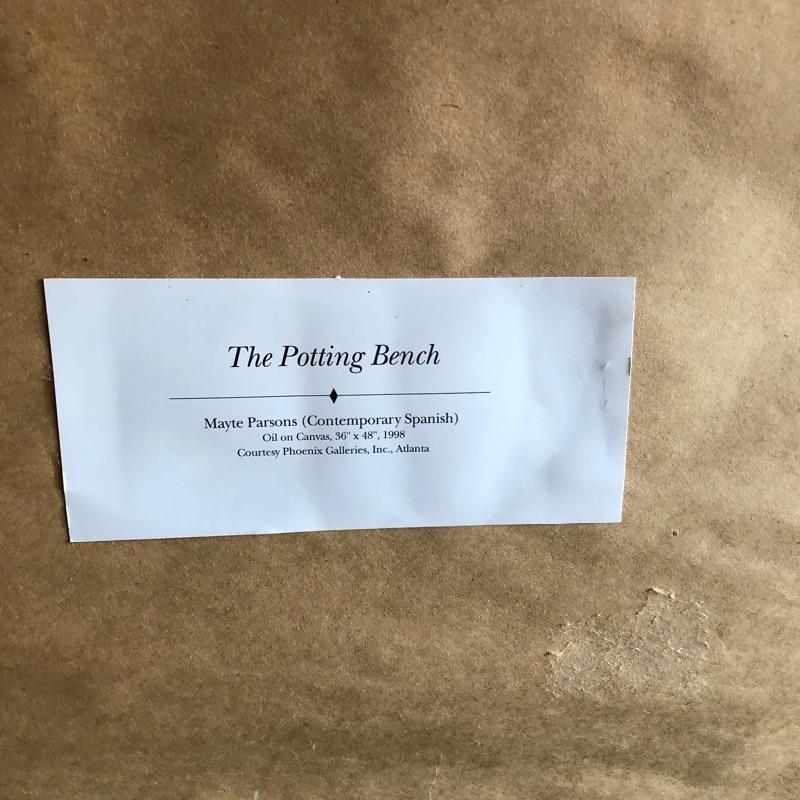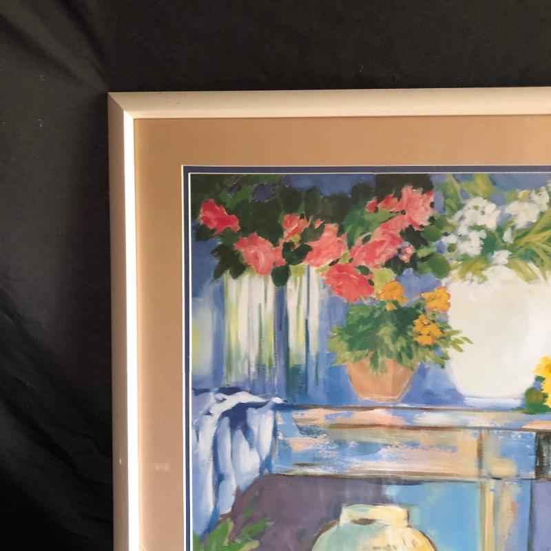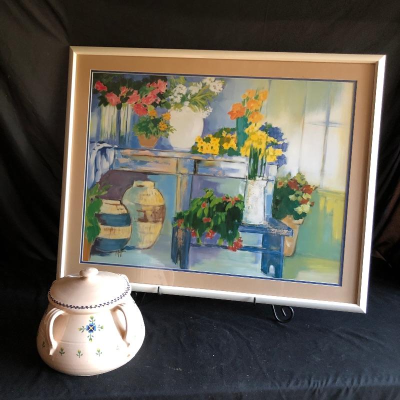 This gorgeous lidded Neiman Marcus ceramic urn is cream with delicate floral patterns; unfortunately it does have a crack in the lid and numerous chips that can be seen in the images. It measures approximately 12” wide x 8” tall. The large framed print is titled “˜The Potting Bench’ by Mayte Parsons. It is matted and mounted in a white, hard plastic frame that measures 36” x 28”.