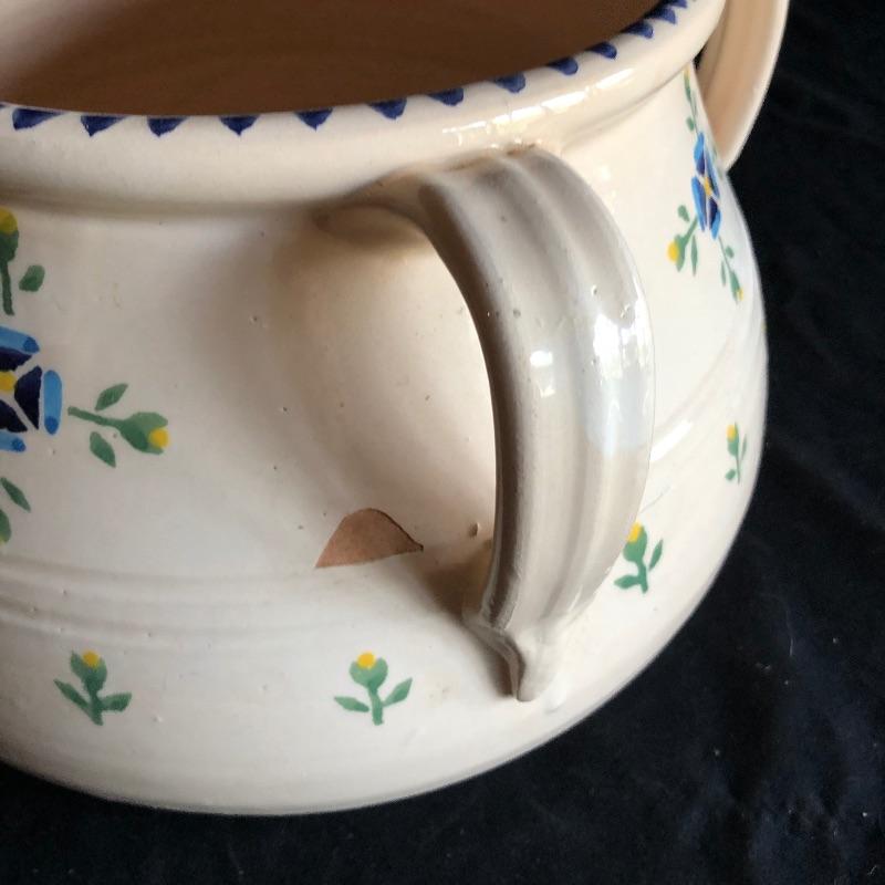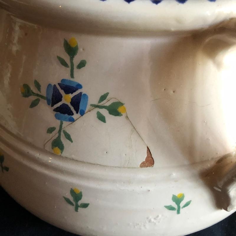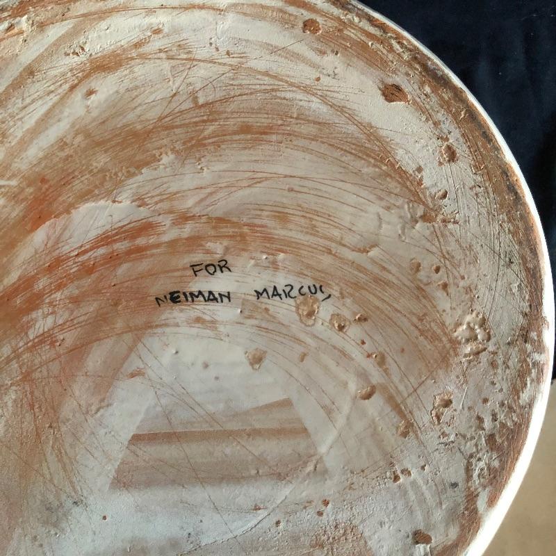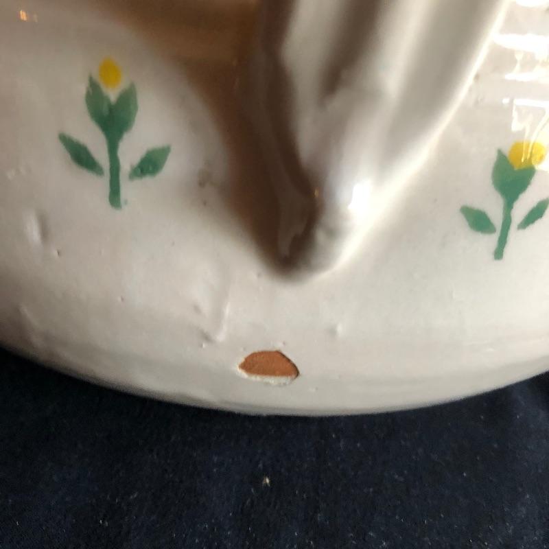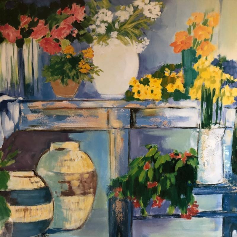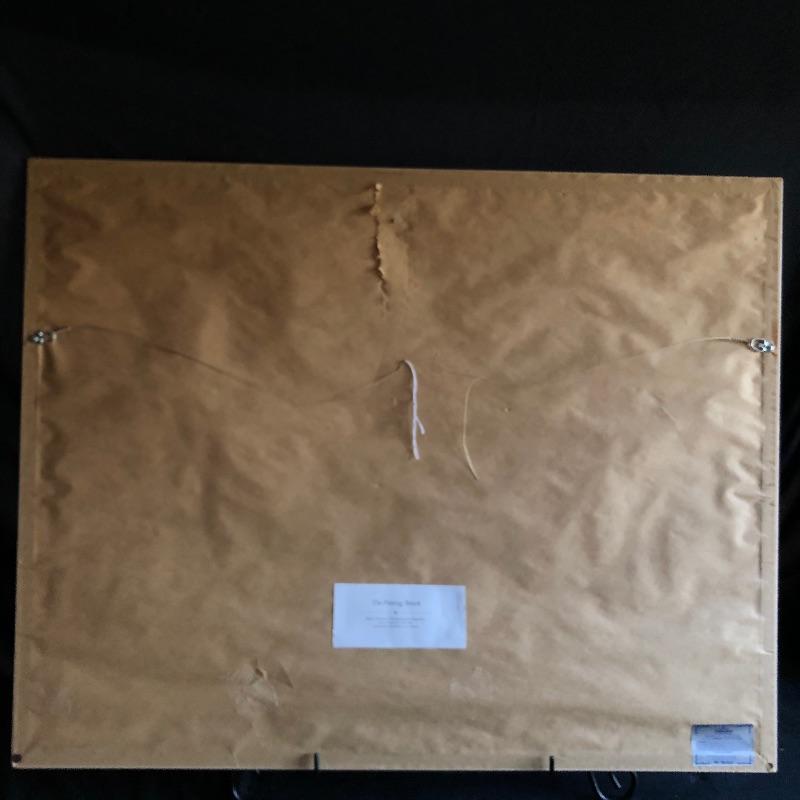 This gorgeous lidded Neiman Marcus ceramic urn is cream with delicate floral patterns; unfortunately it does have a crack in the lid and numerous chips that can be seen in the images. It measures approximately 12” wide x 8” tall. The large framed print is titled “˜The Potting Bench’ by Mayte Parsons. It is matted and mounted in a white, hard plastic frame that measures 36” x 28”.