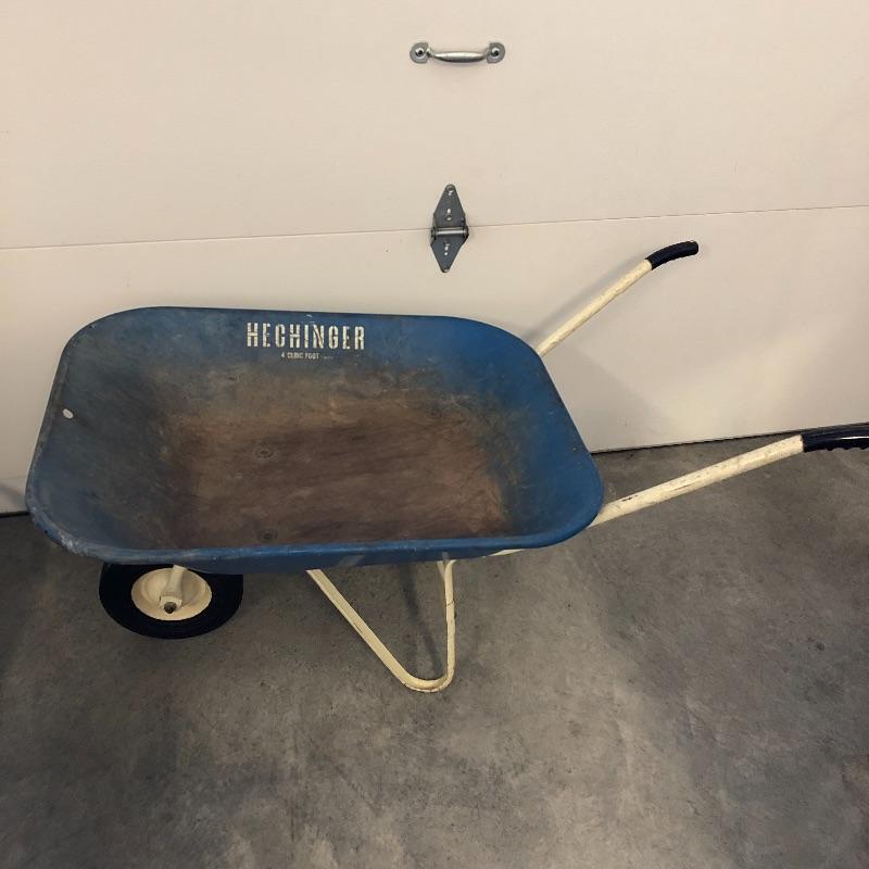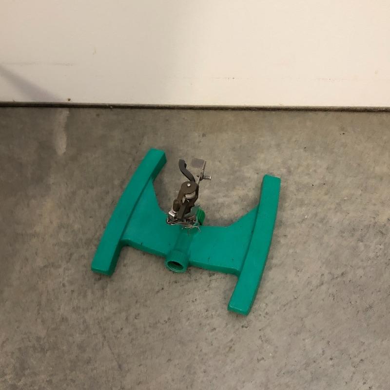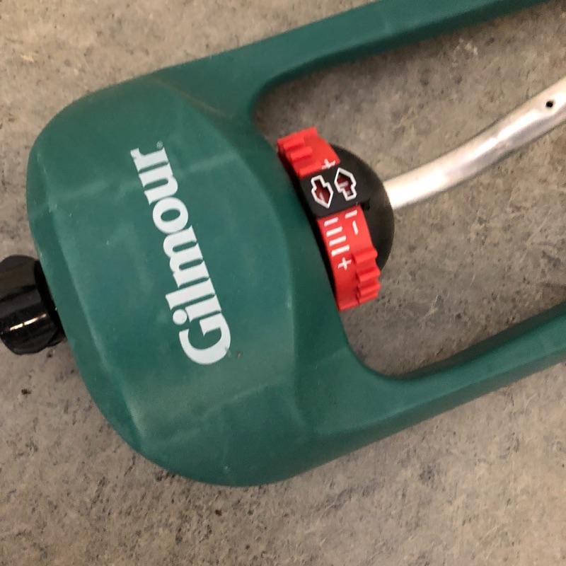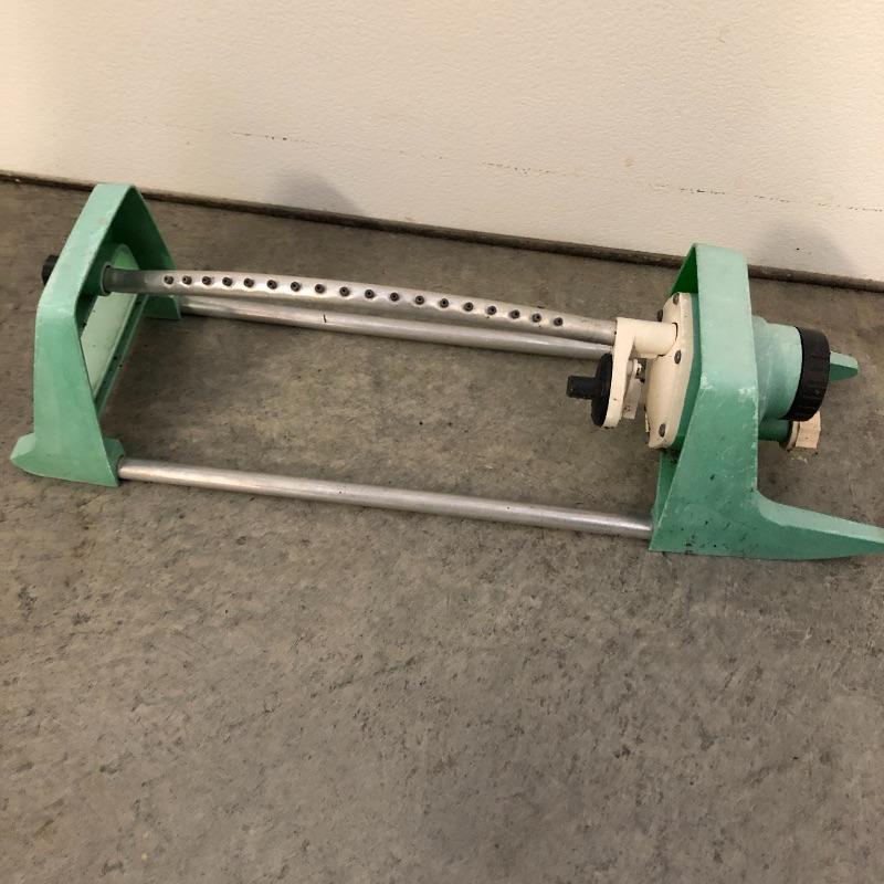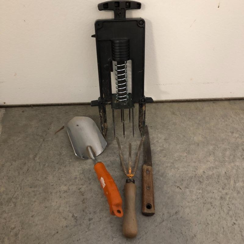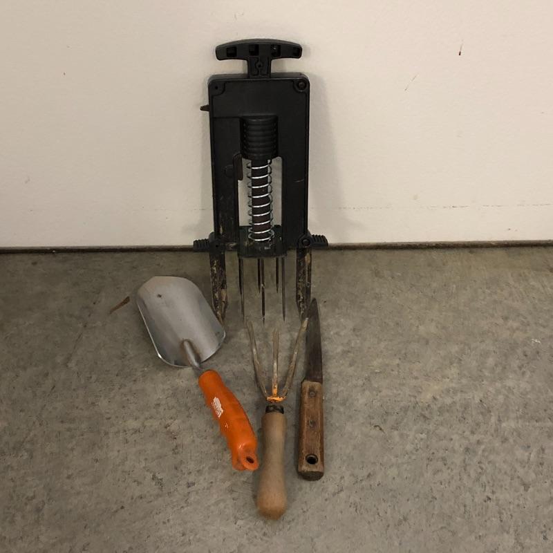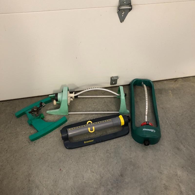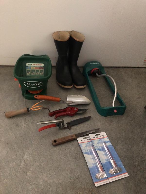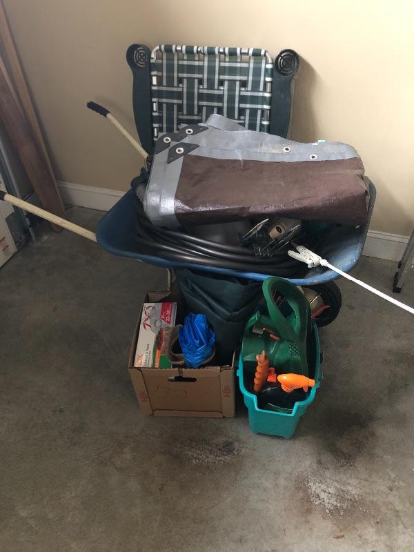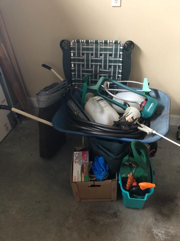 This lot contains everything you could want for your gardening needs. It has a large blue wheelbarrow that holds four cubic feet of material; a hose; four sprinklers of varying brands; gardening tools such as shears, a bulb planter, a mini shovel, and a mini forked shovel; two pesticide sprayers; and two lawn chairs in great condition. Local pickup only.