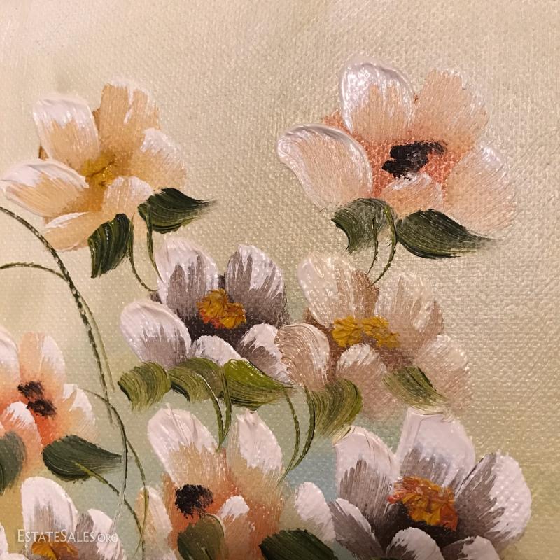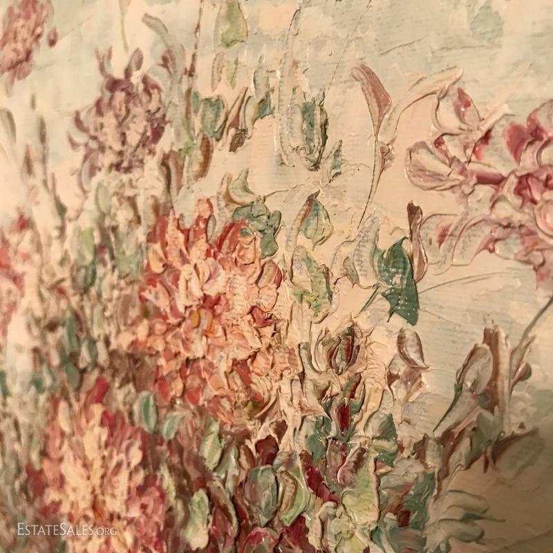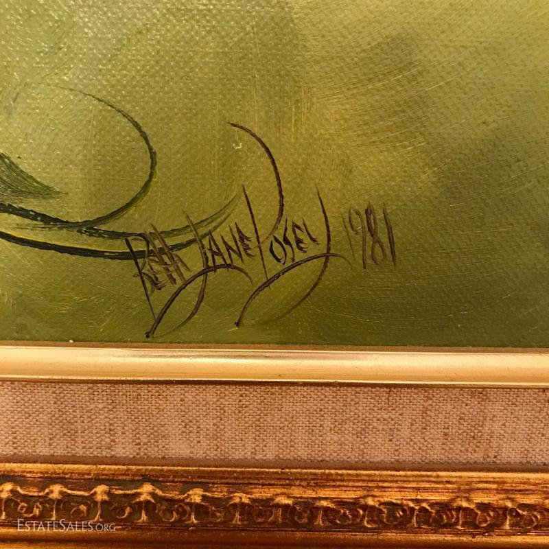 Two gold-framed signed oil paintings with rich texture. Smaller one is 20.5"l x 16.5"w with predominant hues of turquoise and mauve. Illegible signature (see photo). Larger painting is signed by Beth Jane Posey (1981) with predominately green and gold hues. 25.5"l x 21.5"w.