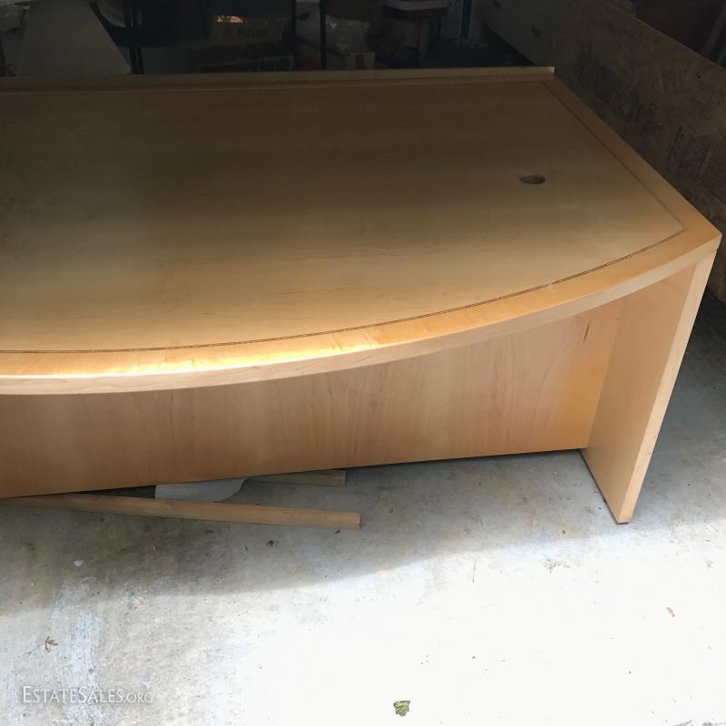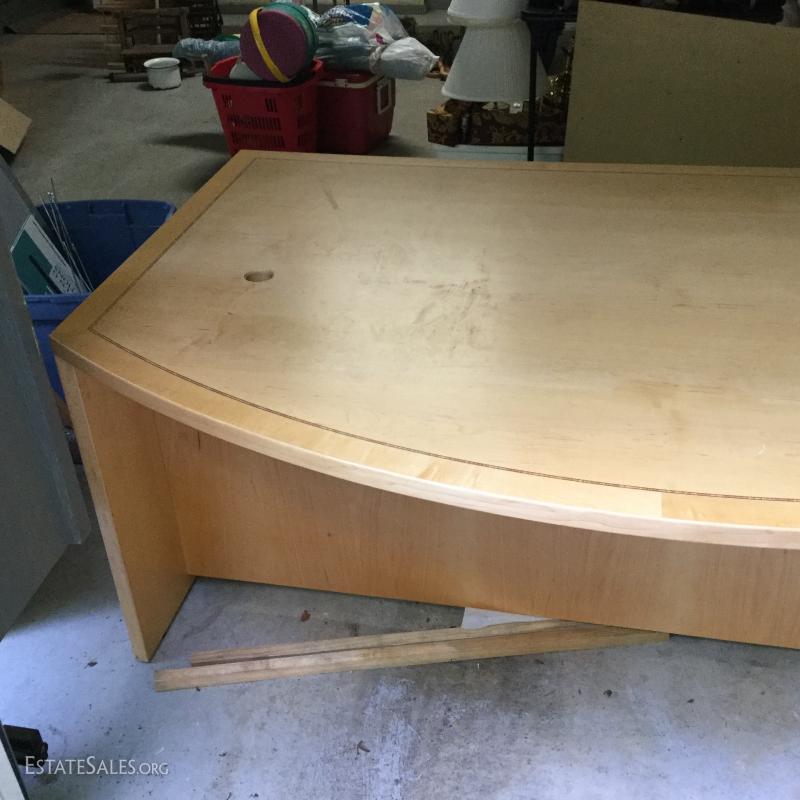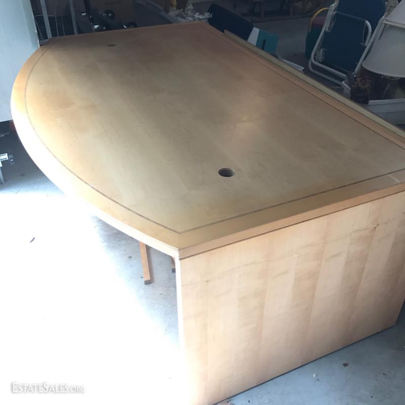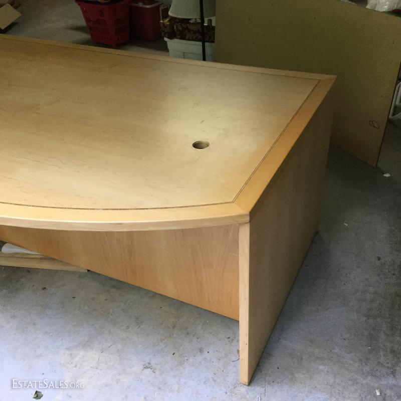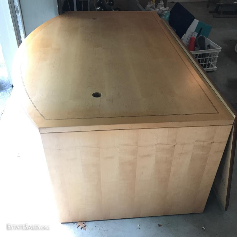 Beautiful sturdy maple colored desk with inlay. Rounded front with holes for media or lamp wires. In excellent condition with just one corner a bit worn. See photos. Large size, 71"w x 45"l x 28"h.