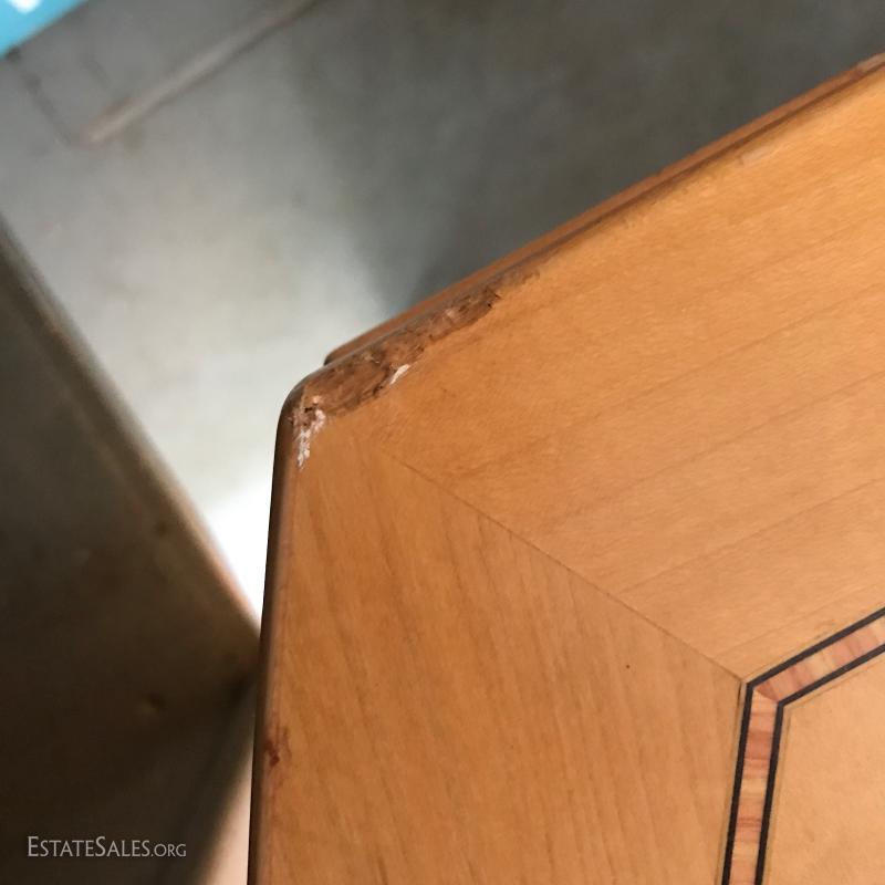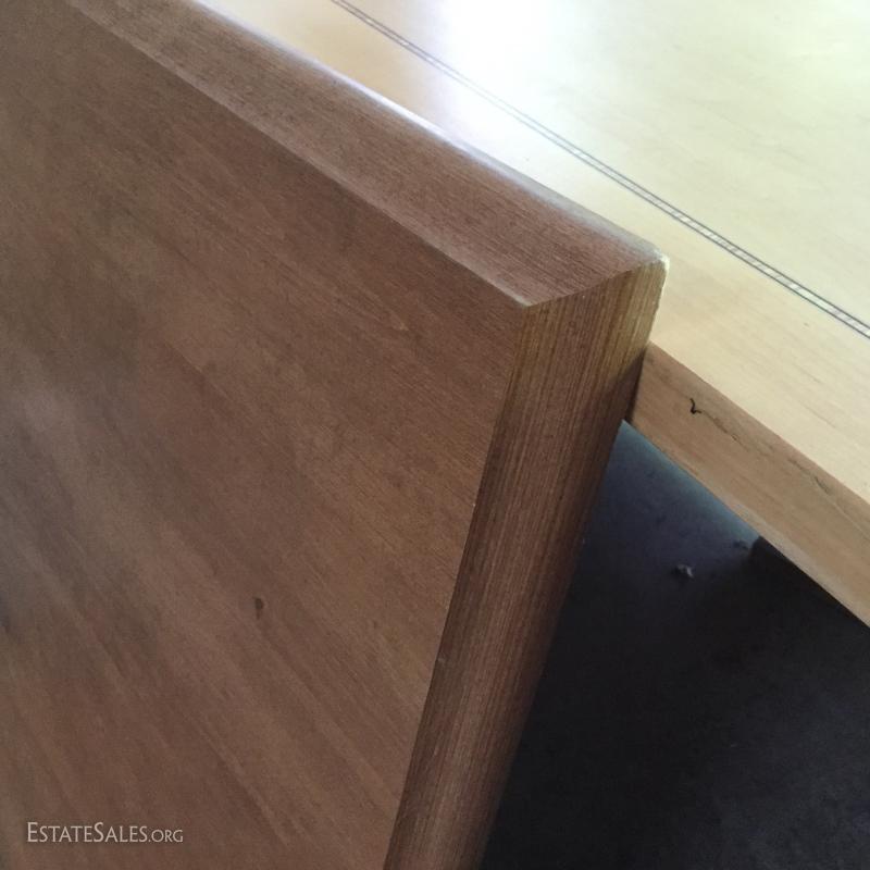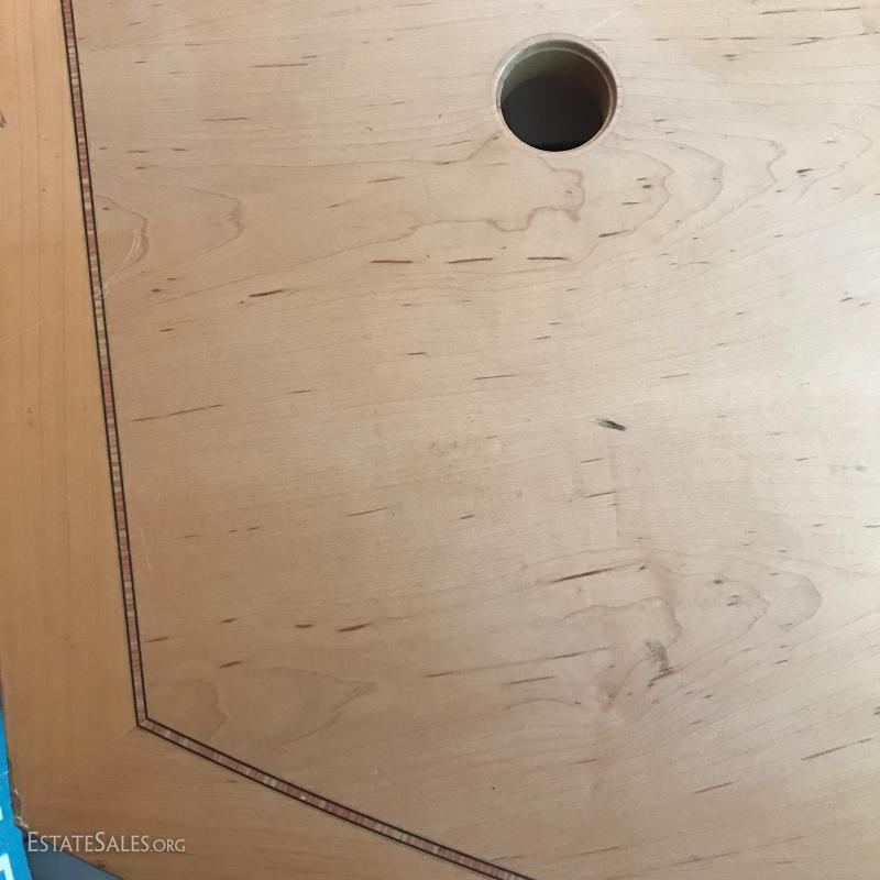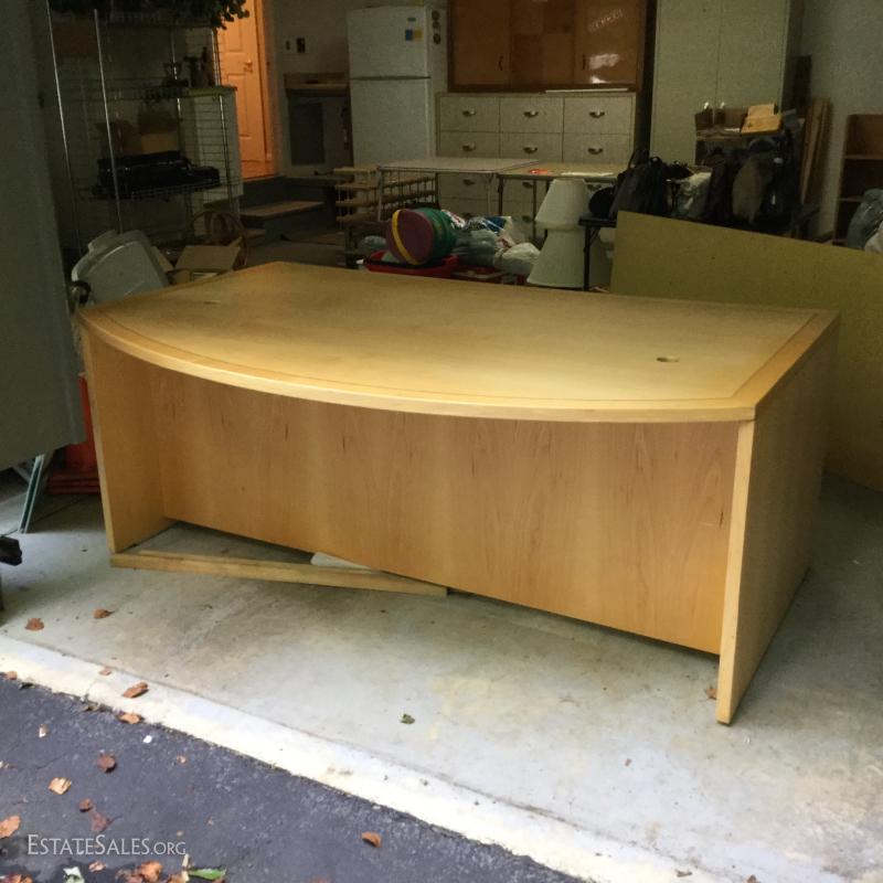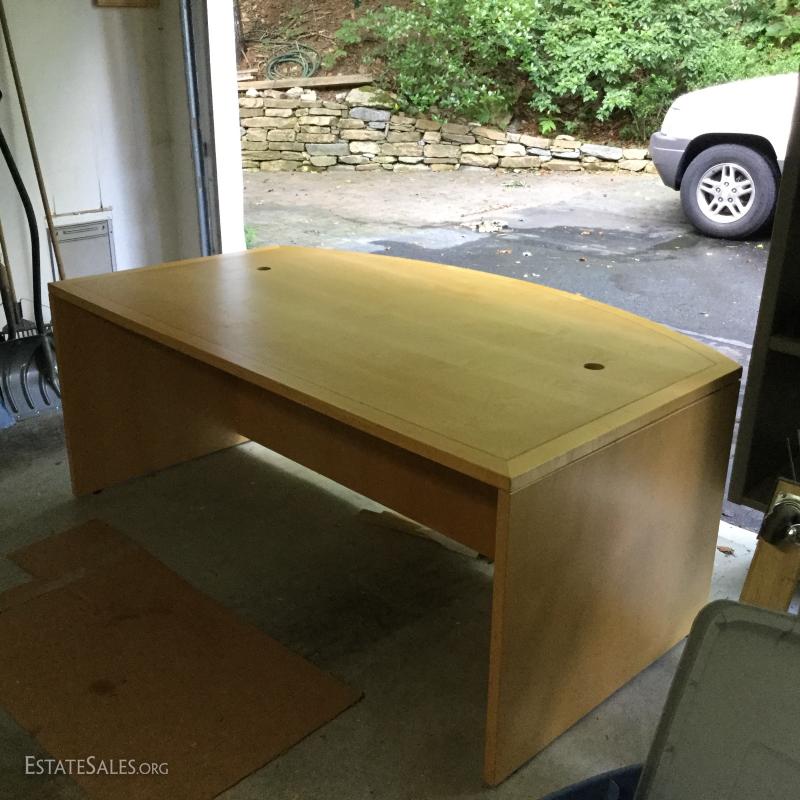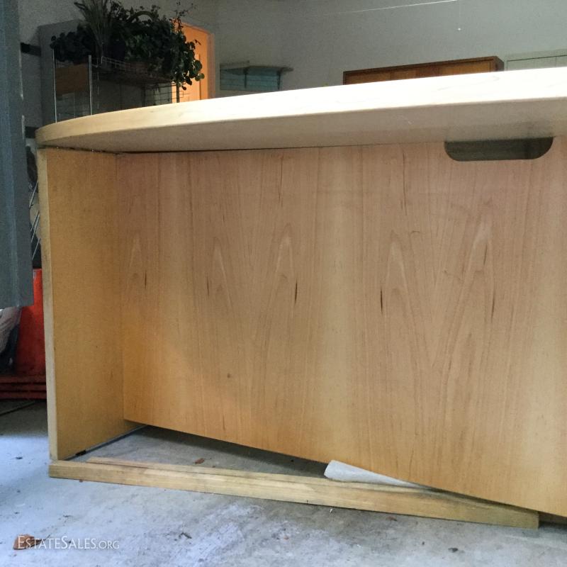 Beautiful sturdy maple colored desk with inlay. Rounded front with holes for media or lamp wires. In excellent condition with just one corner a bit worn. See photos. Large size, 71"w x 45"l x 28"h.