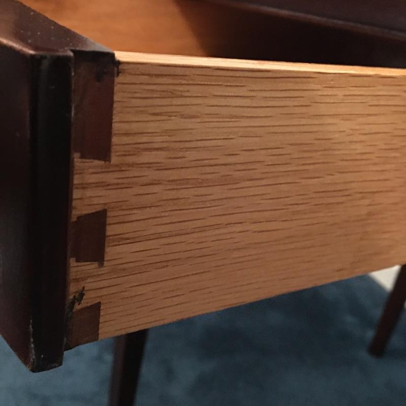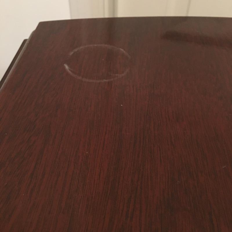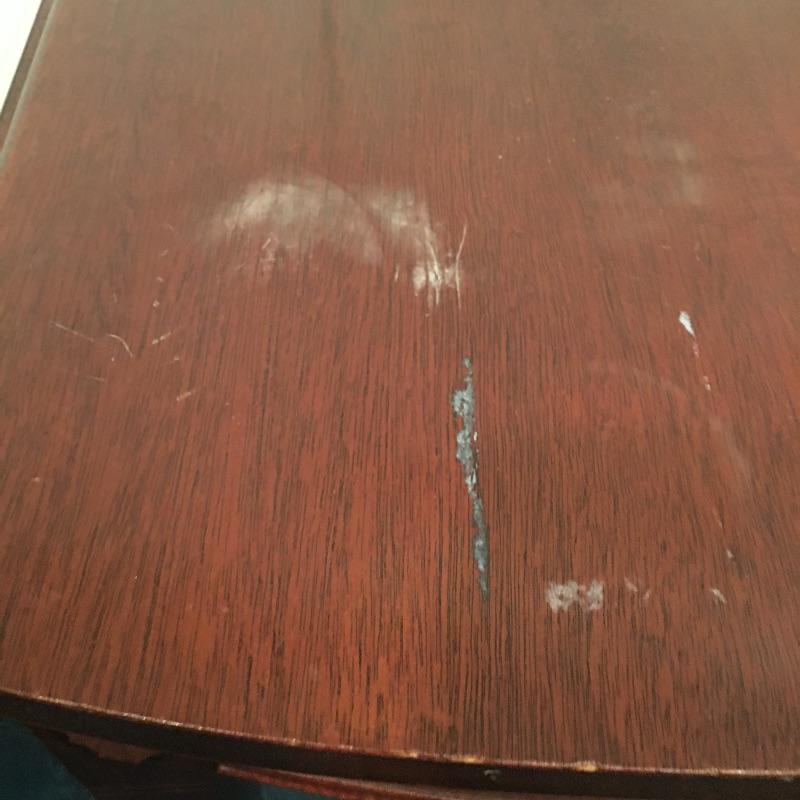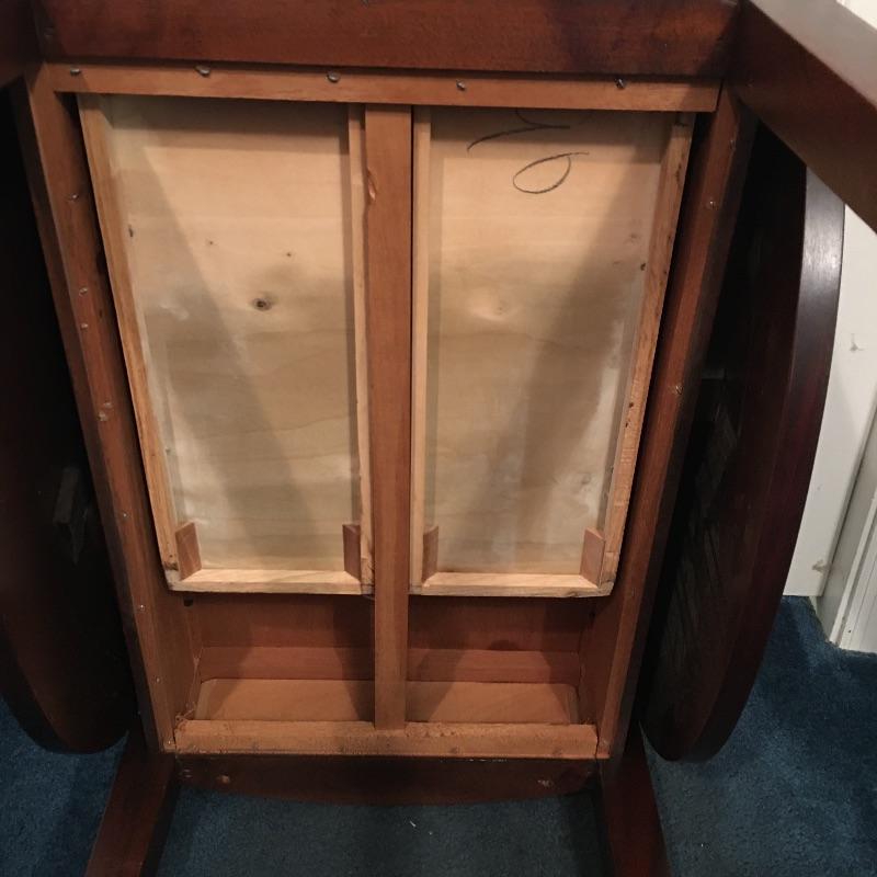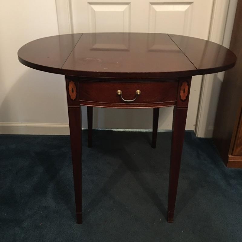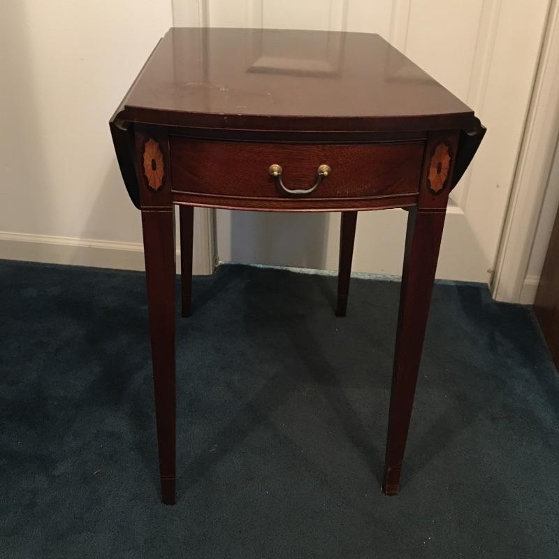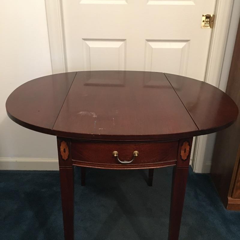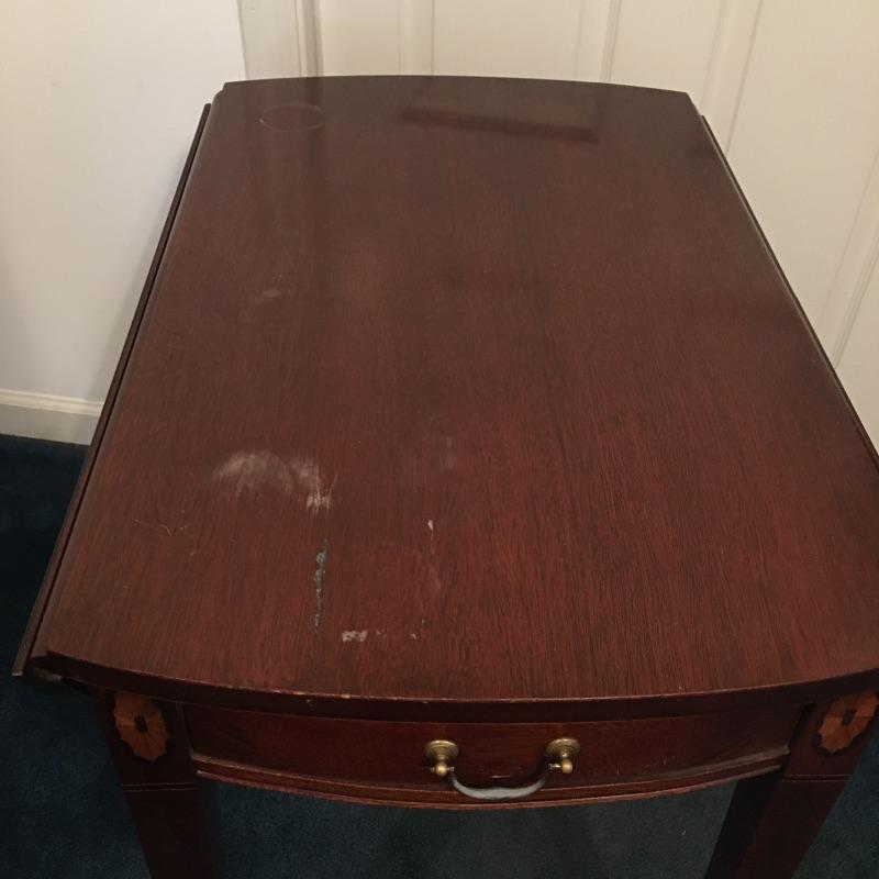 Table measures 19.25” x 28” x 27.75” when closed and 34.5” x 28” x 27.75 when leaves are open. Table has water rings and a few scratches, see pictures.