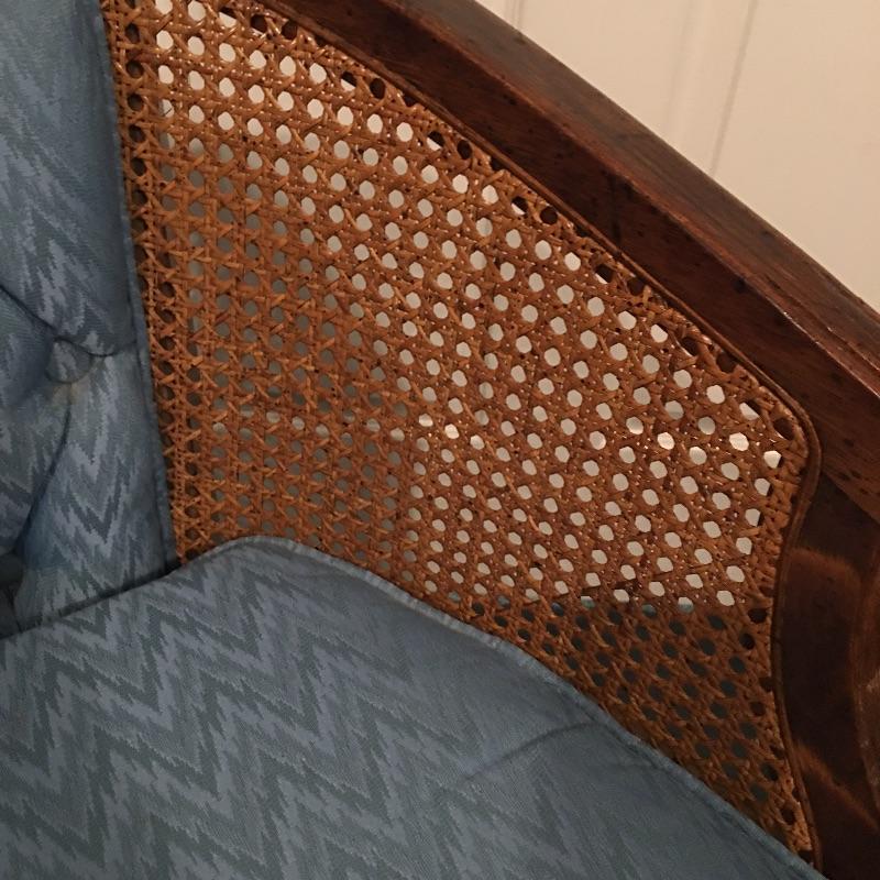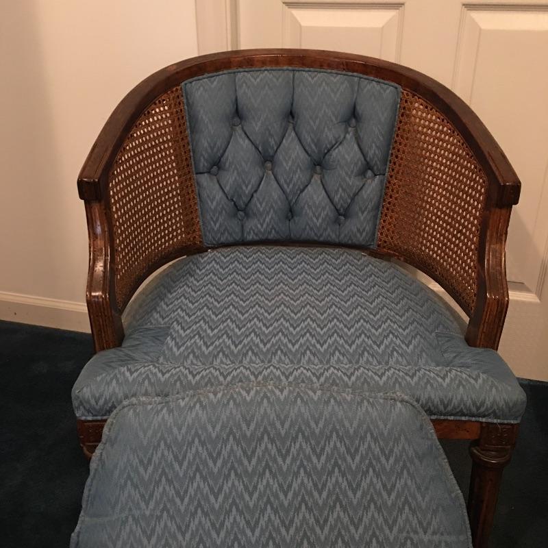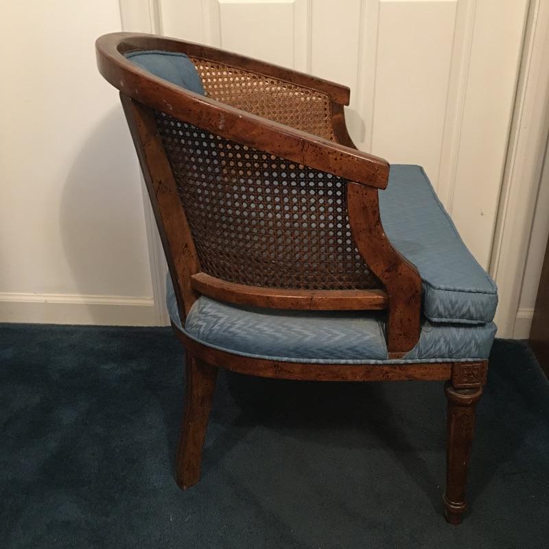 This stunning James River Plantation Pembroke drop leaf table by Hickory Chair Company has one dovetailed drawer and two drop leaves. Also includes one wooden and fabric armchair with woven cane on the sides.