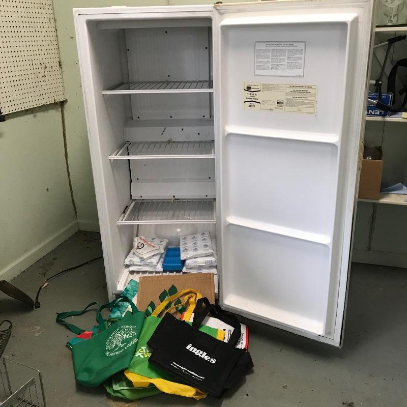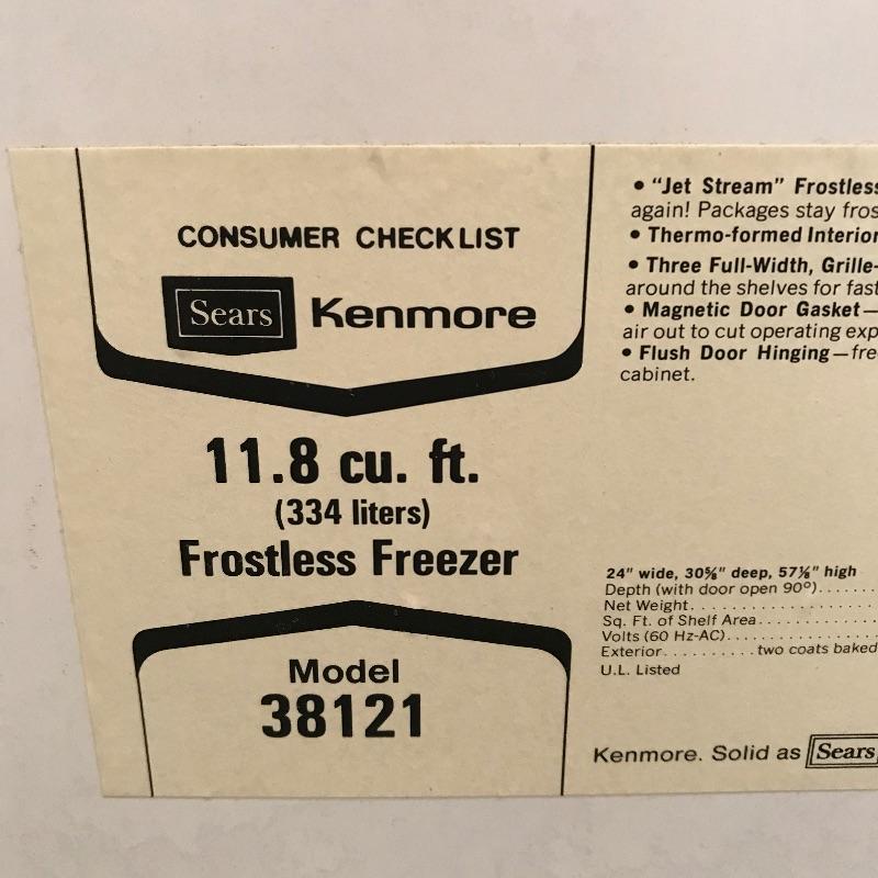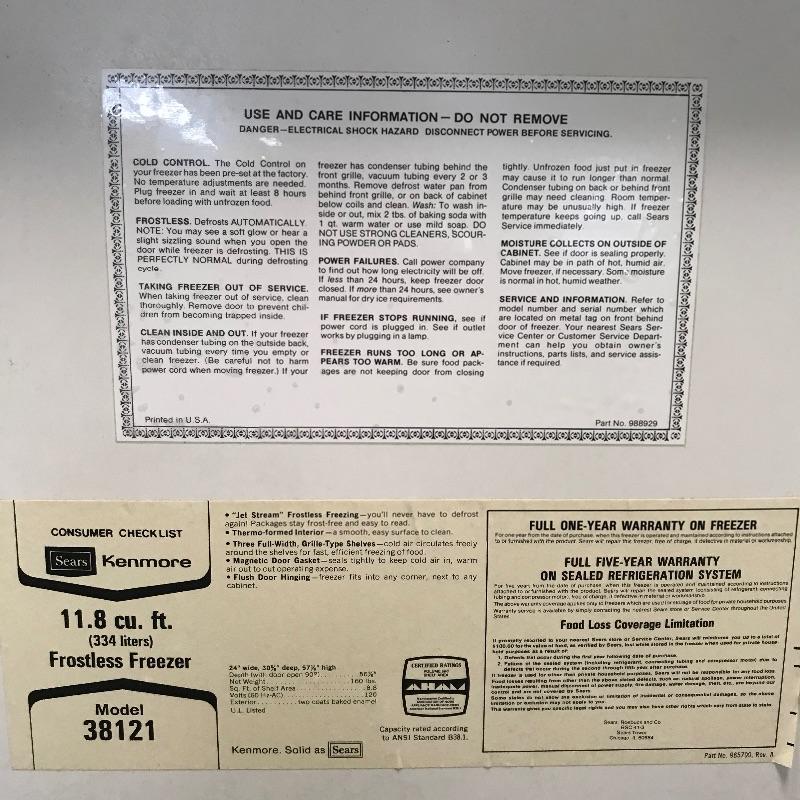 Sears Kenmore 11.8 cu. ft. Frostless Freezer model 38121. Freezer works great and even comes with a small collection of freezer packs. Freezer has three fixed shelves and measures 24” x 30.25” x 57.25”. Need to load up on goods for your new freezer? Why make six trips with twenty single use bags? Lot also contains about six reusable grocery bags including a wine bottle bag. See photos. No shipping. Bring help to load. Freezer is conveniently located in garage off driveway. Black Ingles bag is not included in lot.