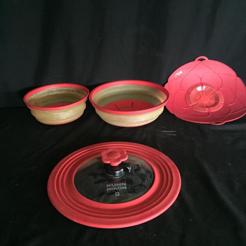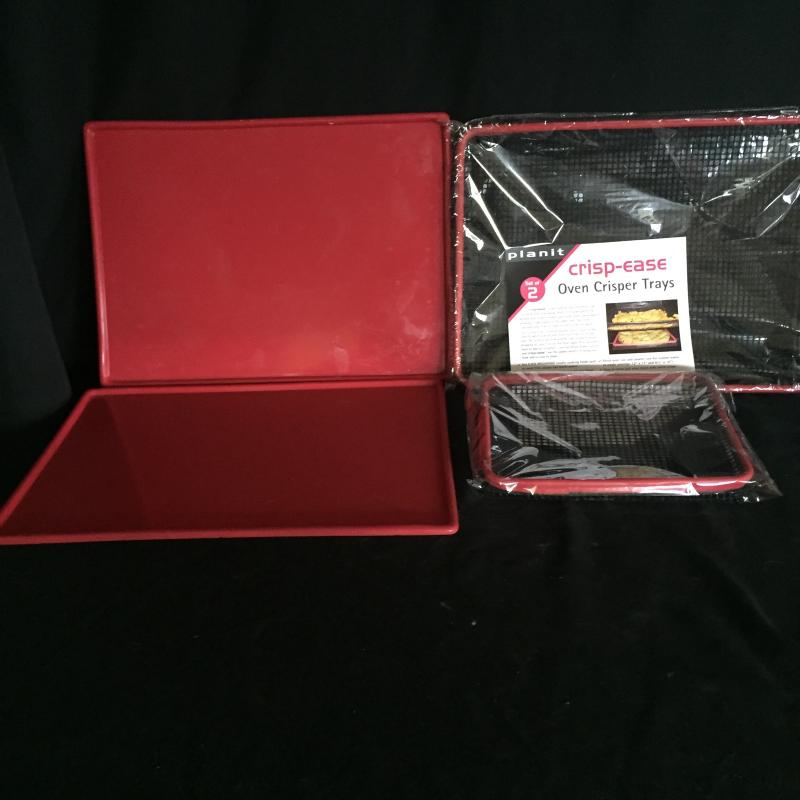 Kitchen Gadgets.Collapsible Colanders,Collapsible Dishes,Microwaveable Hot Plates,Oven Crisper Trays and More. Red Rectangular Trays Measure 17.5” x 12”.