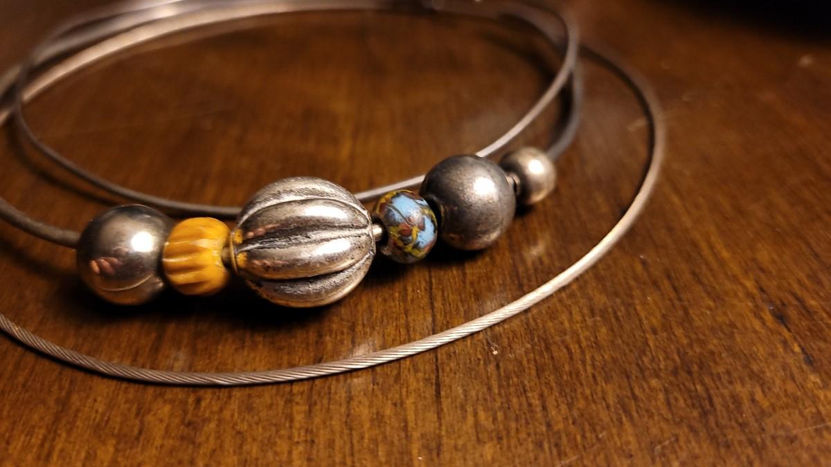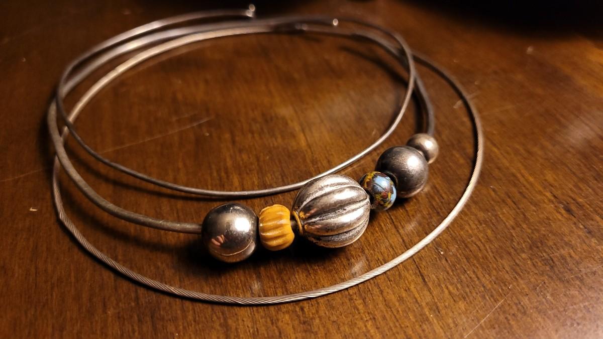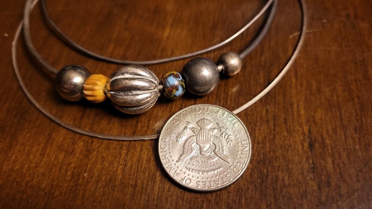 This lot features (3) Beautiful Handmade Choker style Necklaces. The industrial rope style selection has a .925 Sterling Mark on Clasp so it is assumed the rope portion is Sterling as well. The silver balls on the other selection are assumed to be Native American Beads. The multicolored bead is indicative of an authentic vintage Handmade creation. The finger hook clasp selection does not have any Markings and is assumed to be stainless. Openings rangee from 4.5" to just over 5". Half Dollar has been added to one of the photos for scale (not included in the auction).