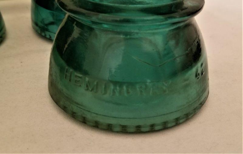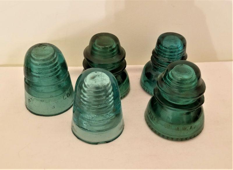 You get what you see here - 5 vintage colored glass insulators - one has a chip to the bottom rim. Marked "Hemingray #40" 4" tall.