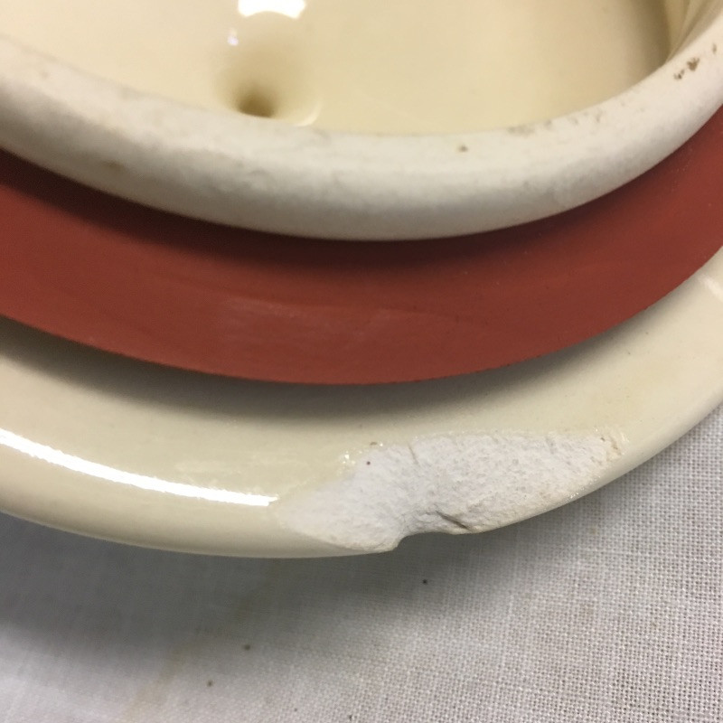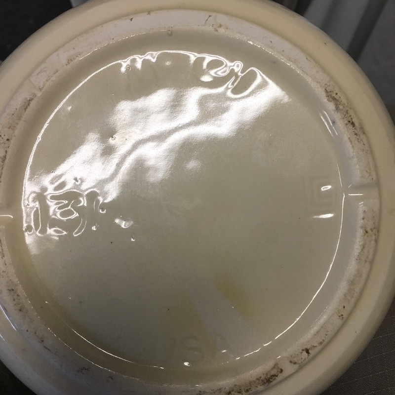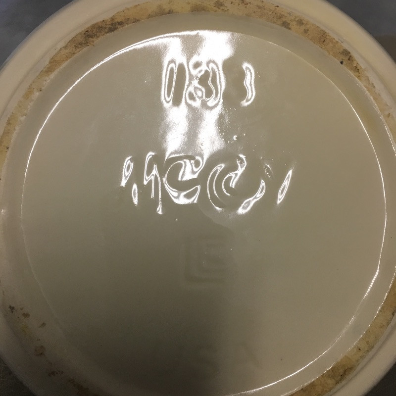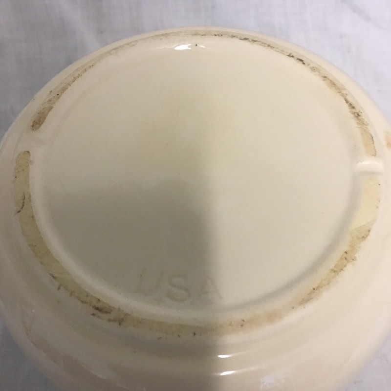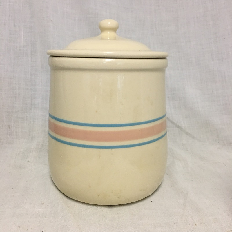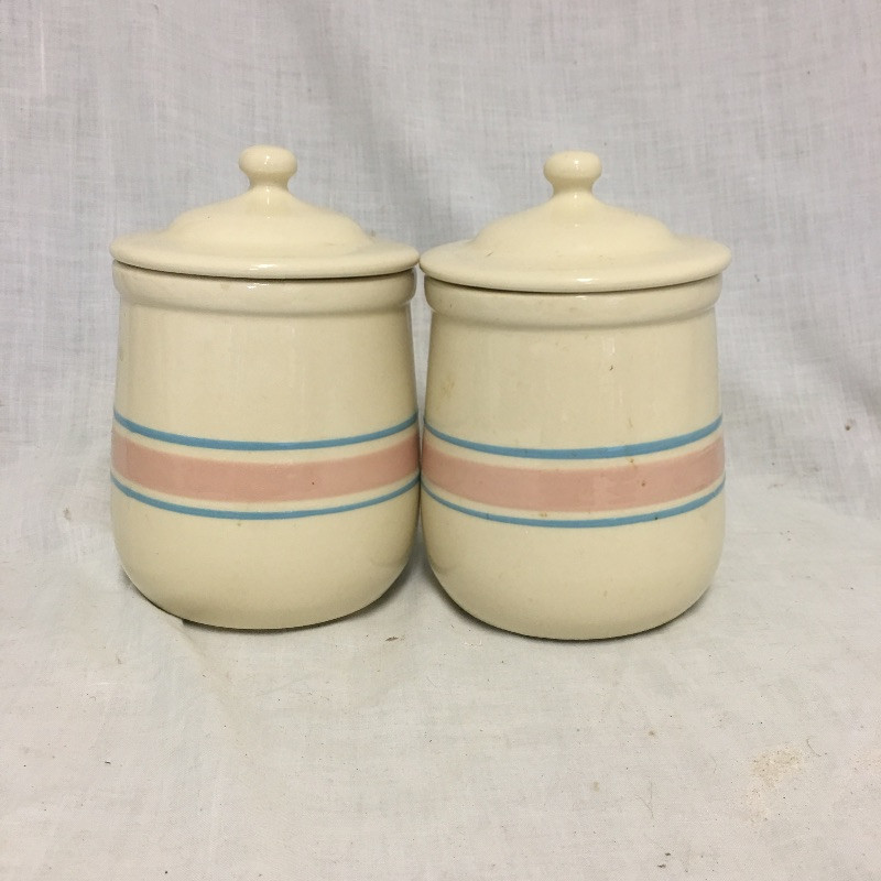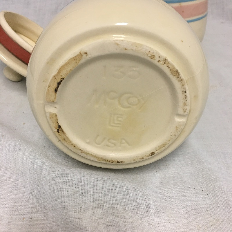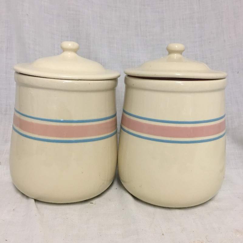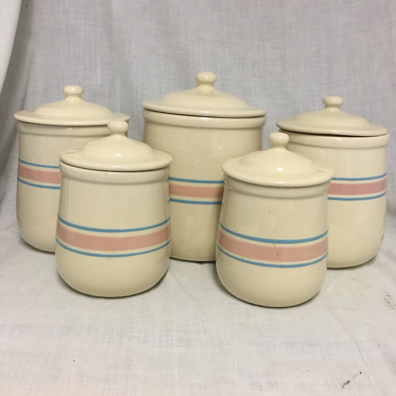 These five cream canisters come with baby blue and pink stripes and with tops. Included are # 133, two # 135 and two # 131. Four are signed McCoy and one is unsigned and one has chip on lid, see images. Largest canister measures 7”D x8” tall. These canisters match the collection in Lot #254.