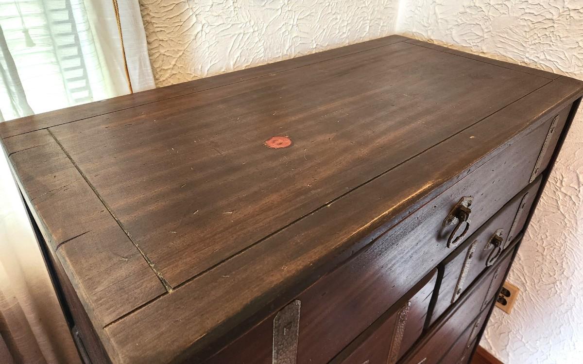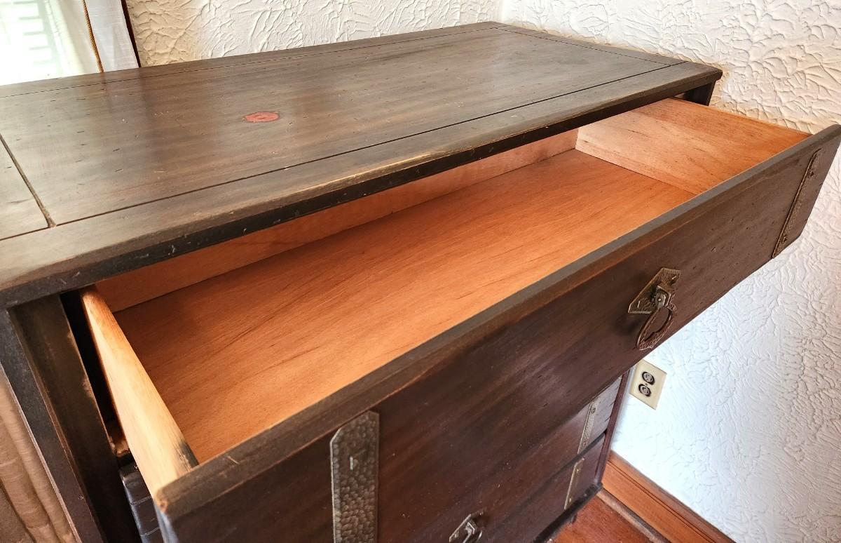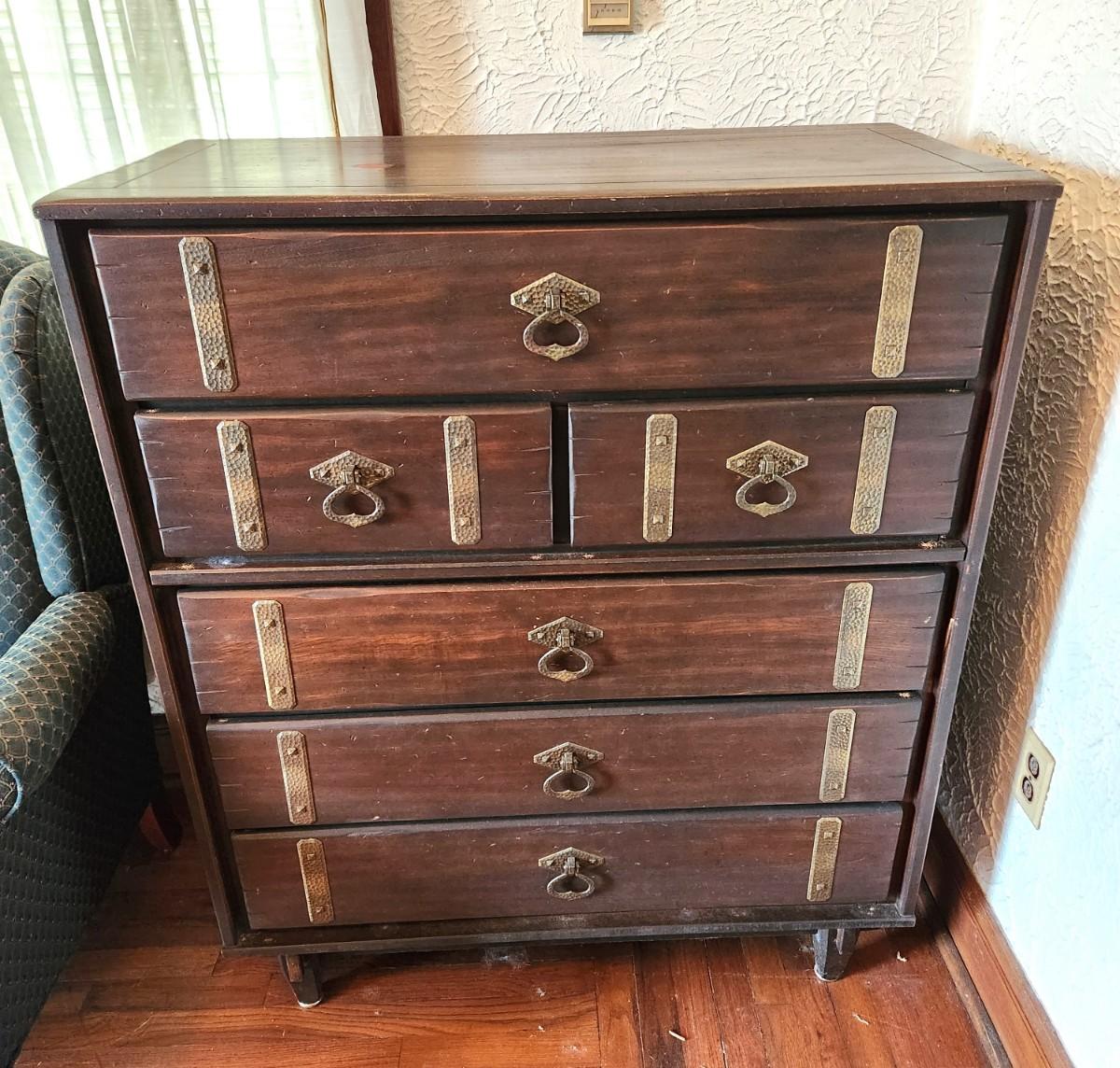 Vintage Mediterranean Style Chest of drawers - heavy - 6 drawers, heavy metal pulls. No maker noted. 1970's. 38" across, 19" deep, 46" tall. Vintage condition - some wear.