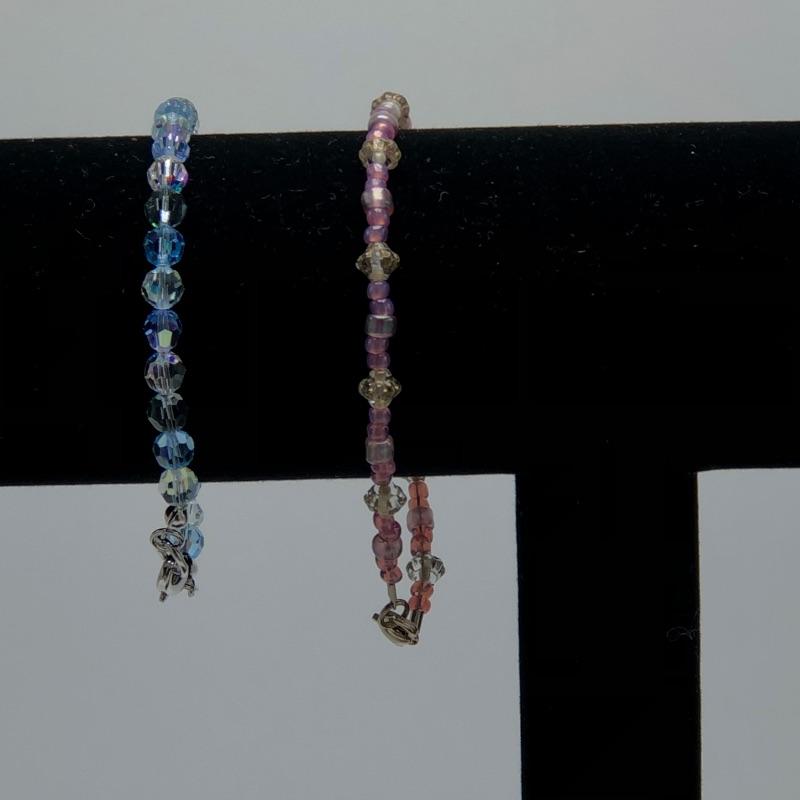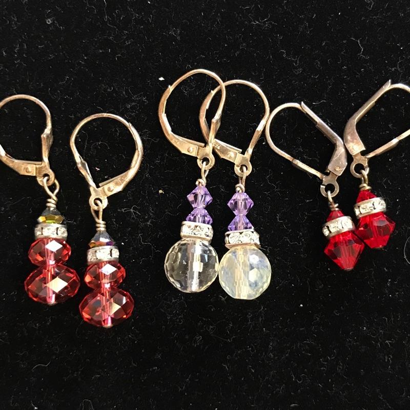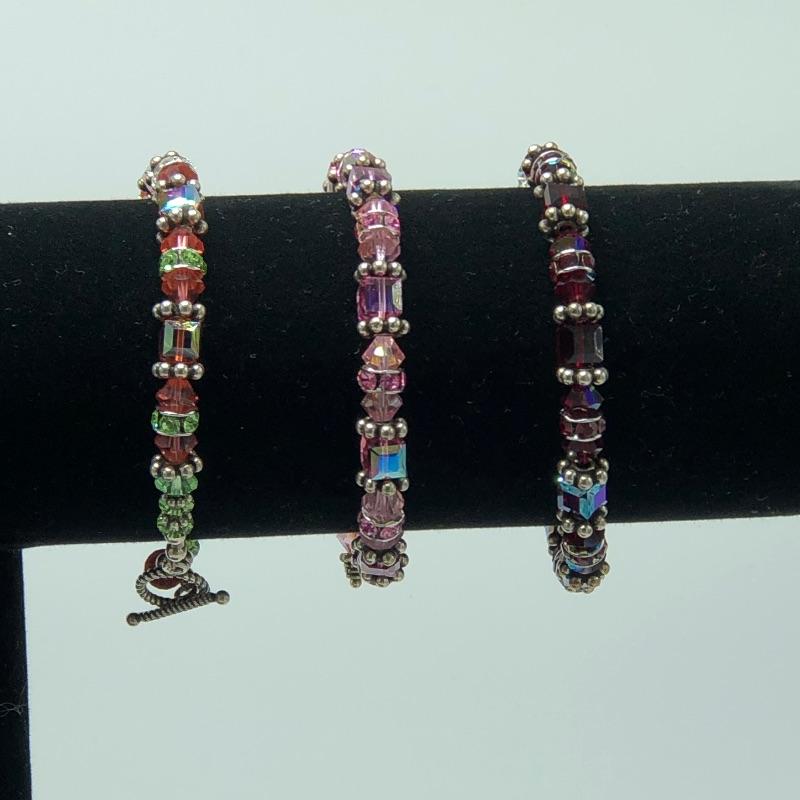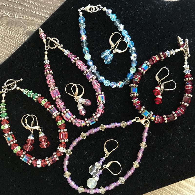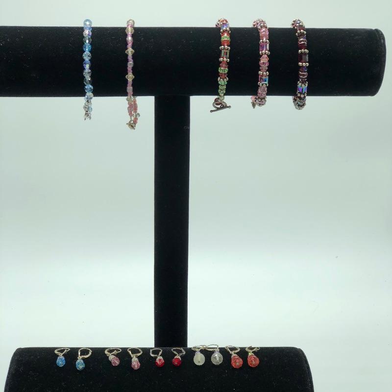 5 nice pairs of sparkle earrings(one marked 925) with five jewel toned sparkle bracelets. The purple one is not a perfect match but the rest are the same beads and colors. What a fun set to mix and match with lots of color.