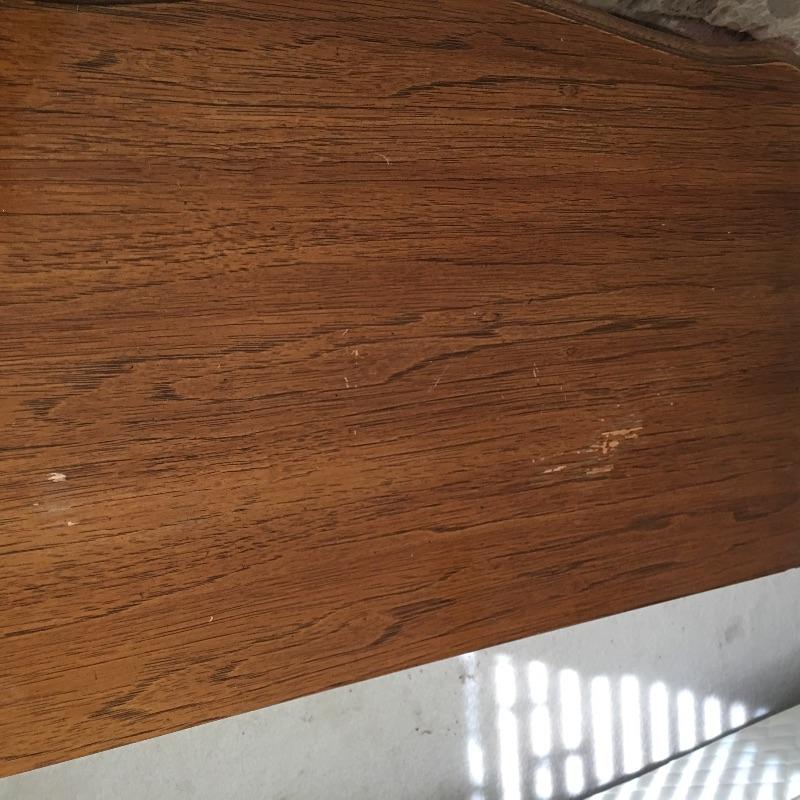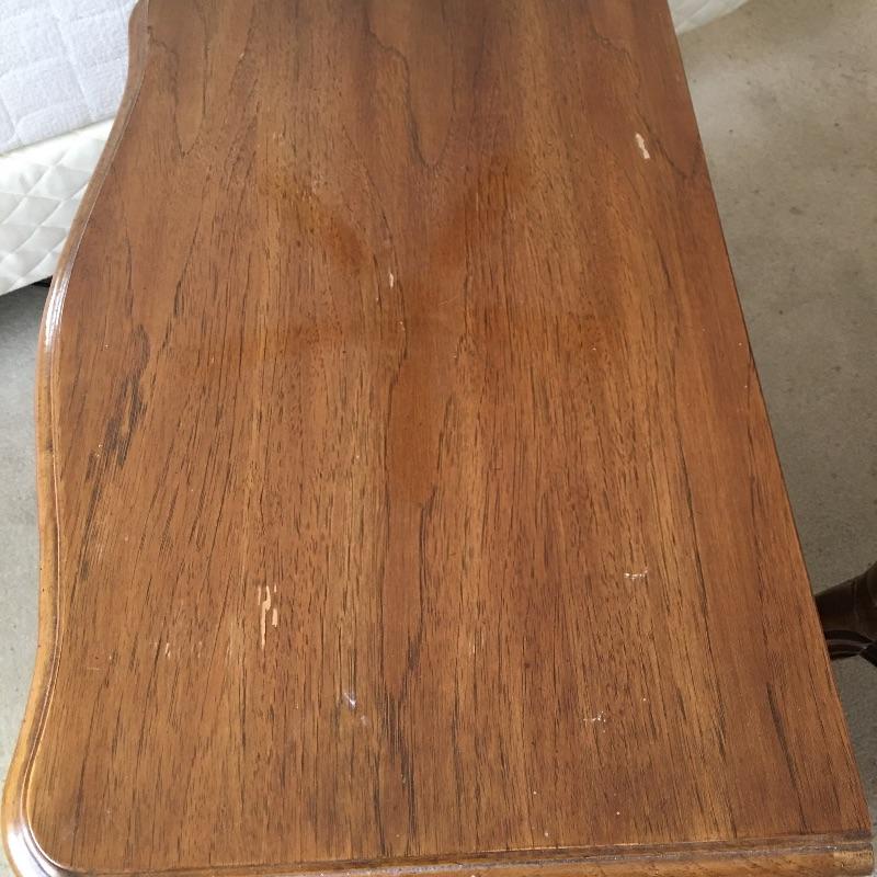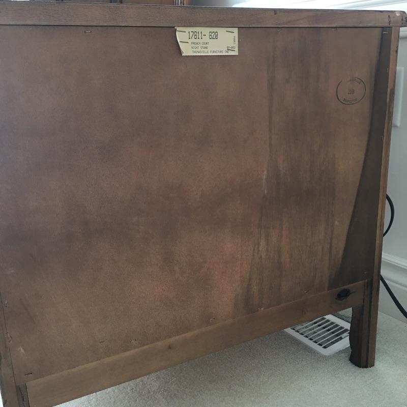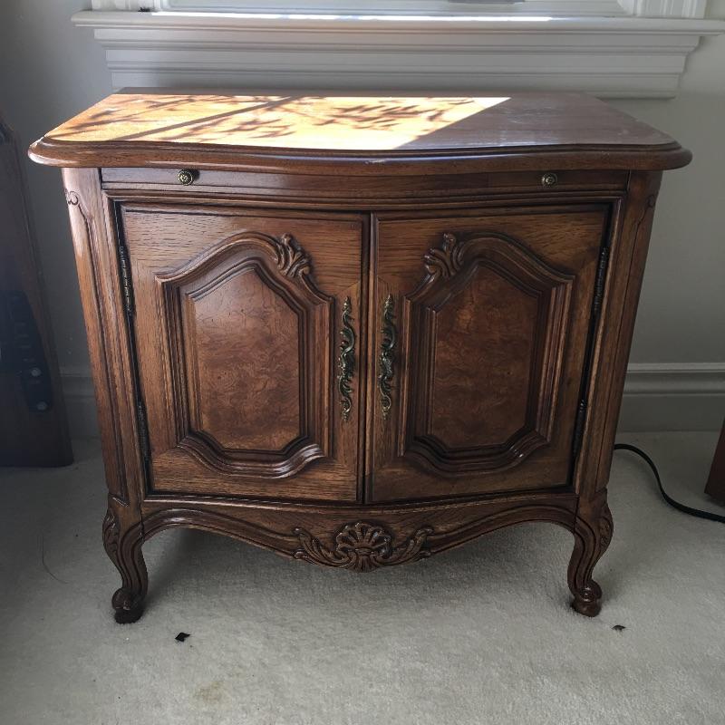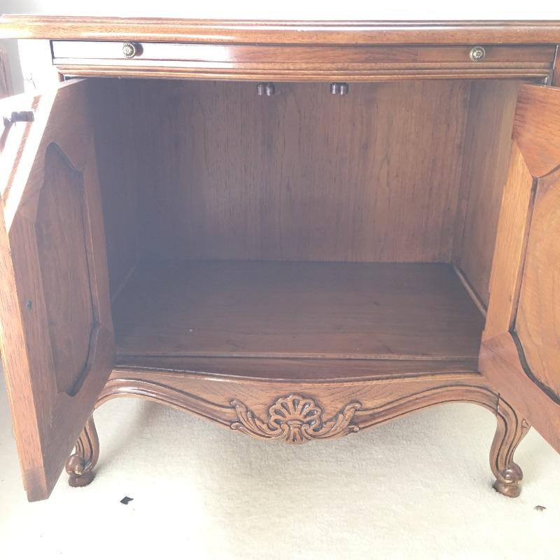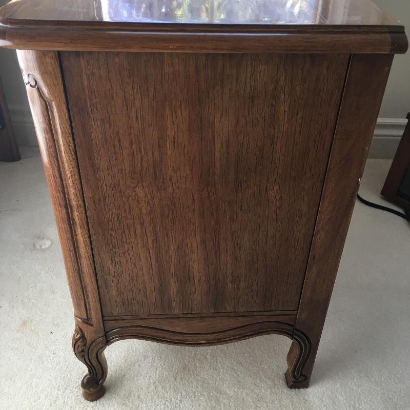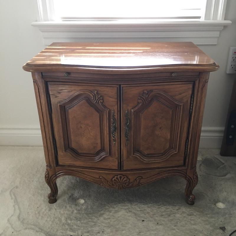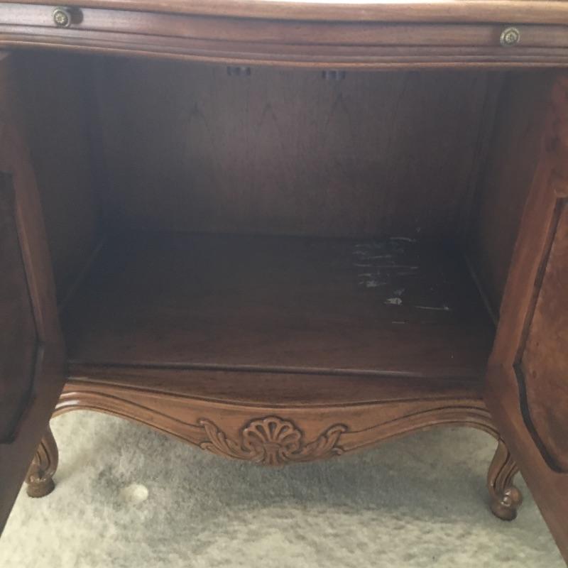 Pair of Thomasville end tables. End tables have two doors and pullout tray. Both end tables have some defects on top and one has what appears to be paper stuck on shelf, see pictures. Photo has a sun reflection on top. End table matches lots 123, 126 and 133. End tables measure 16” x 27” x 26”.