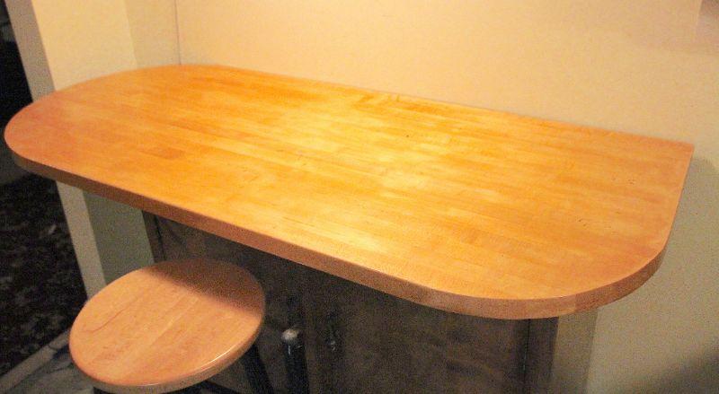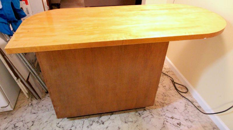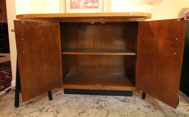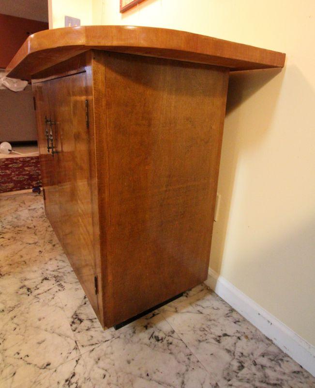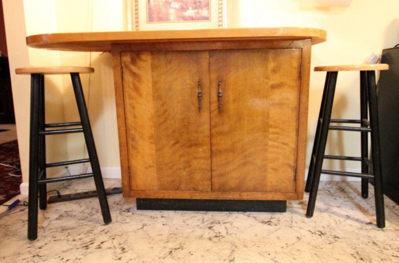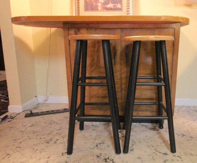 Heavy duty marine wood construction. 60" w x 36" h x 25" d. Storage underneath. Stools are wood and not originl to cart. 30" h x 16" w. Cart is in vintage used condition.