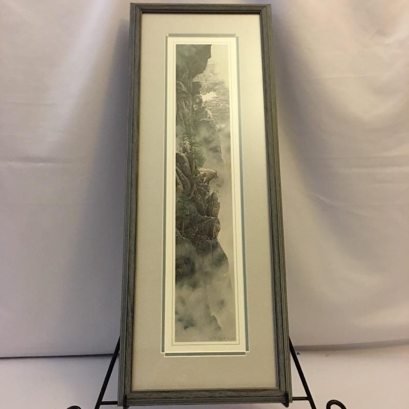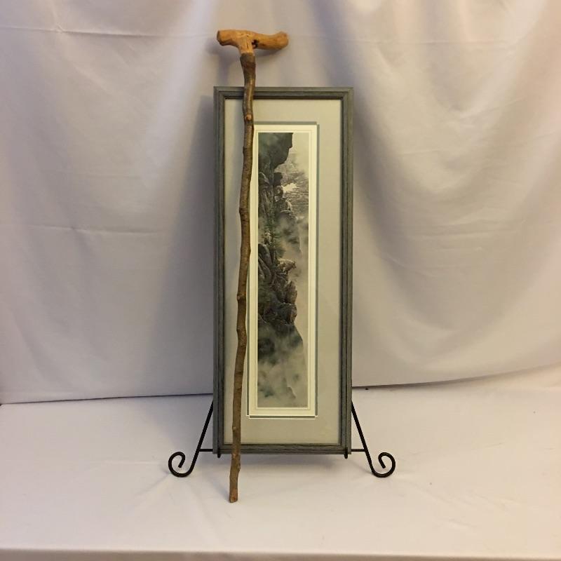 Rod Frederick framed, matted, signed and numbered print titled “High Society” and a wooden walking stick. A beautiful print of Montana mountain goats and a walking in case you decide to go check out the goats in person. Frame measures 12” x 31.75”. Picture frame stand not included.