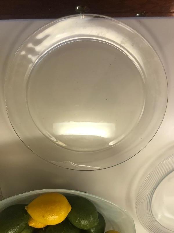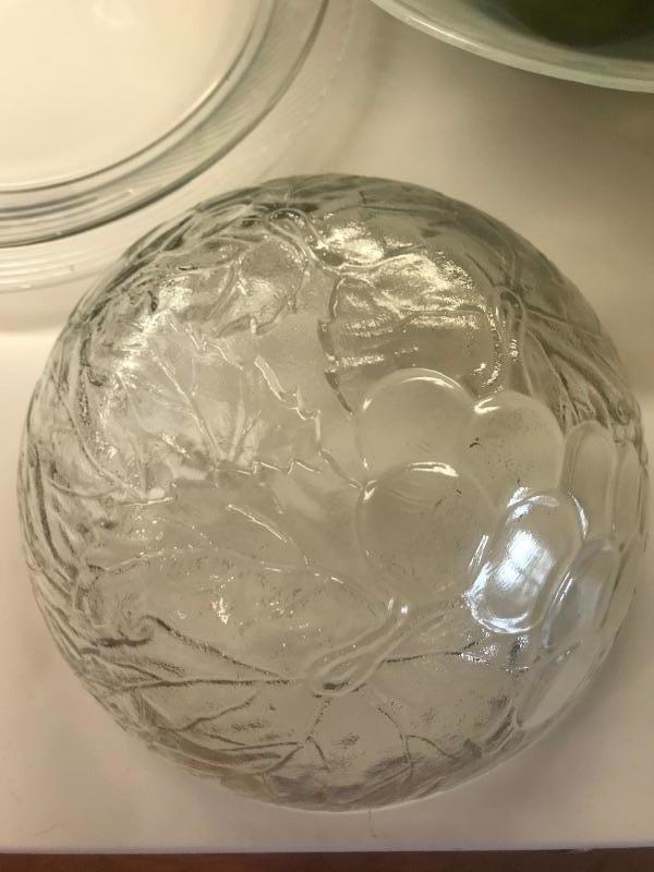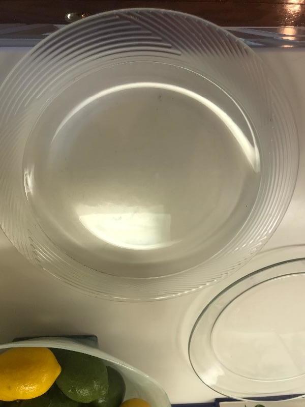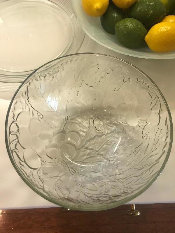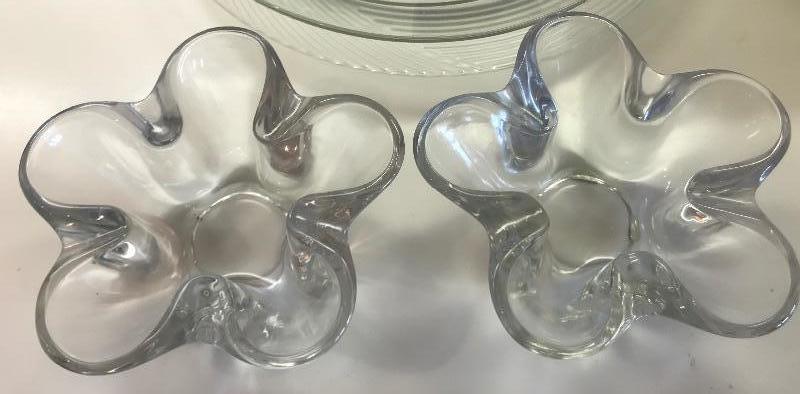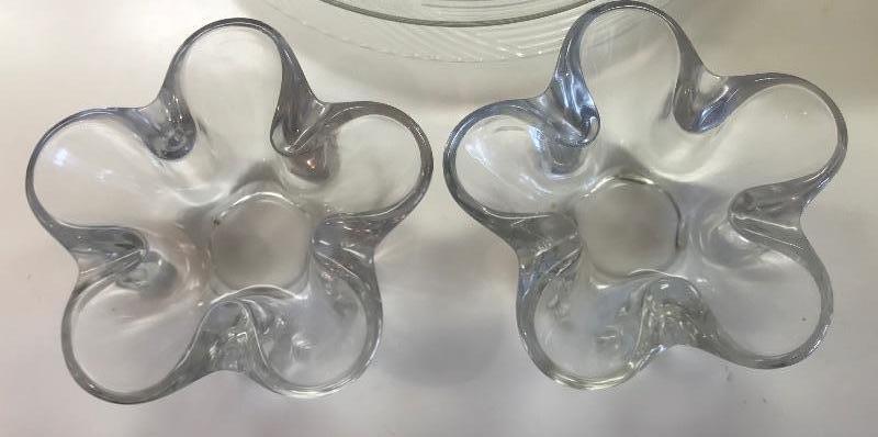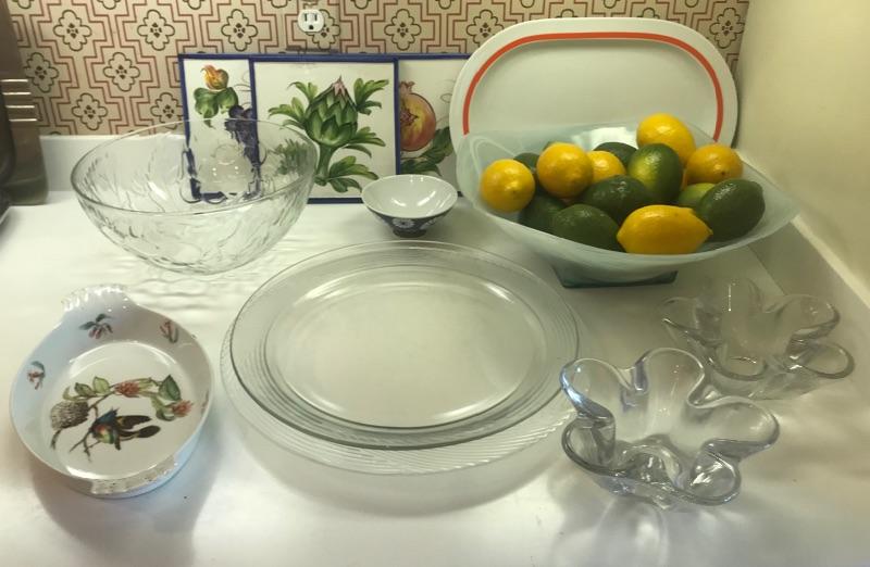 Set of 3 Sur La Table porcelain trivets, Rosenthal Germany oval platter 15”x10”, Lourioux porcelain vegetable serving dish12”x6-1/2”, large square frosted bowl with decorative lemons and limes, two large glass cake plates, glass serving bowl and a pair of flower shaped glass votive candle holders