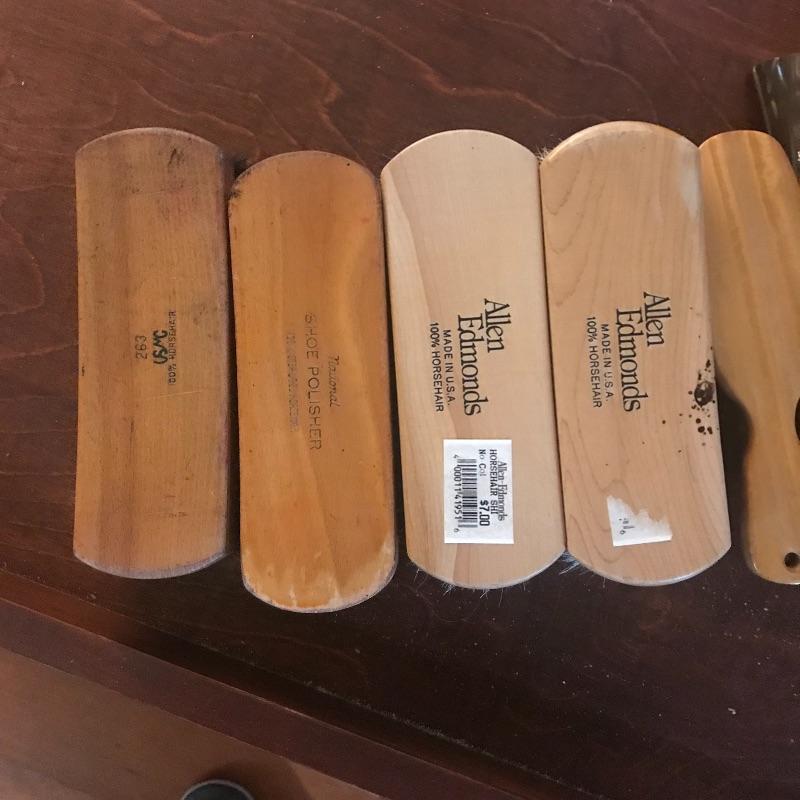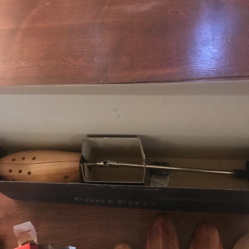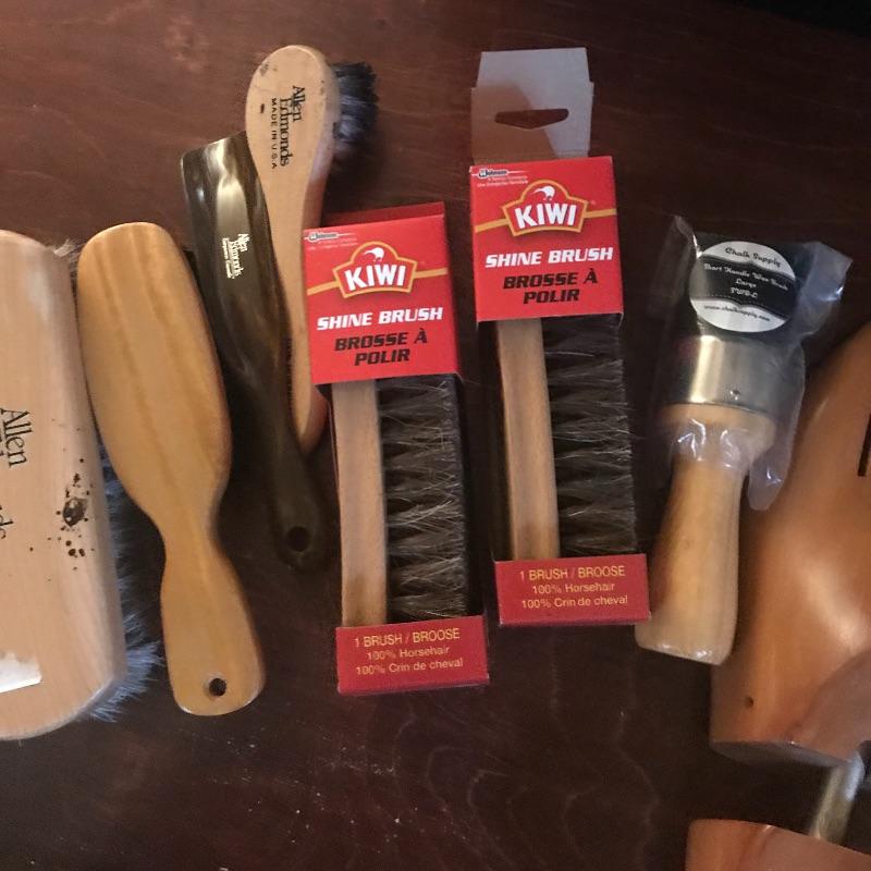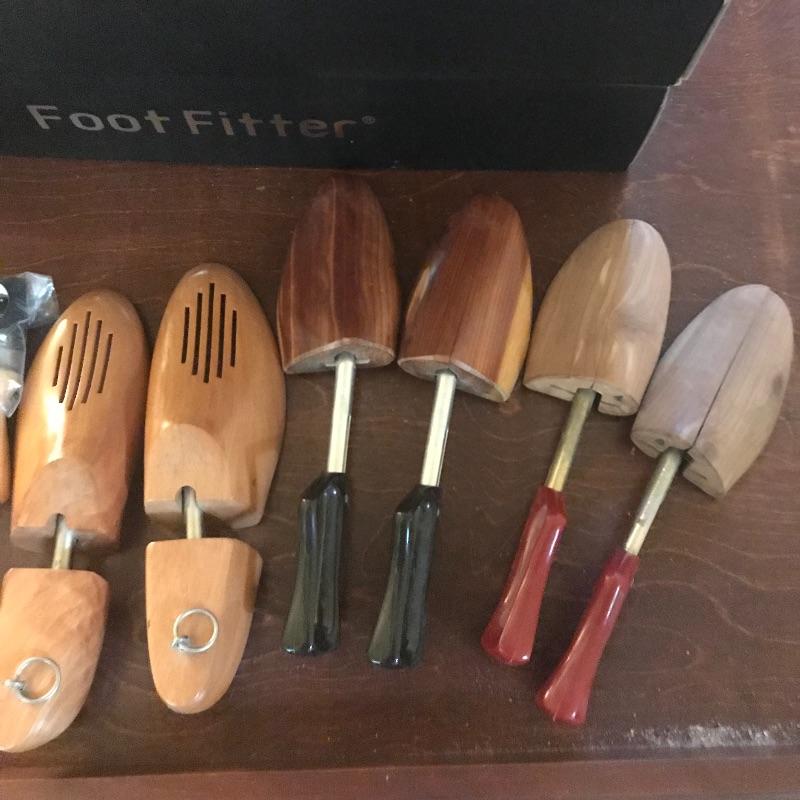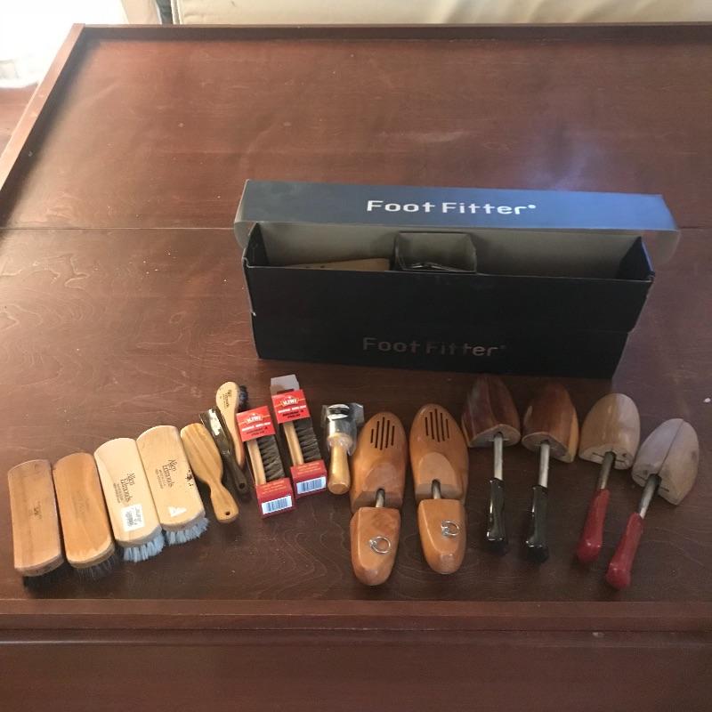 Two Foot Fitters still in box and three smaller shoe forms along with a collection of shoe brushes from like new to to new in box. Shipping available.