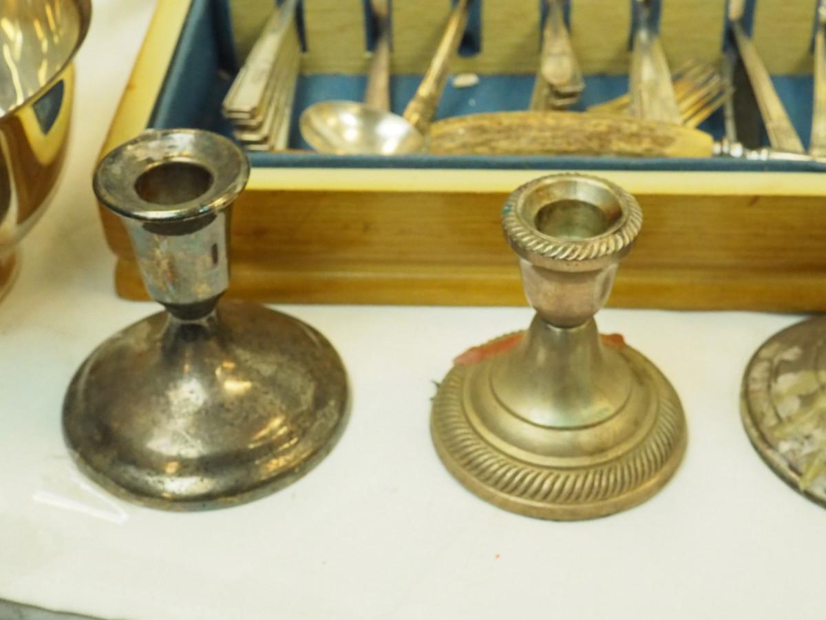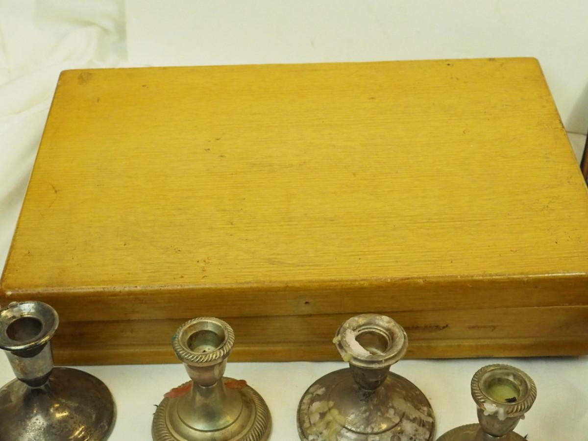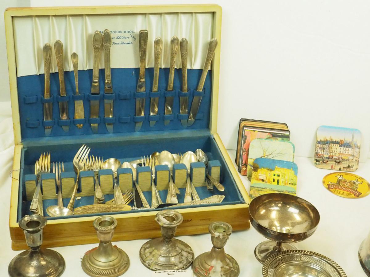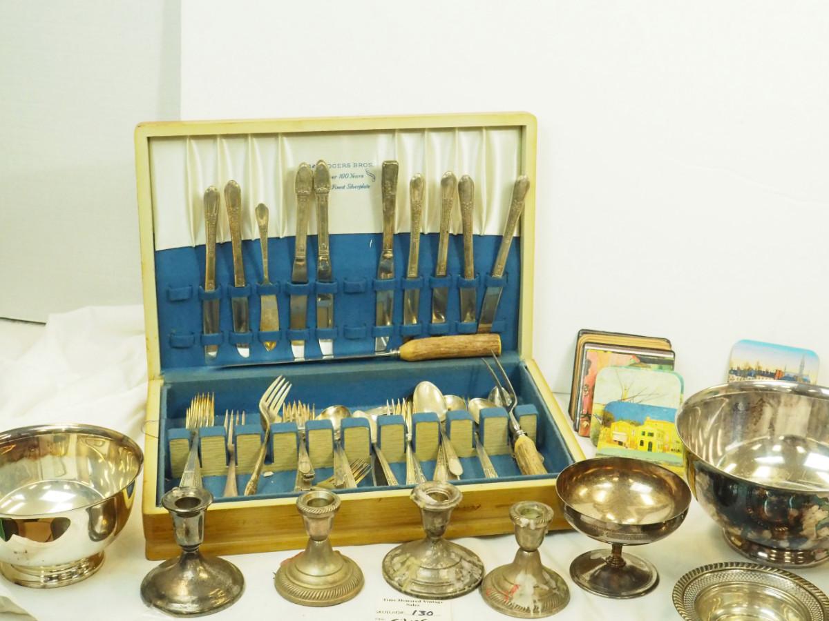 Lot 130 -Silverware, Silver plate. Set of assorted silverware in a wood box with a hinge in need of repair. Hallmarked weighted SP candle holders. Hallmarked silver plated vessels. Sheffield Stainless horn handle knife and fork. Art coasters.
