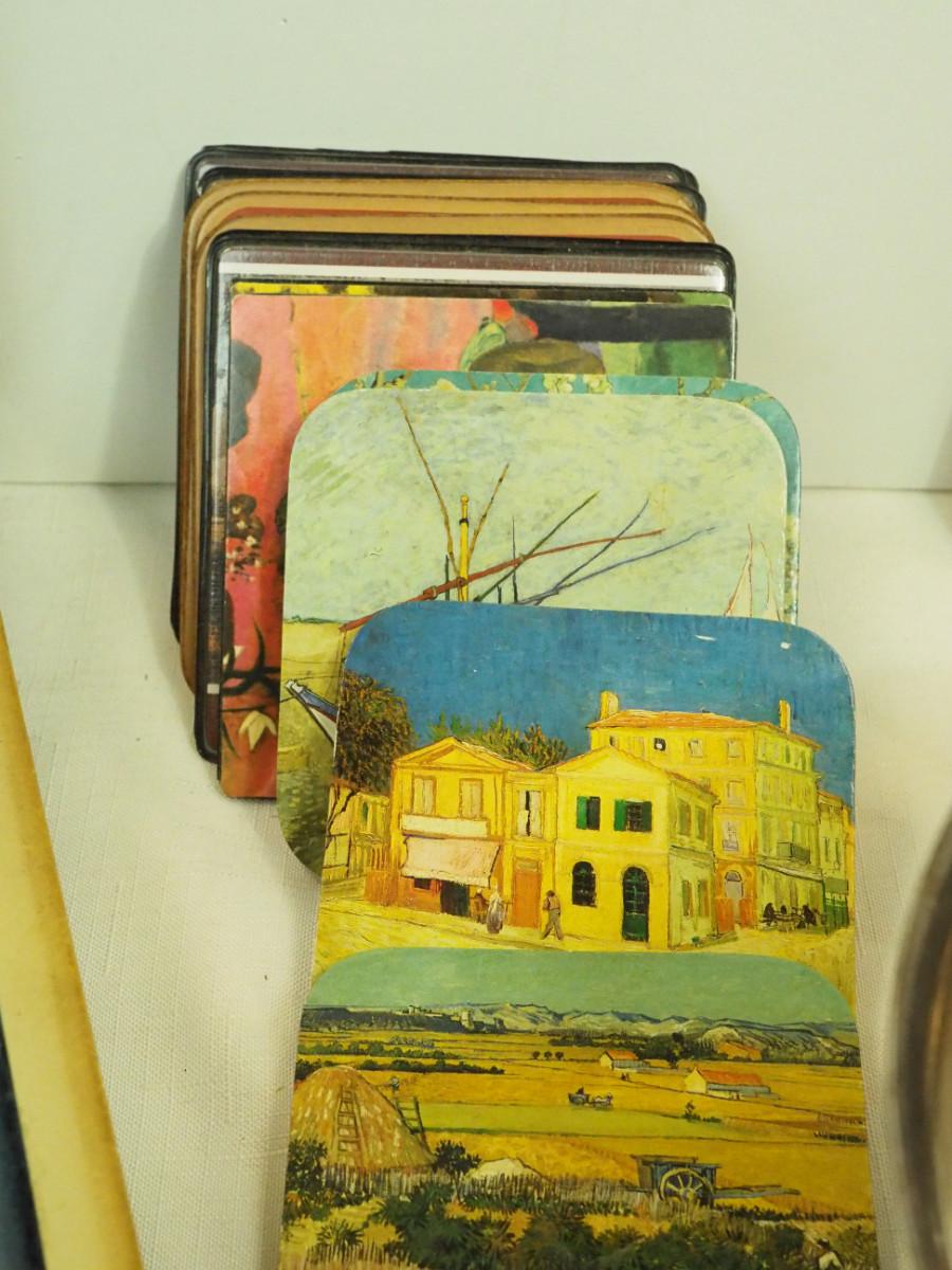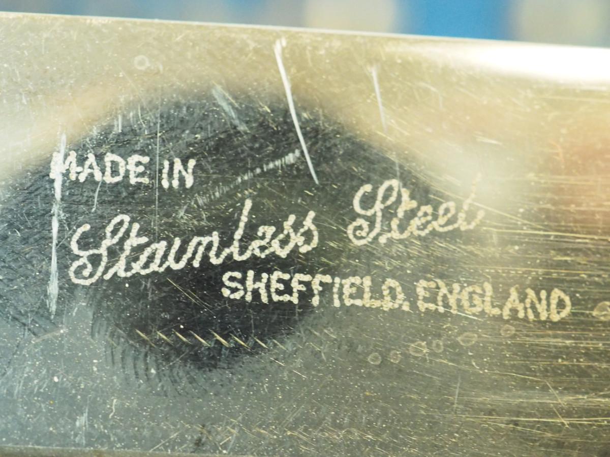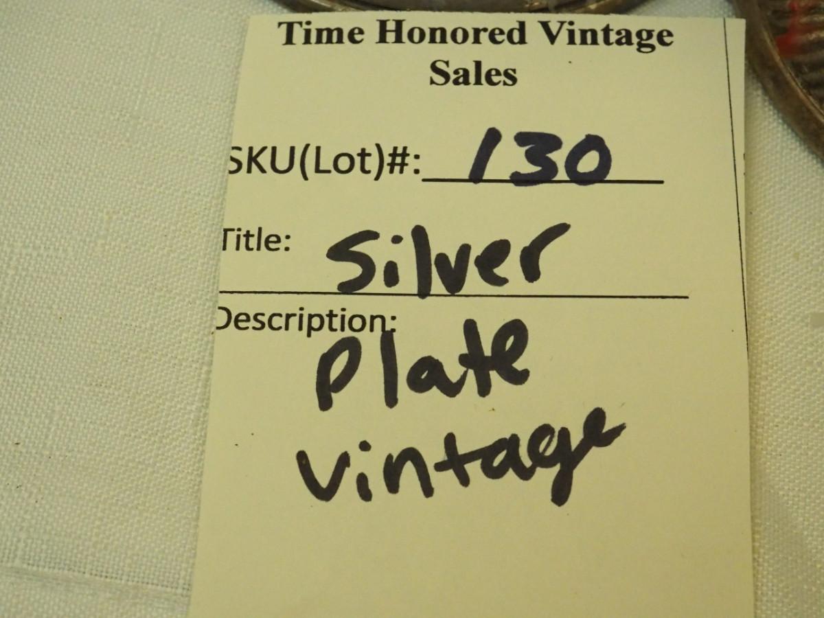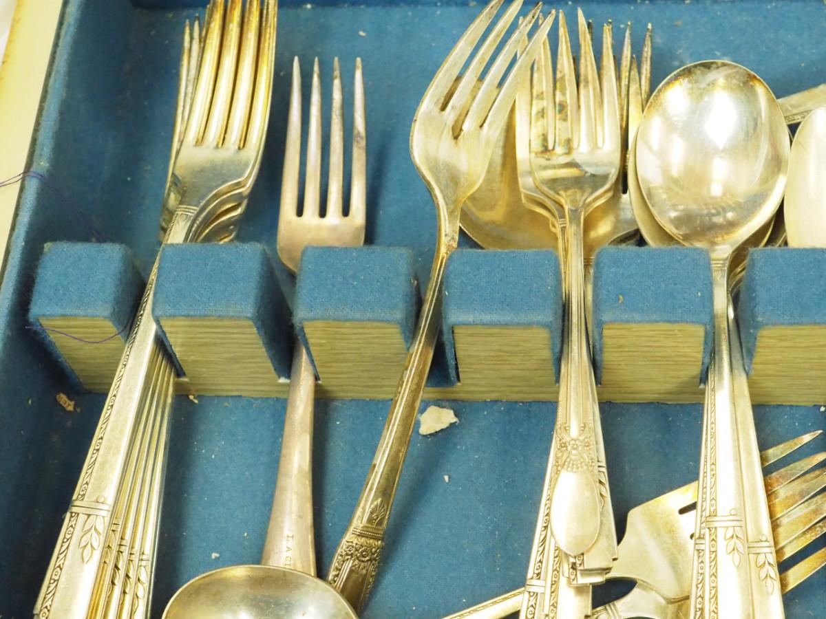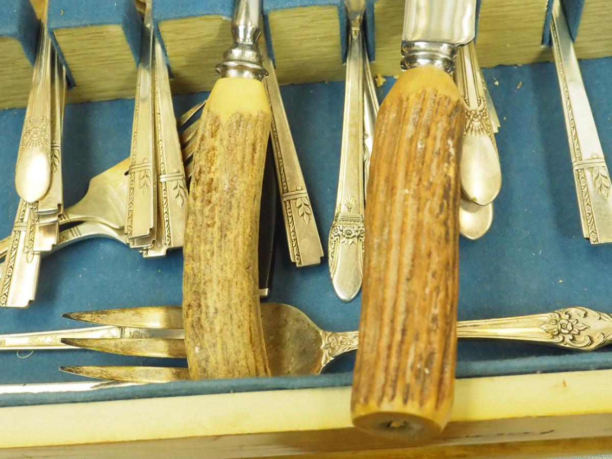 Lot 130 -Silverware, Silver plate. Set of assorted silverware in a wood box with a hinge in need of repair. Hallmarked weighted SP candle holders. Hallmarked silver plated vessels. Sheffield Stainless horn handle knife and fork. Art coasters.