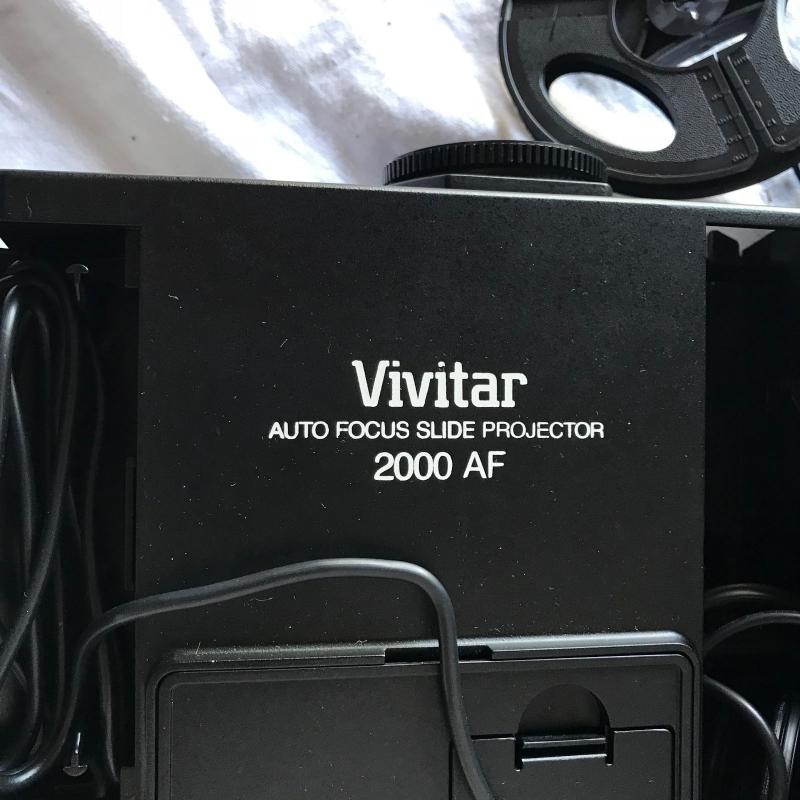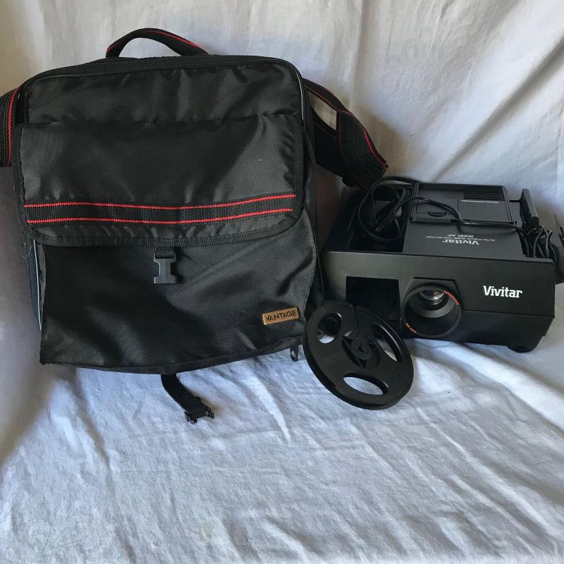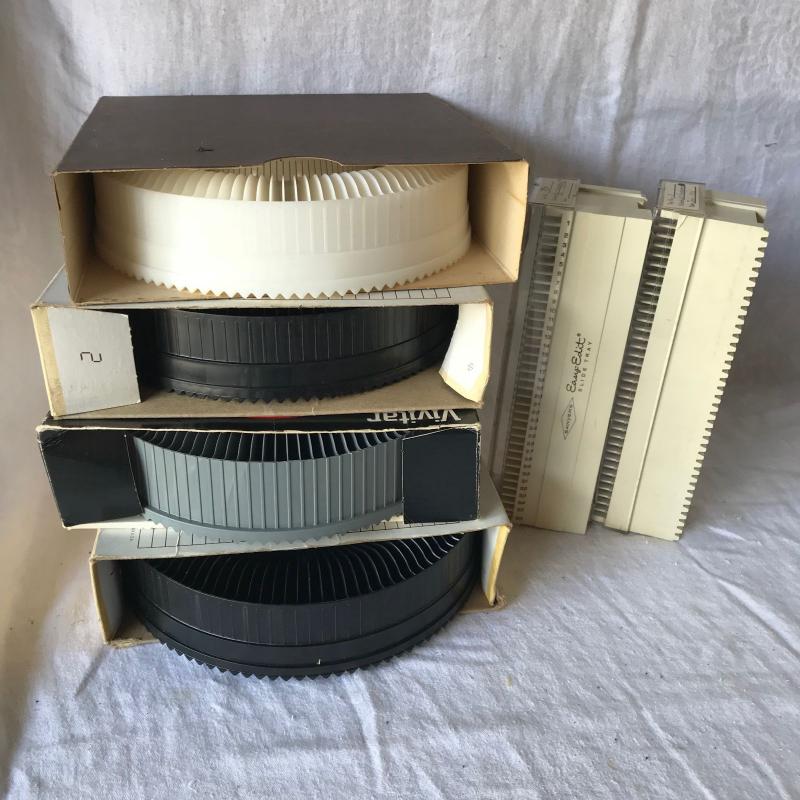 Lot includes vintage Da-Lite screen and Vivitar slide projector with extra trays. No shipping
