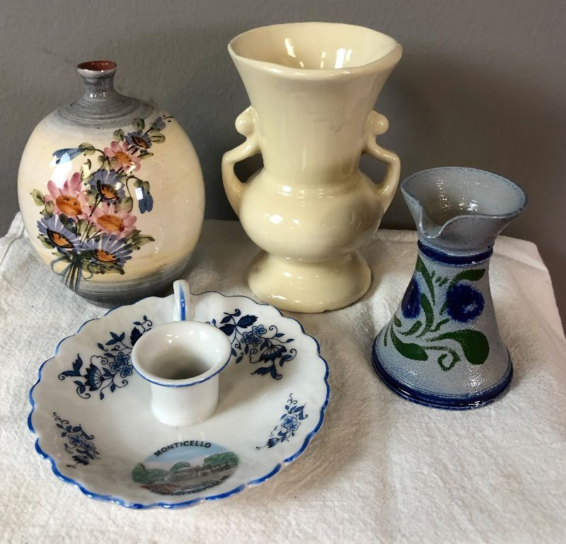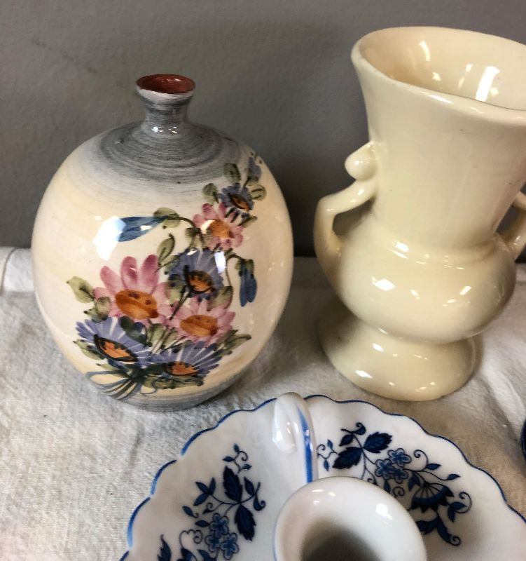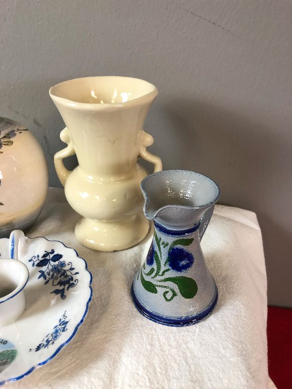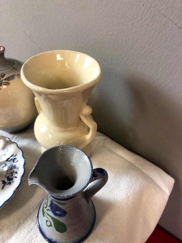 Lot 130 Small pottery lot - Candle, vases and creamer