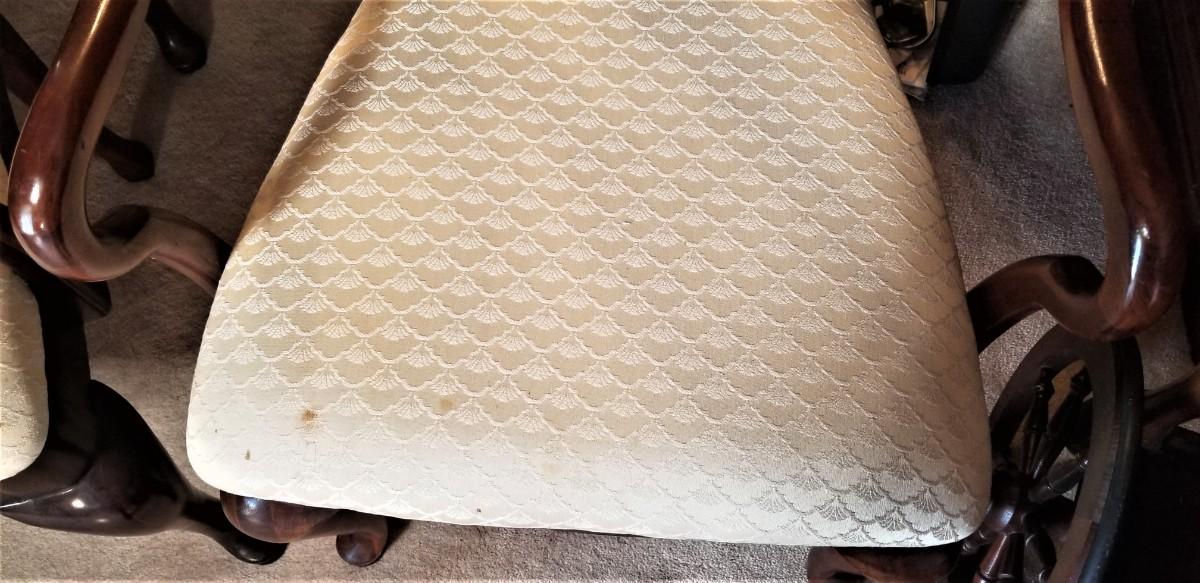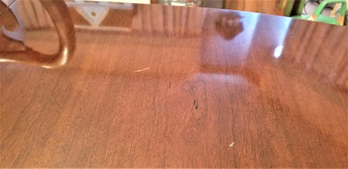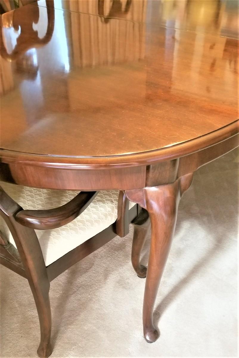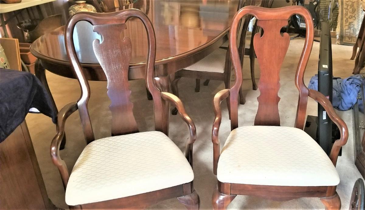 This pretty Thomasville dining room table has two leaves that extend it to a whopping 9 feet long when fully extended. With no leaves, it measures 68.25" long. 44.5" wide, 29" tall. Leaves are each 19.75" long. Only a couple of small "dings" - gently used. 6 chairs in all - two armchairs and four side chairs. Queen Anne style, all sturdy and comfortable. Some of the cushions could use a clean. A good quality set. The matching china cabinet will come up later in the sale.