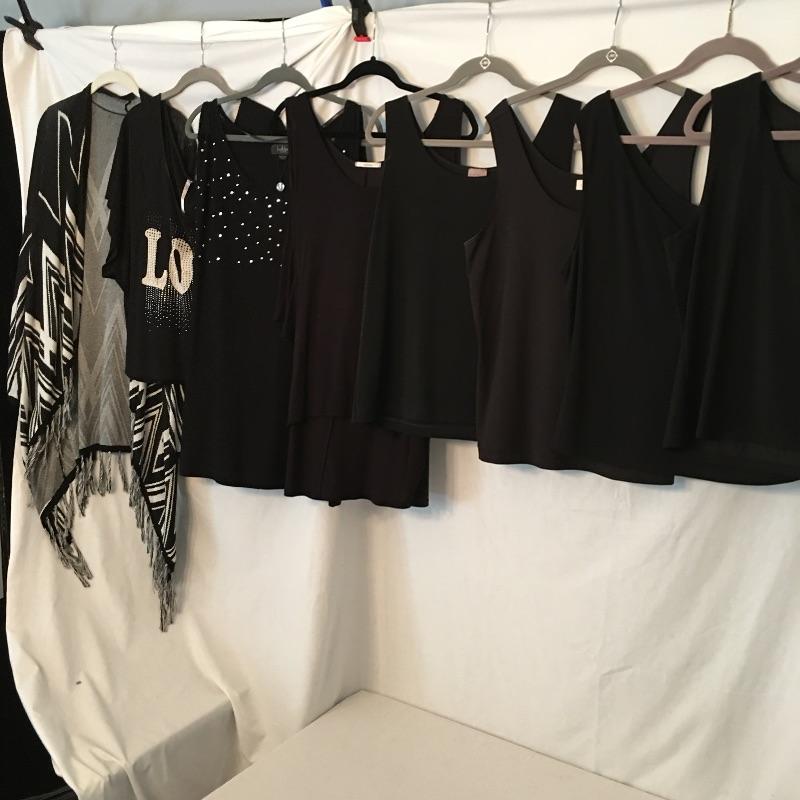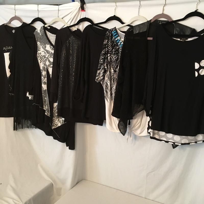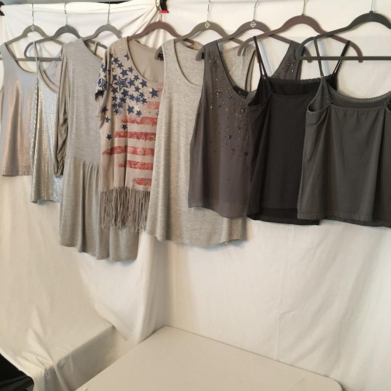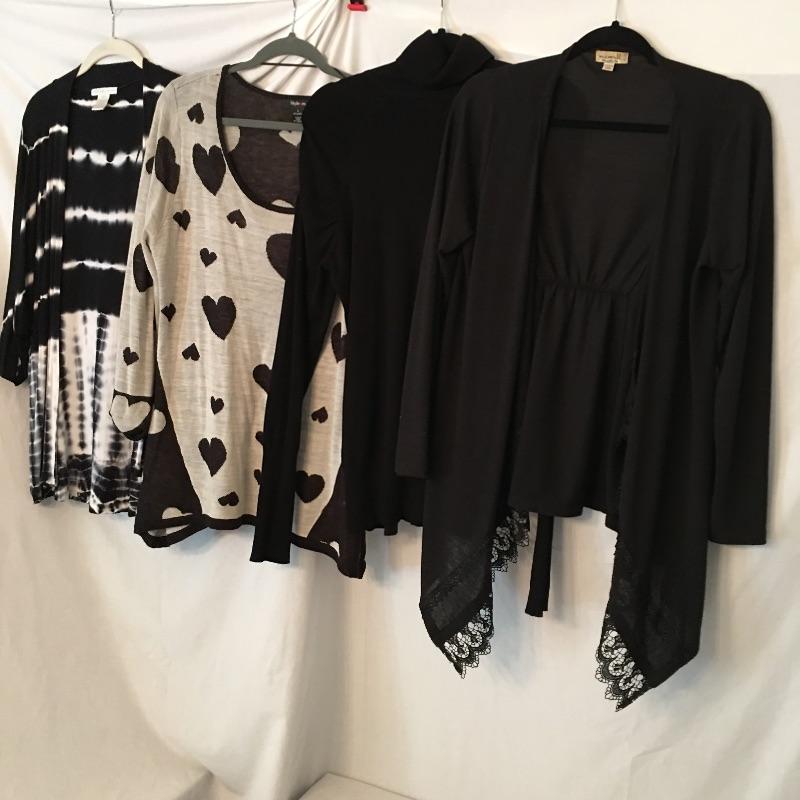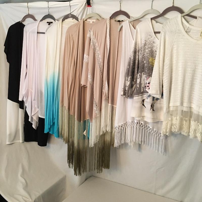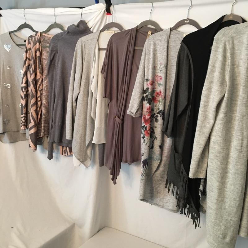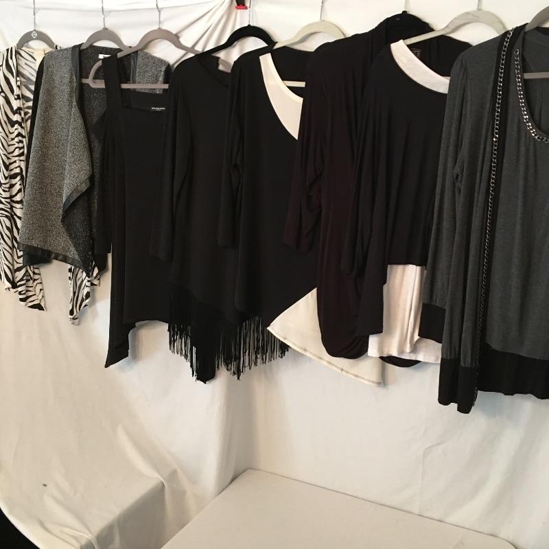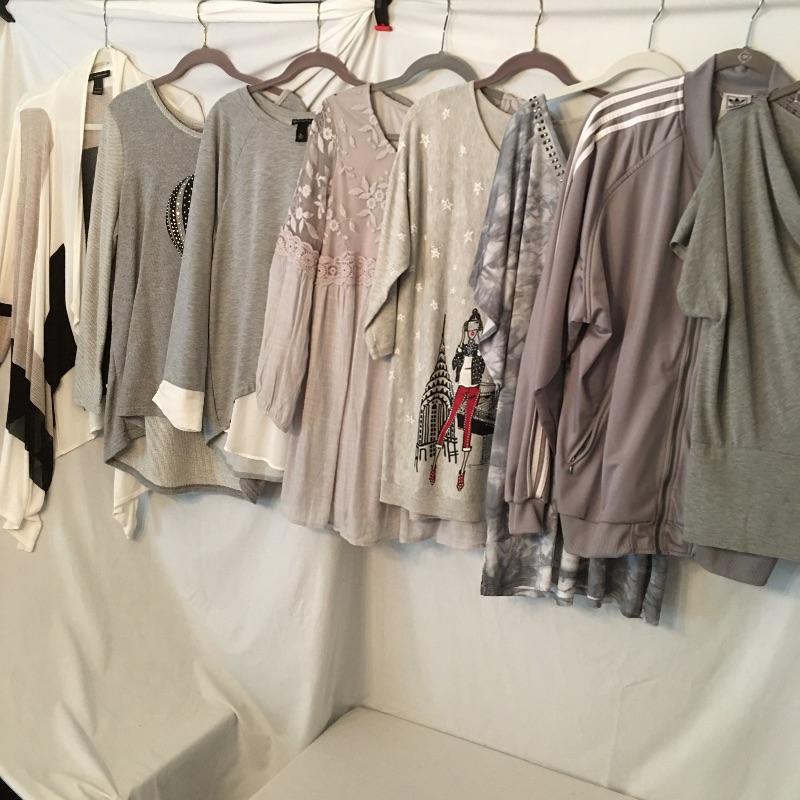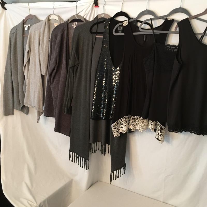 Wow, over sixty tops are included here with most being neutral colors with brand names such as Chico, Ginger G, Eyeshadow, Pebble and Stone, Style and Co, Oneworld and more. Sizes are mostly Large to XL.