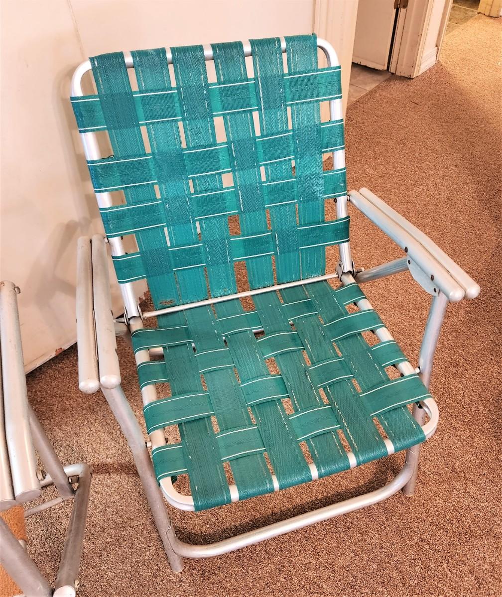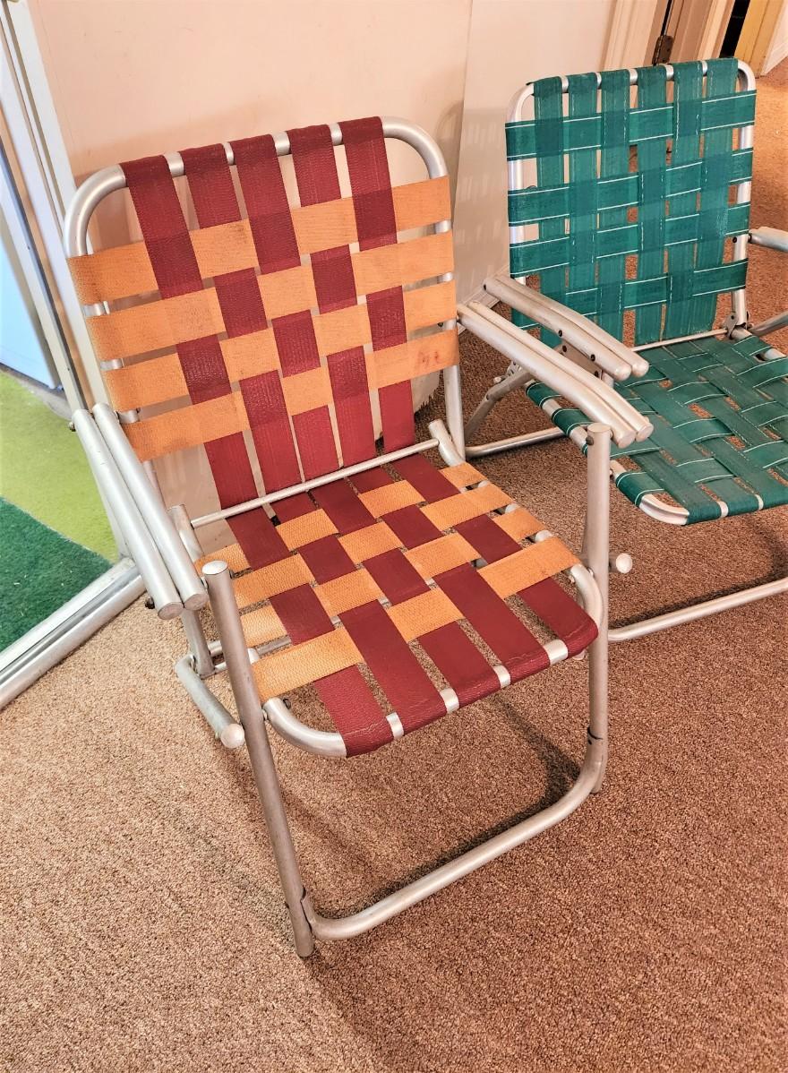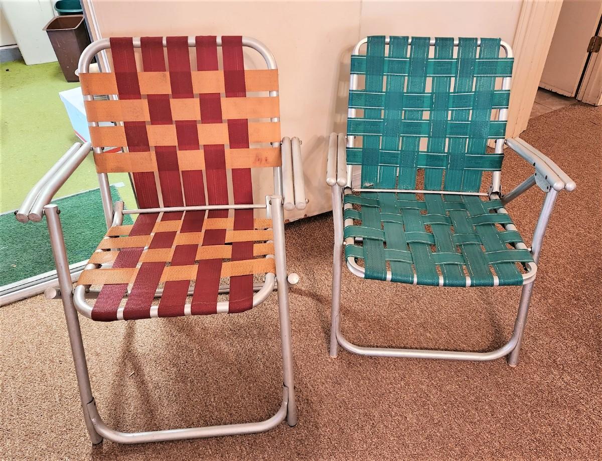 Two vintage folding lawn chairs (50's/60's). Larger on left is 22" across and 33" tall. The one on the right is 20.5" across and 30" tall. Both in good vintage condition.