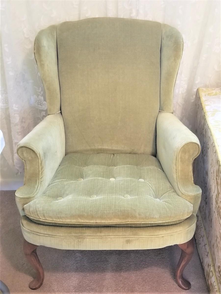 1960's green upholstered winged-back arm chair - good vintage condition. 28" across, 27" deep, and 36" tall.