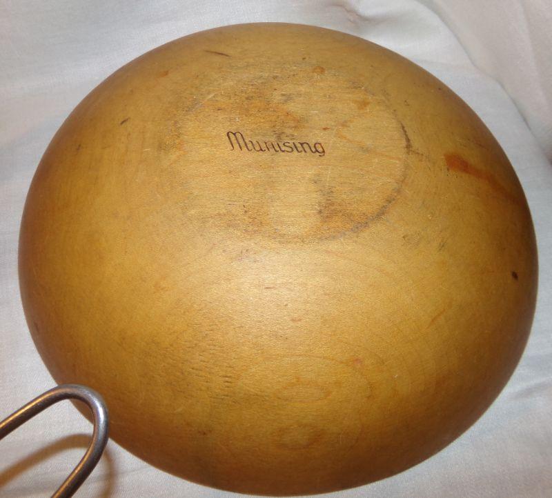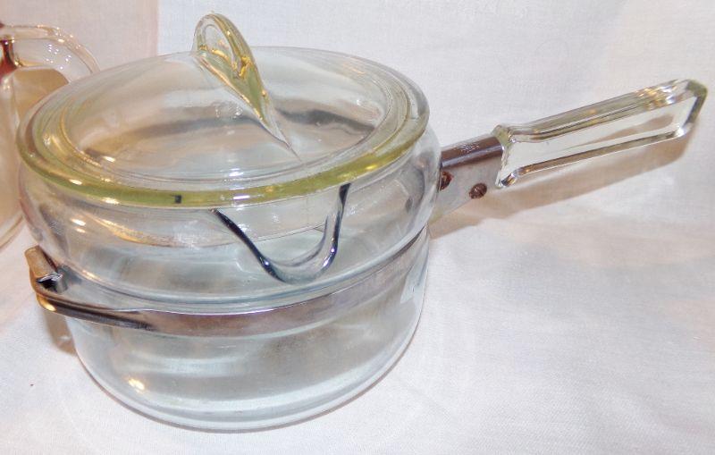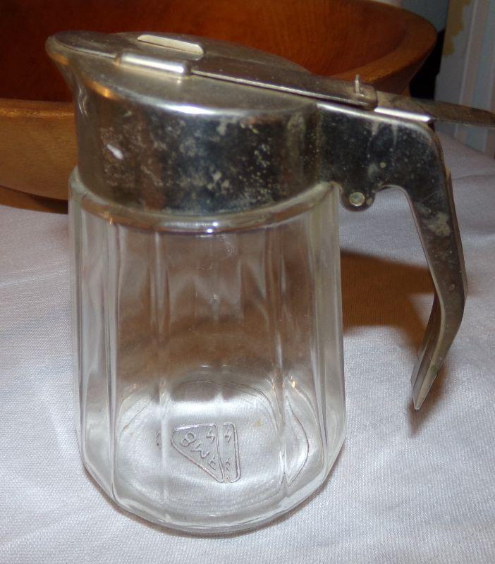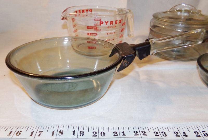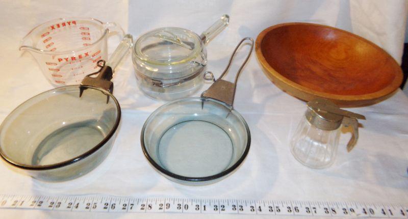 3 PYREX GLASS COOKWARE (2 HAVE GLASS HANDLES), PYREX 4 CUP MEASURING CUP, SURUP DISPENSER AND WOODEN BOWL