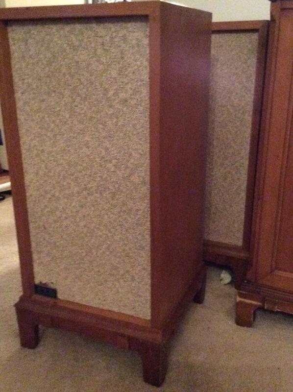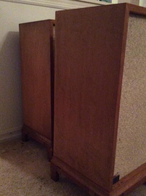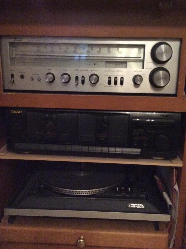 Includes KLH speakers on wooden stands, repair needed to stands, 14 L 13 W 28 H, Technics receiver, Teac cassette player, Realistic turn table, new cassettes and more. Untested. Bring box and help to move.