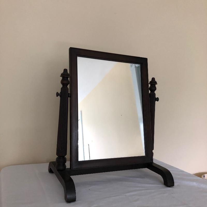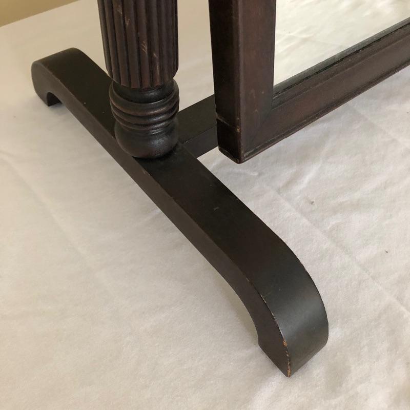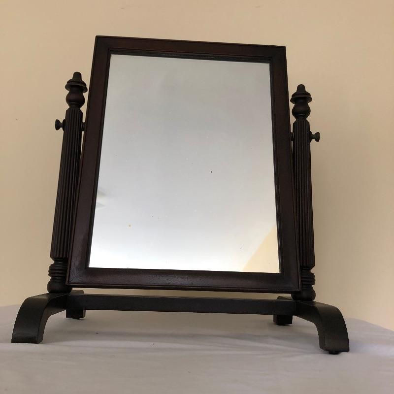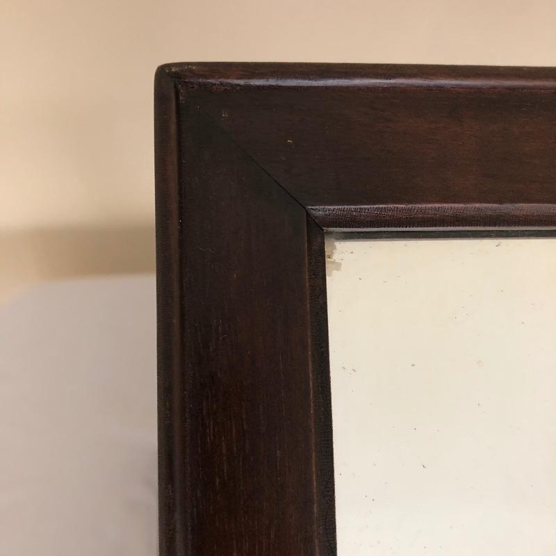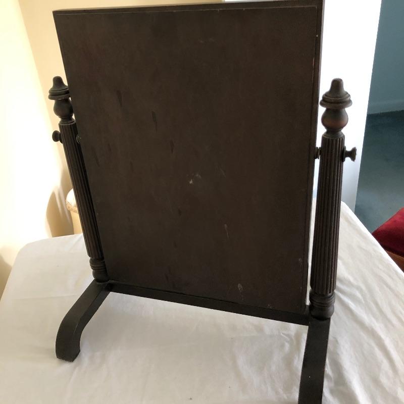 An ideal mirror for your vanity, this vintage mirror is adjustable. The solid wood frame and stand is a dark wood. The mirror does show some signs of age; images highlight the 2 spots plus there are some very light, barely noticeable pale dots.