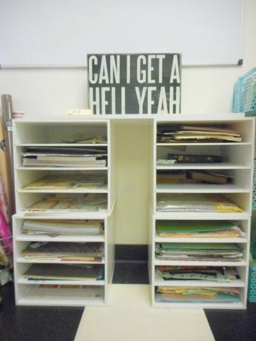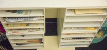 Nice white shelf unit with paper products and a funny sign