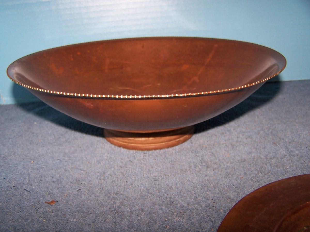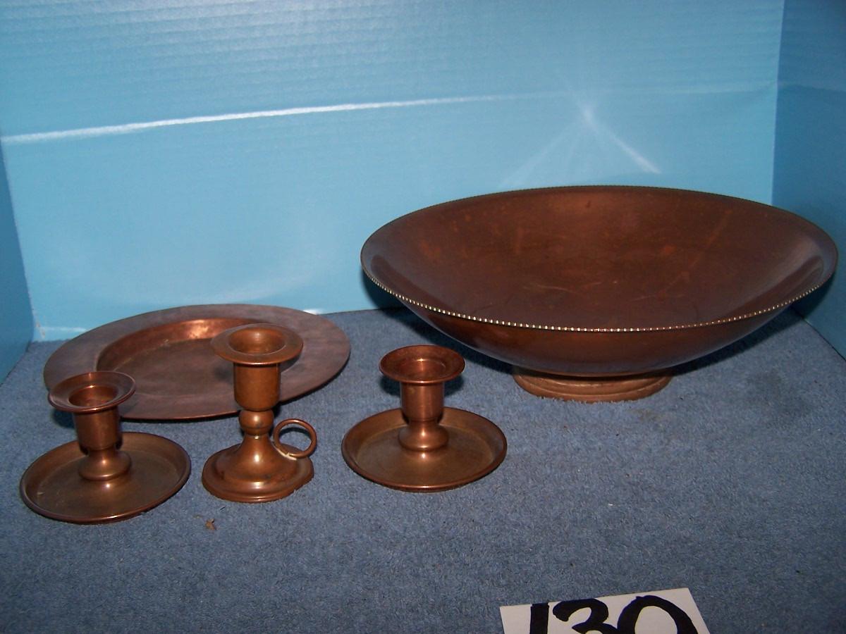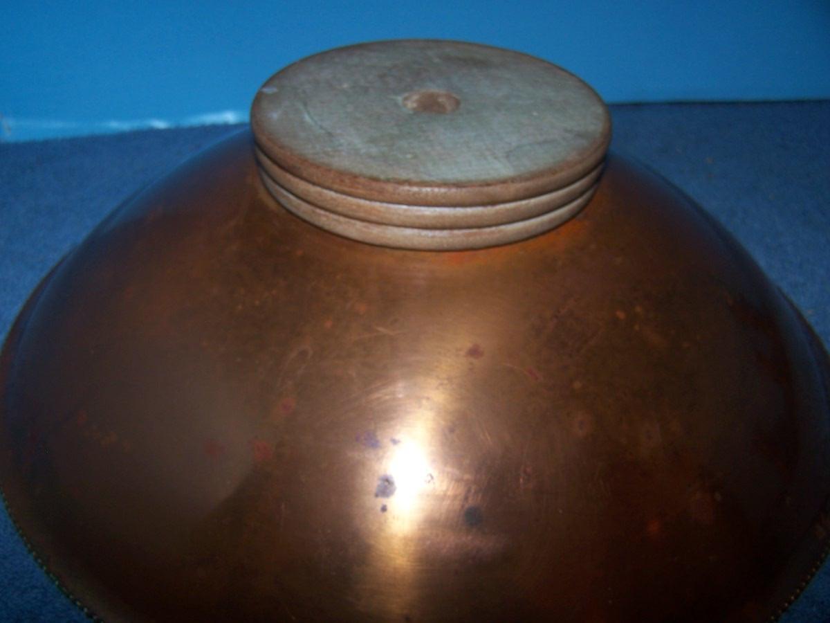 THESE ARE WONDERFUL VINTAGE COPPER ITEMS!!! BOWL WITH A WOODEN BASE IS 11 1/4'' ACROSS, HAS TARNISH AND SPOTS.. LIGHT WEAR..