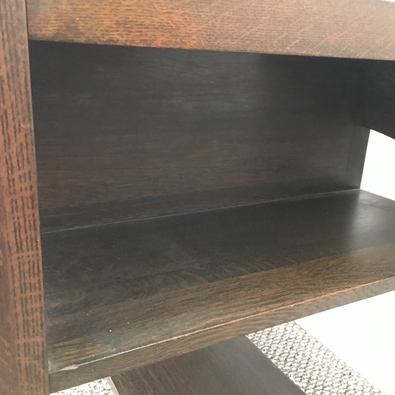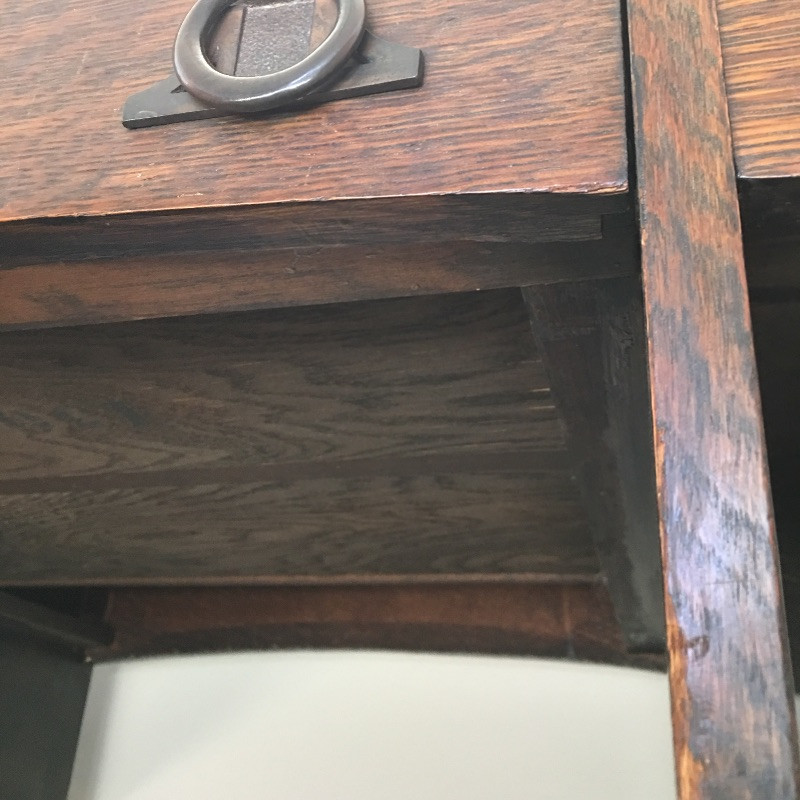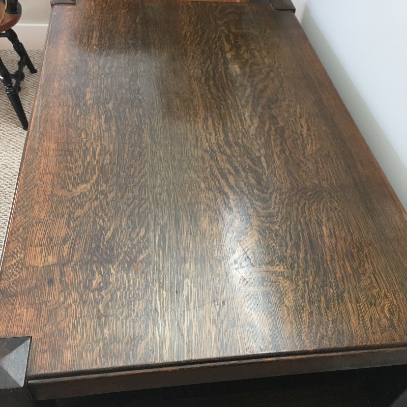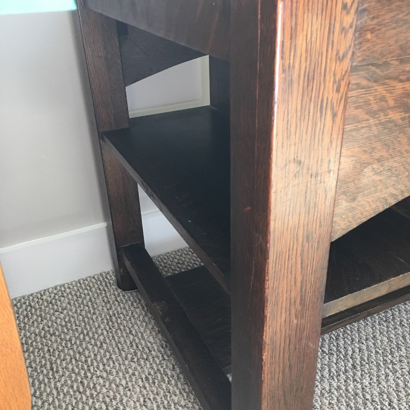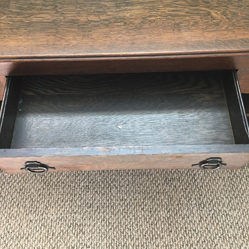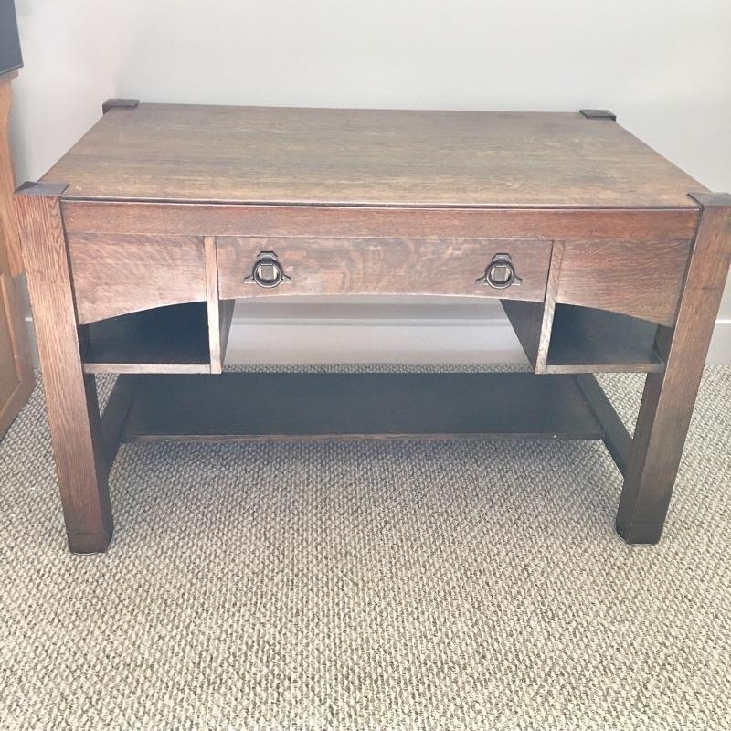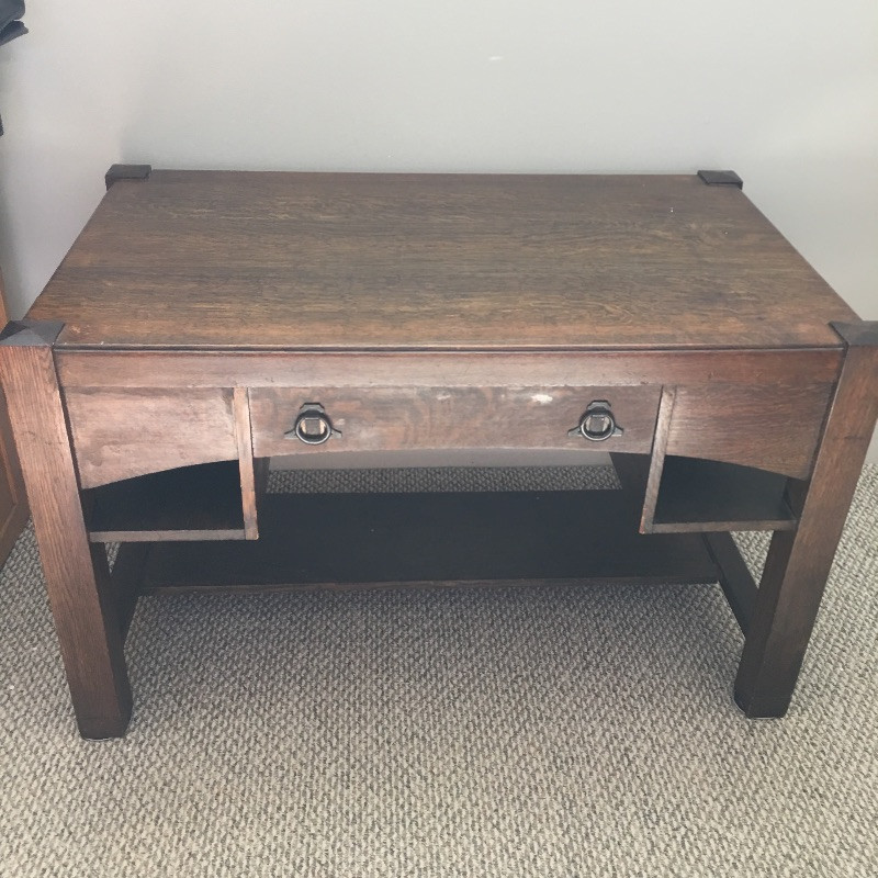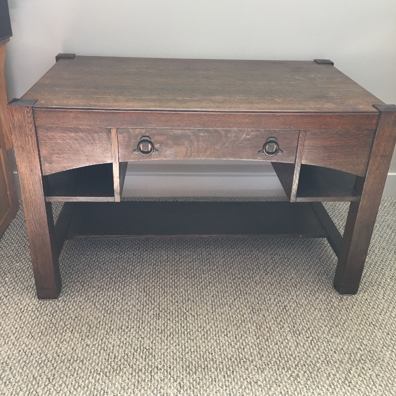 MCM style wooden desk comes with dove tail drawer and is a very handsome piece that could be a desk or can simply stand alone as a feature piece in your home. Desk measures 28.5” x 46” x 28.5”.