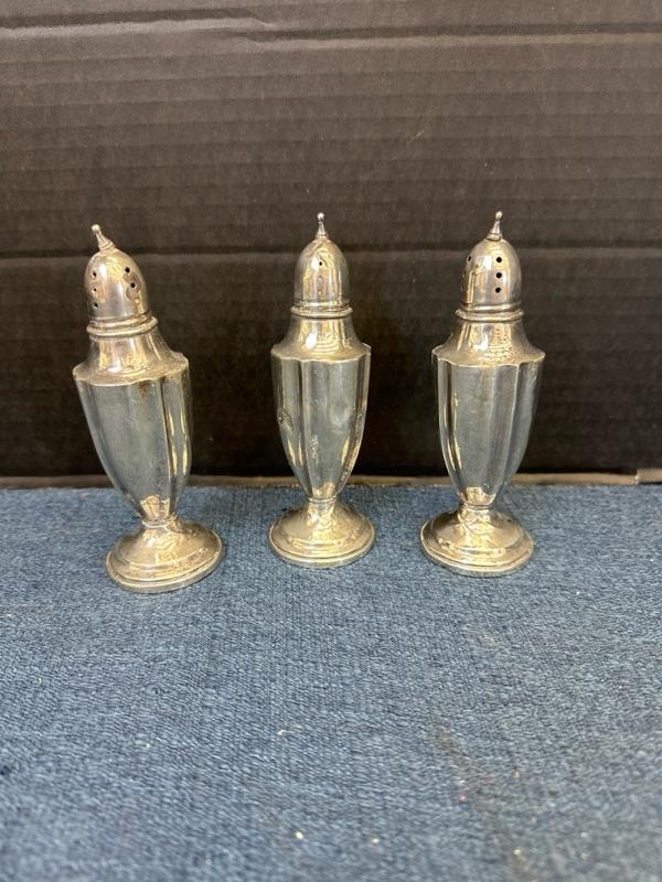Three Sterling weighted salt shakers 5 inches inches tall some dents on body total weight 179 g