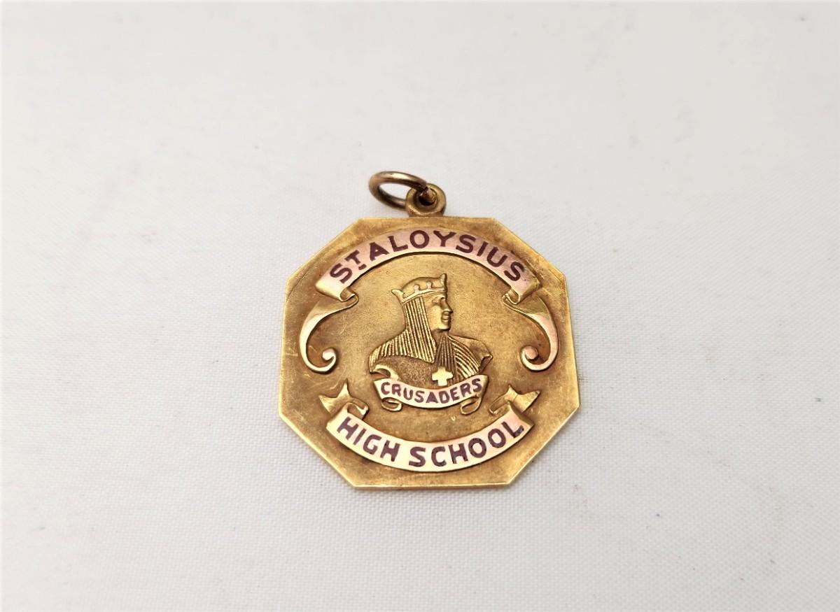 What a neat item! 10kt Gold (marked and tested) Charm/Fob awarded for perfect attendance at St. Aloysius High School (New Orleans) in 1951. Great condition, 1" across. We are starting this item at only 10% above the scrap value - opening bid will not be reduced.