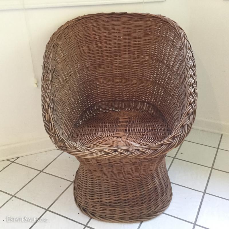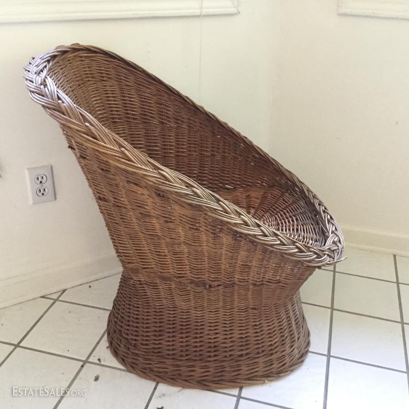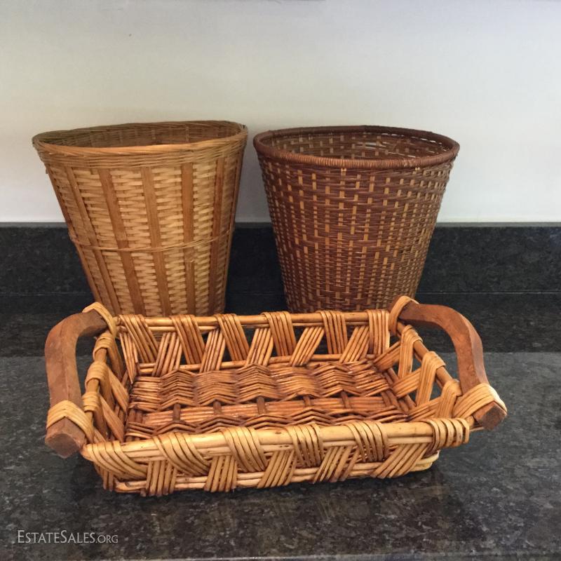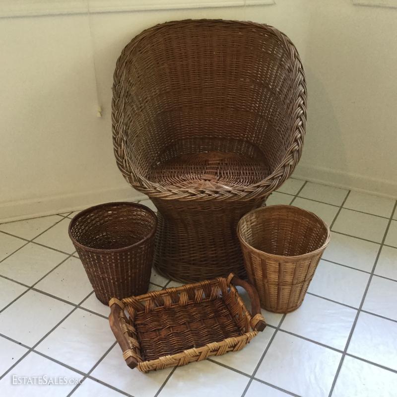 We have two basket and chair lots! This lot includes a darker colored chair that makes a perfect corner seat. Measures 28"l x 27"w x 30"h. Also includes two waste baskets and a basket tray that measures 18"L x 11"w. See photos. No Shipping. Only local pick up in Flat Rock, NC.