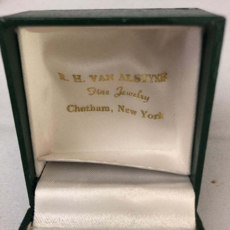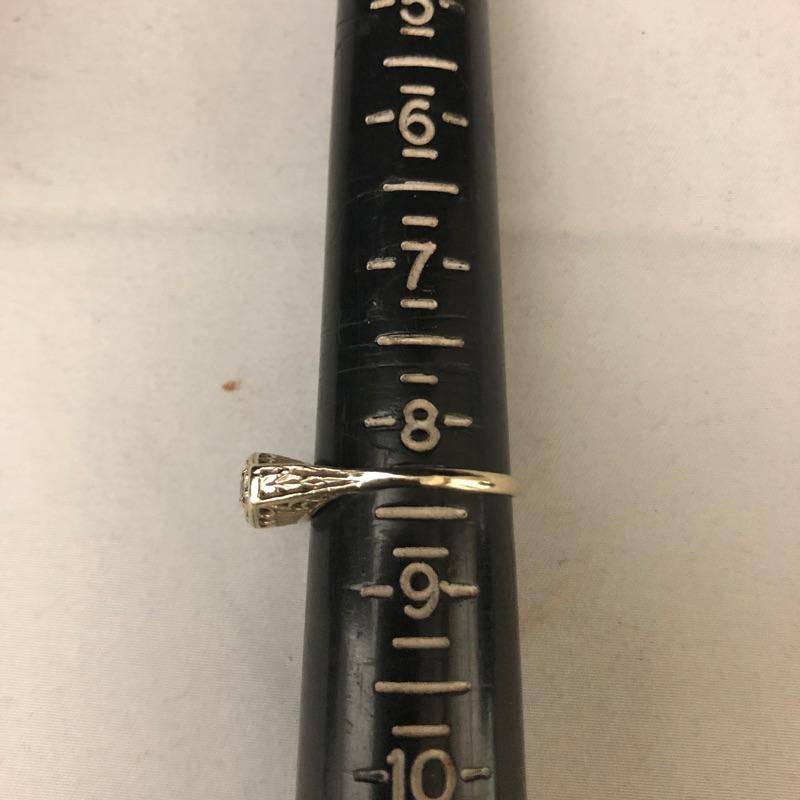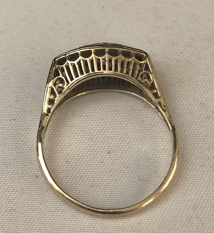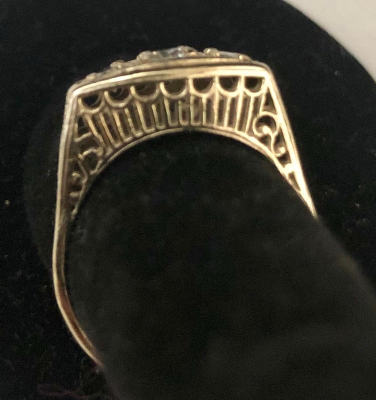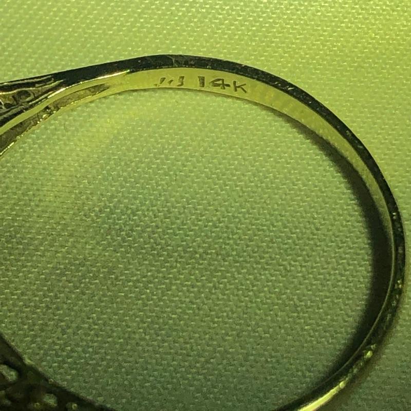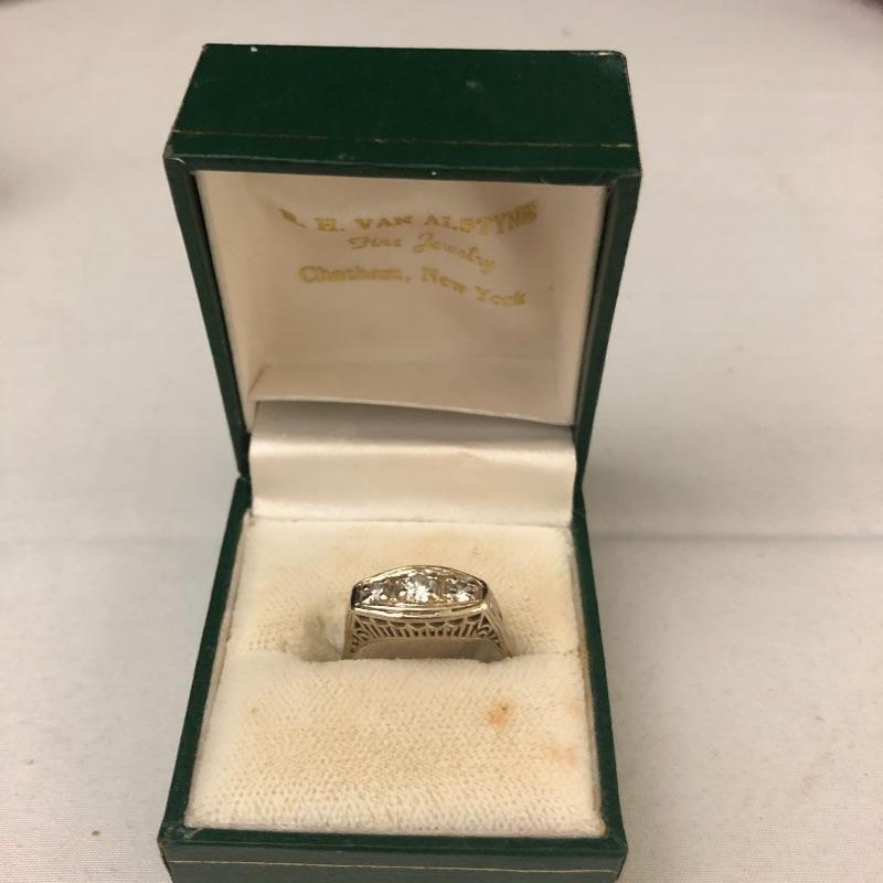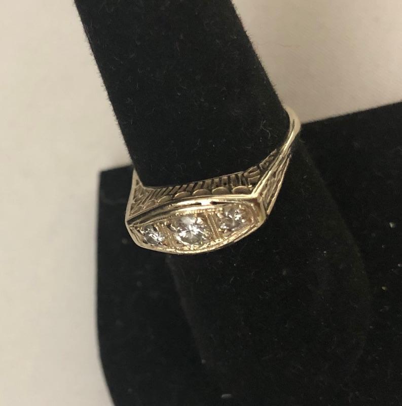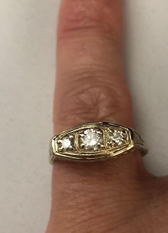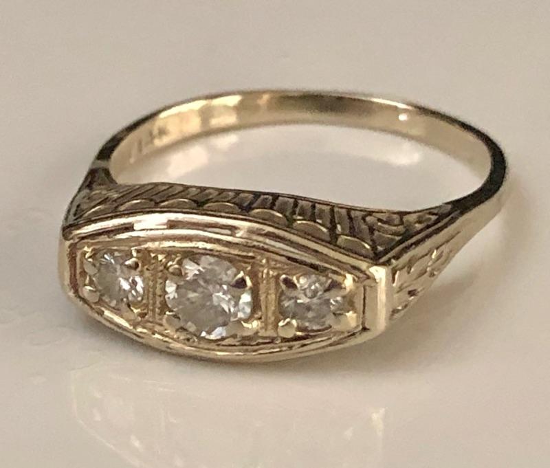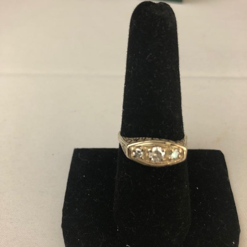 This exquisite 14K gold ring has three stones, the center tested as a diamond, The stones on either side of it did not. The gallery for the stones is gorgeous as you will see in the images, along with sizing and the information on its accompanying green box.
