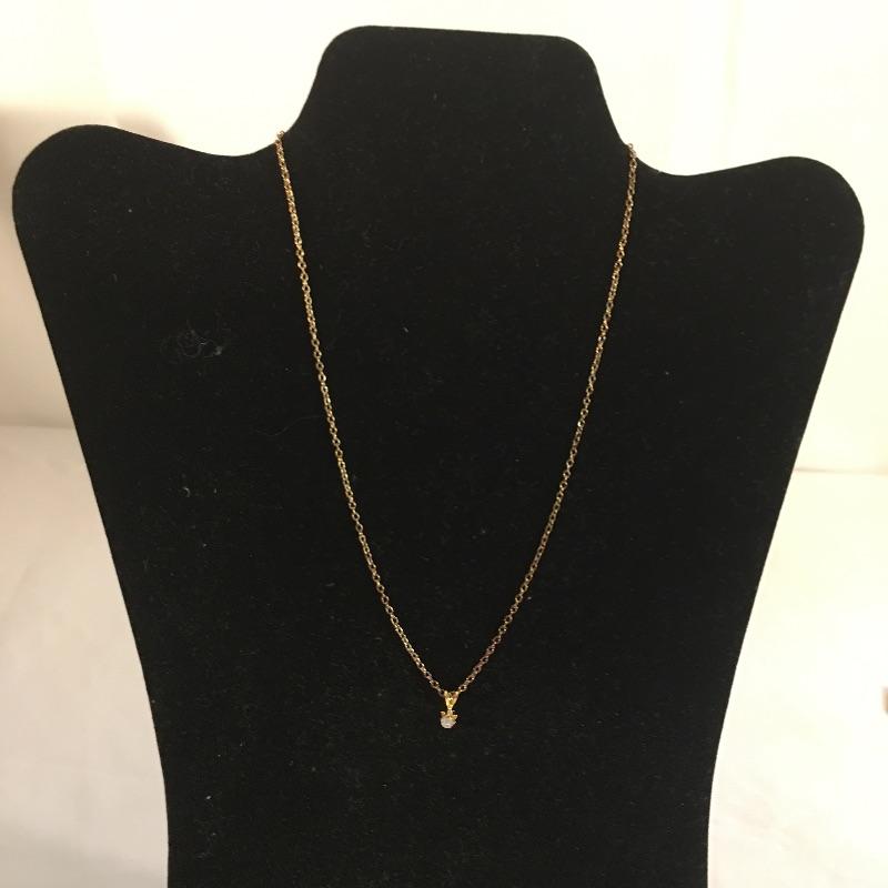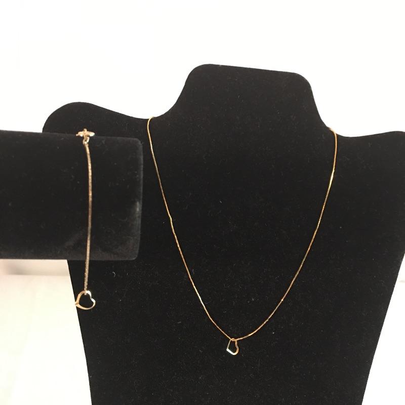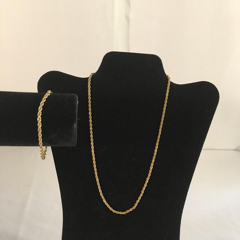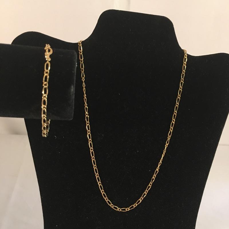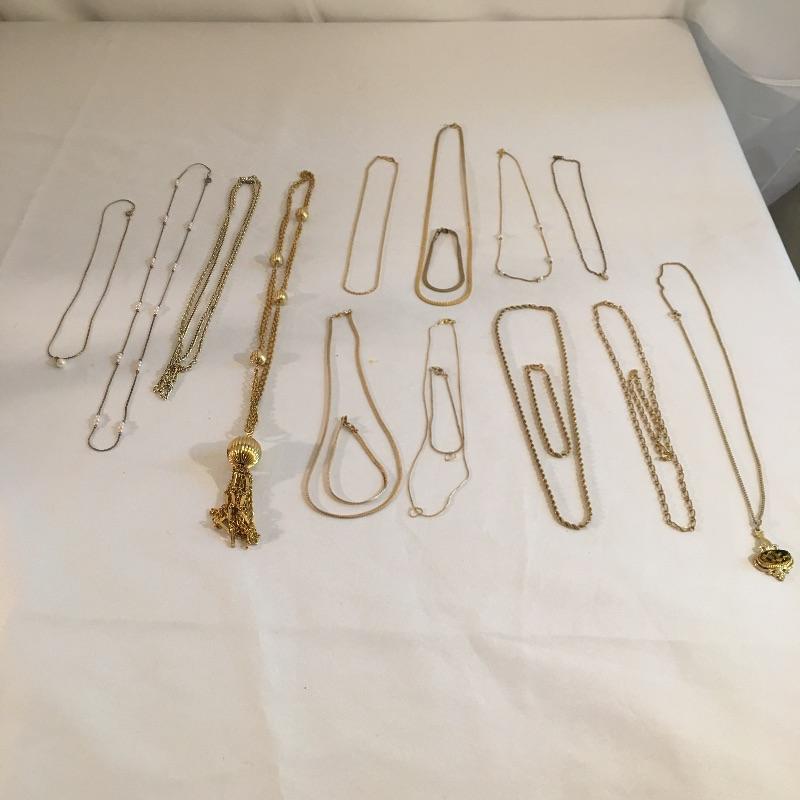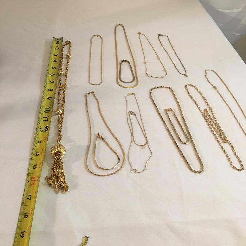 Thirteen gold colored necklaces in a variety of chain styles and designs and five bracelets. Largest necklace measures 16.5”.