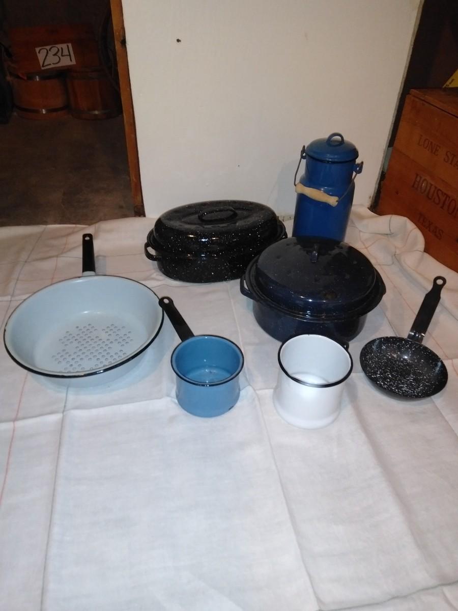 ENAMEL WARE, ROASTING PANS, STRAINER PAN, AND MORE