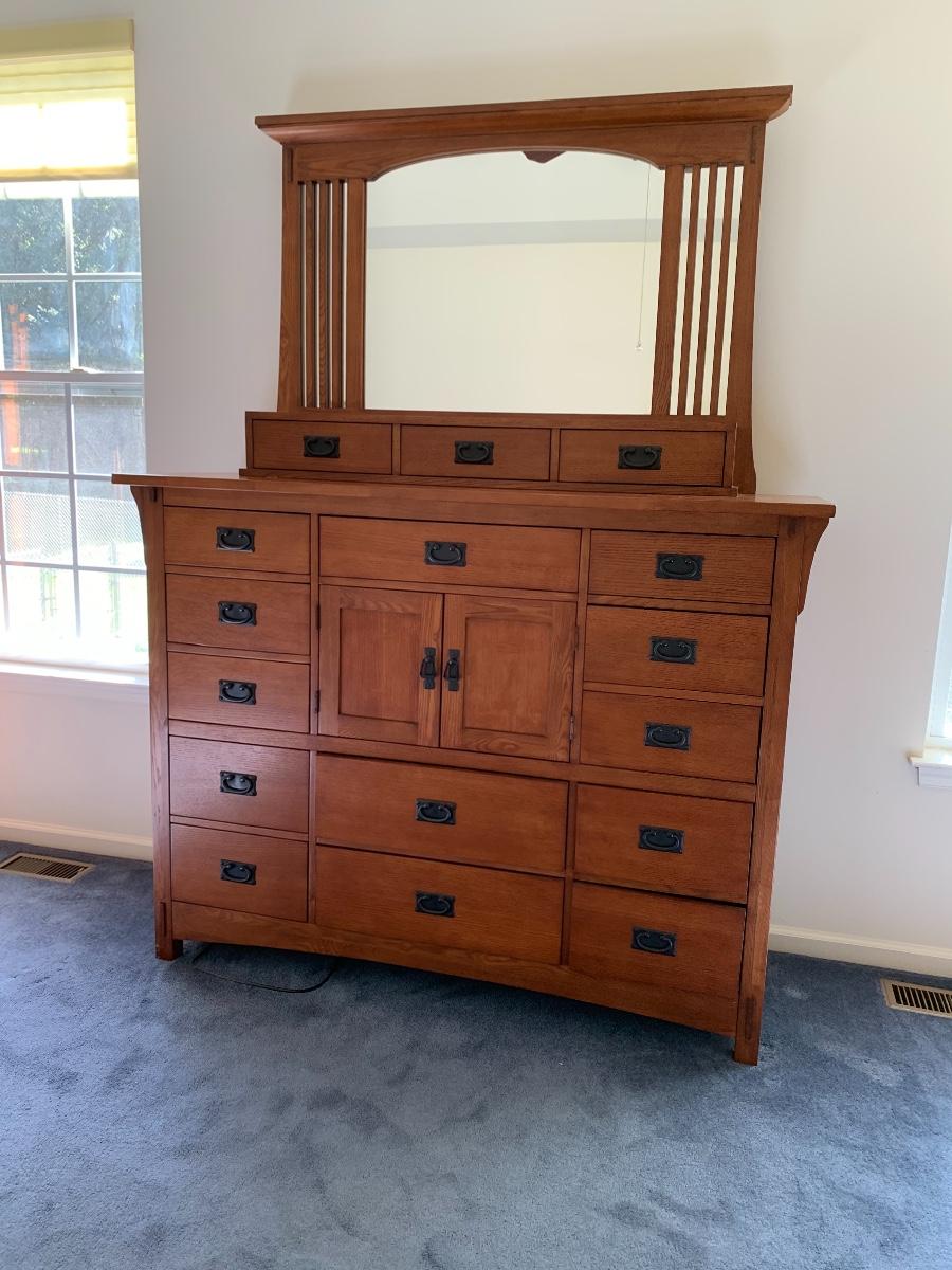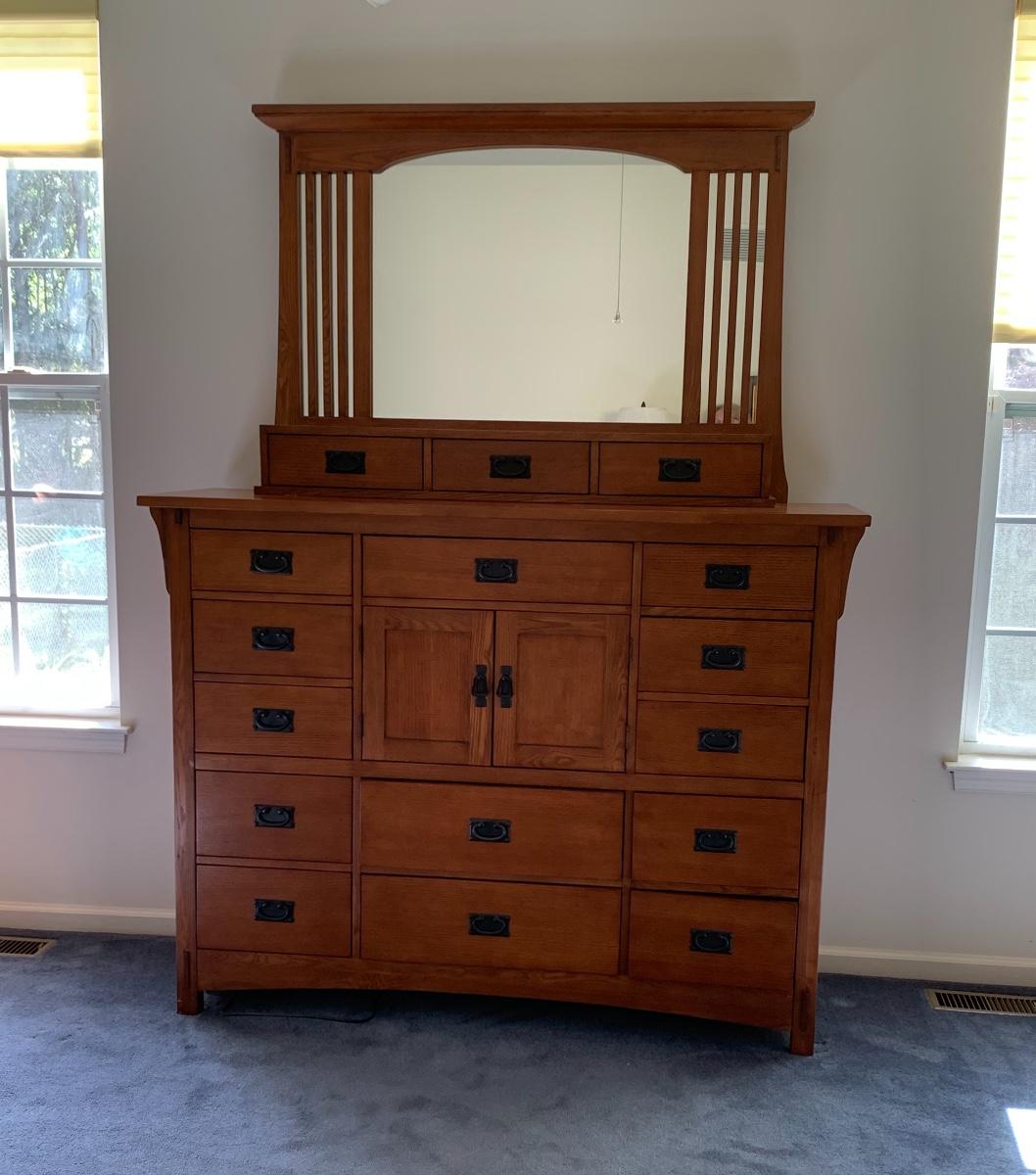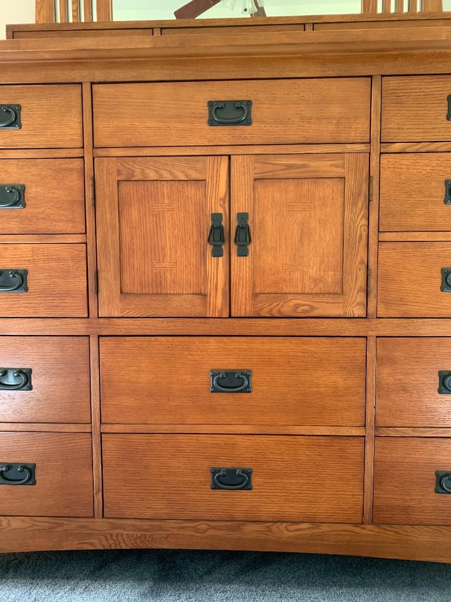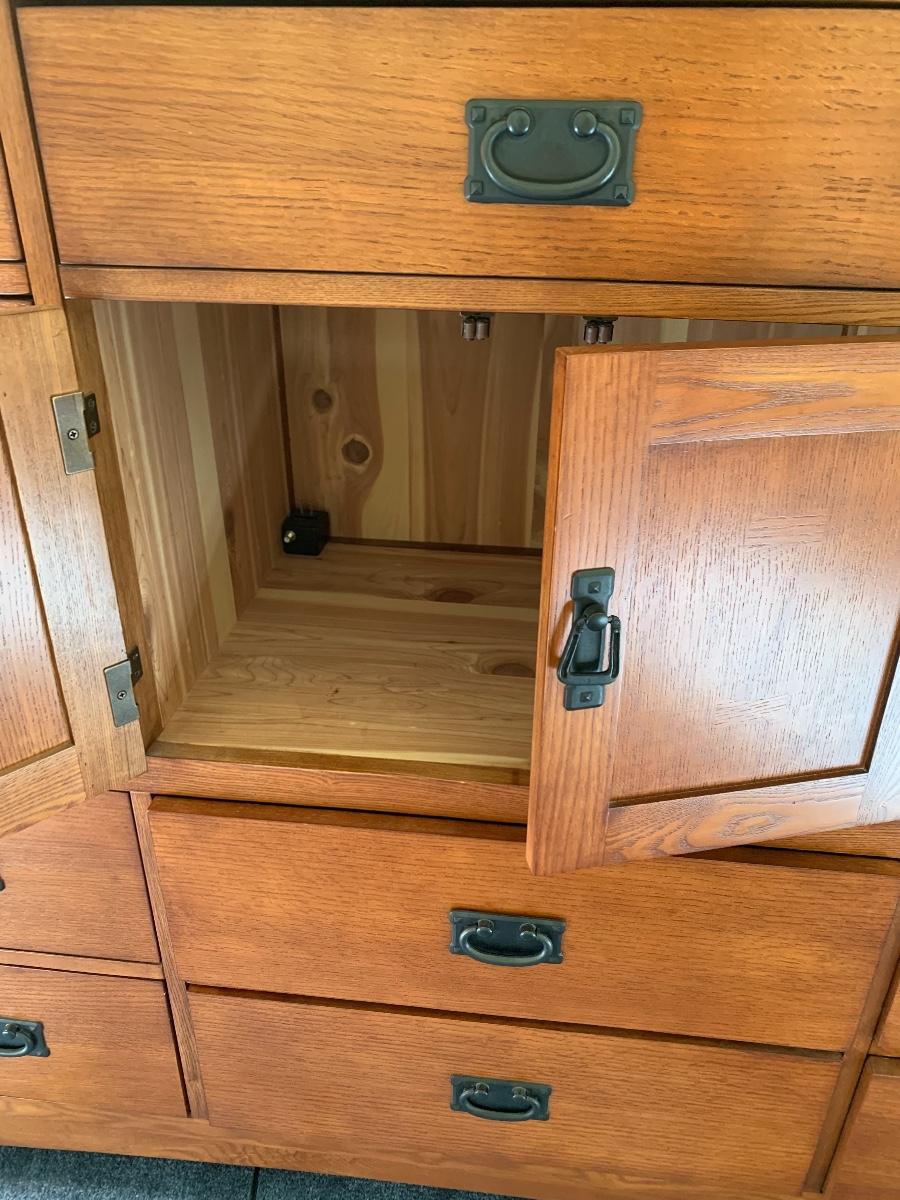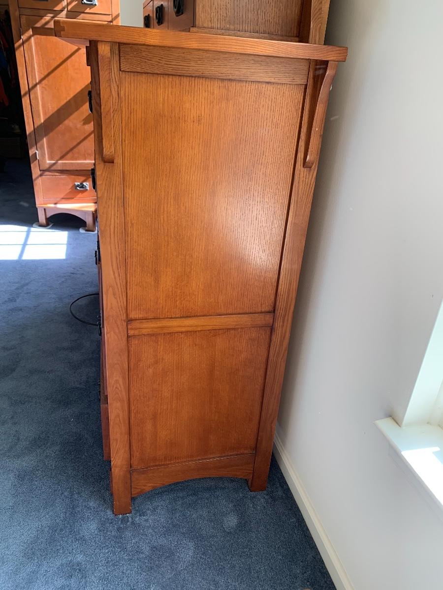 Oversized dress with a cedar lined center cabinet: oak colored.. This is a large piece of furniture help will be needed to move. Tons of storage and function along with style.