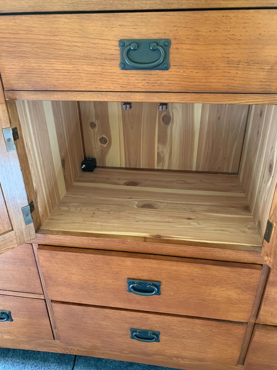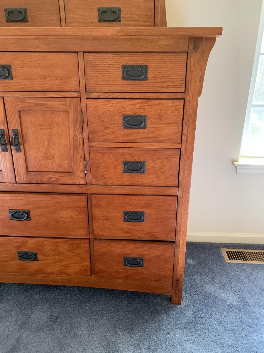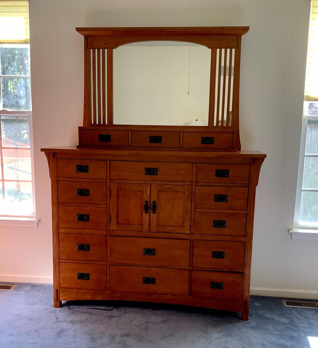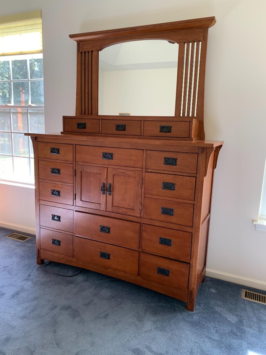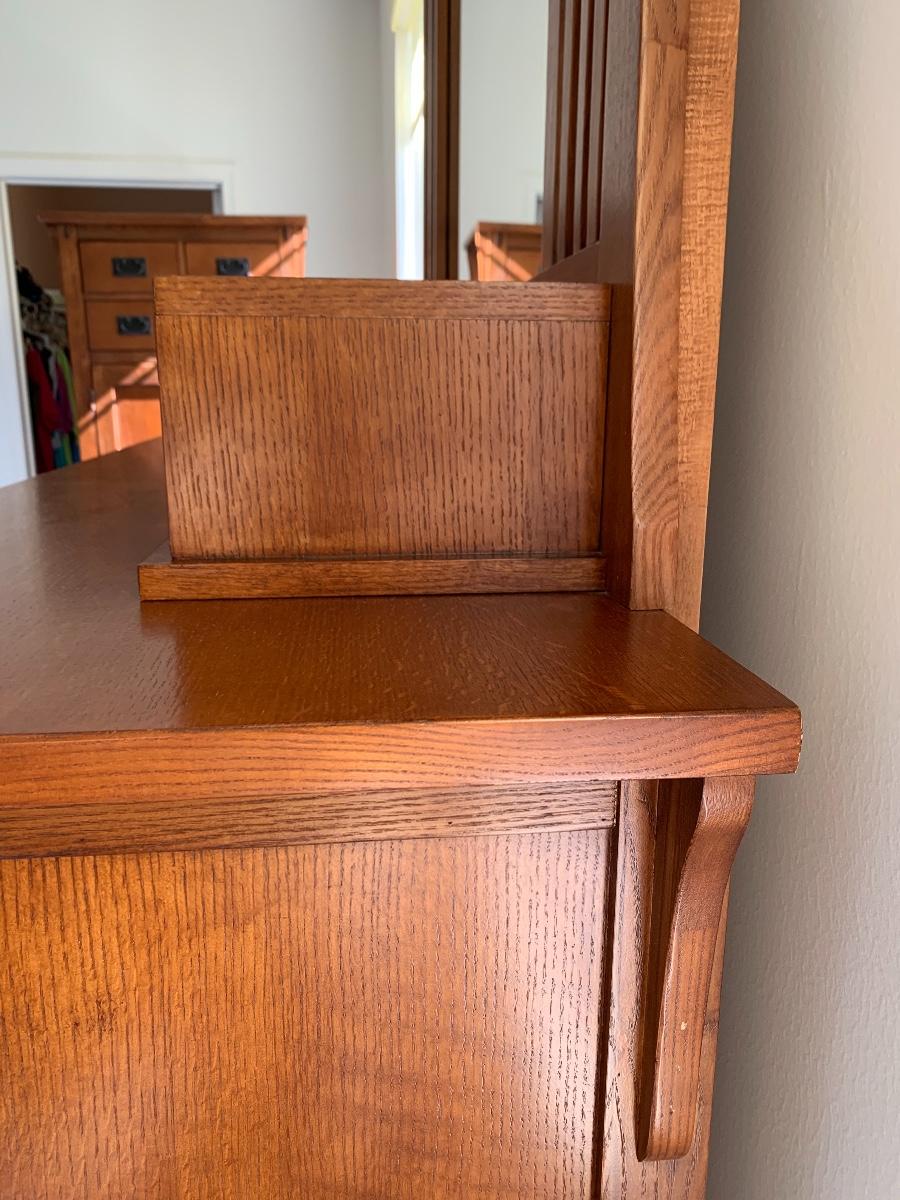 Oversized dress with a cedar lined center cabinet: oak colored.. This is a large piece of furniture help will be needed to move. Tons of storage and function along with style.