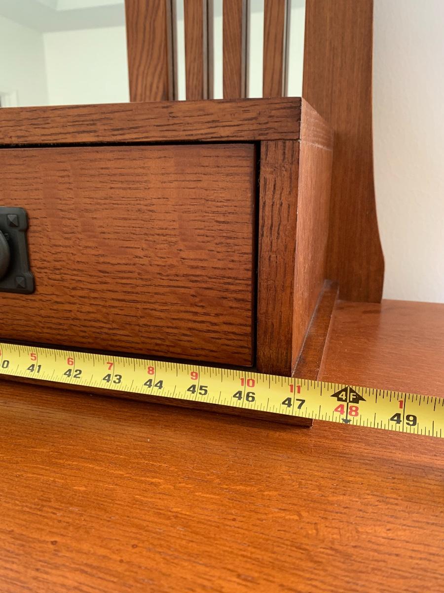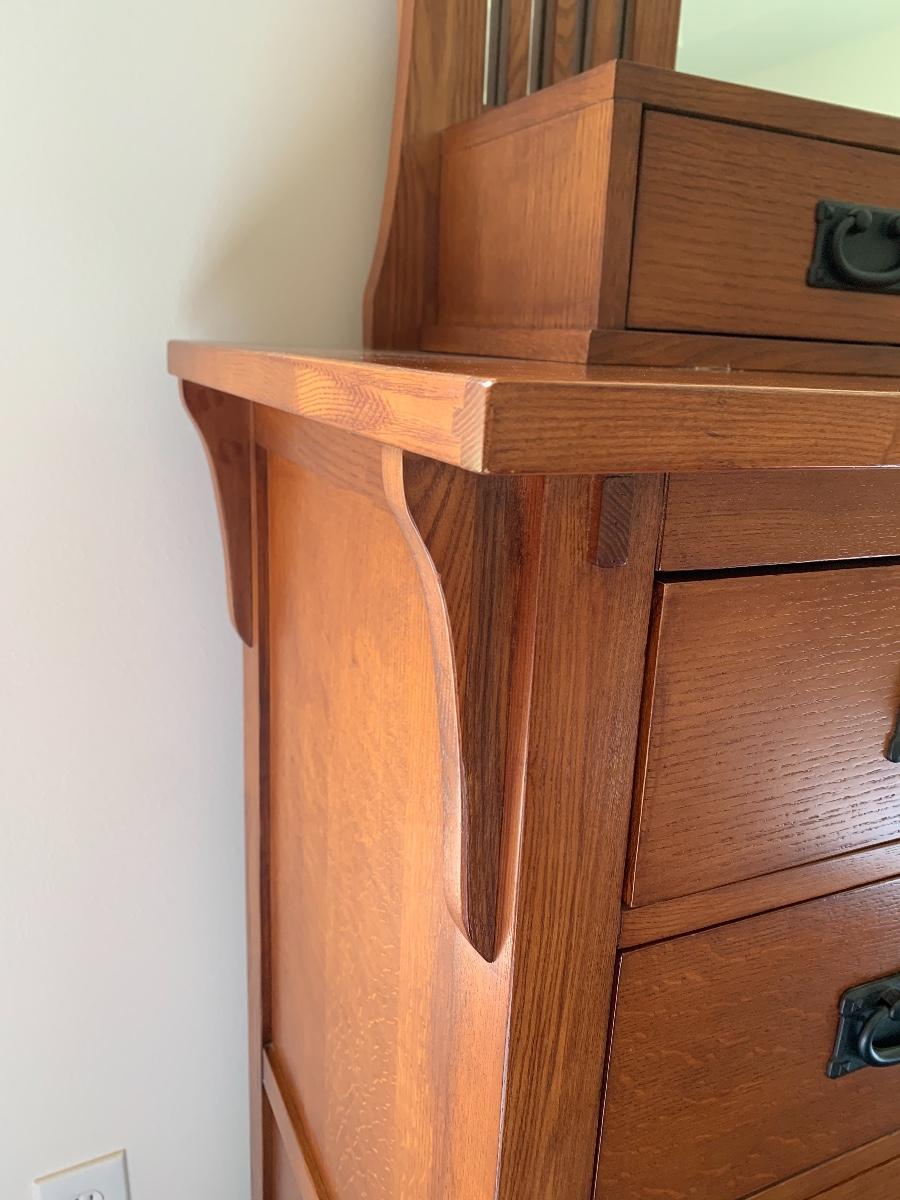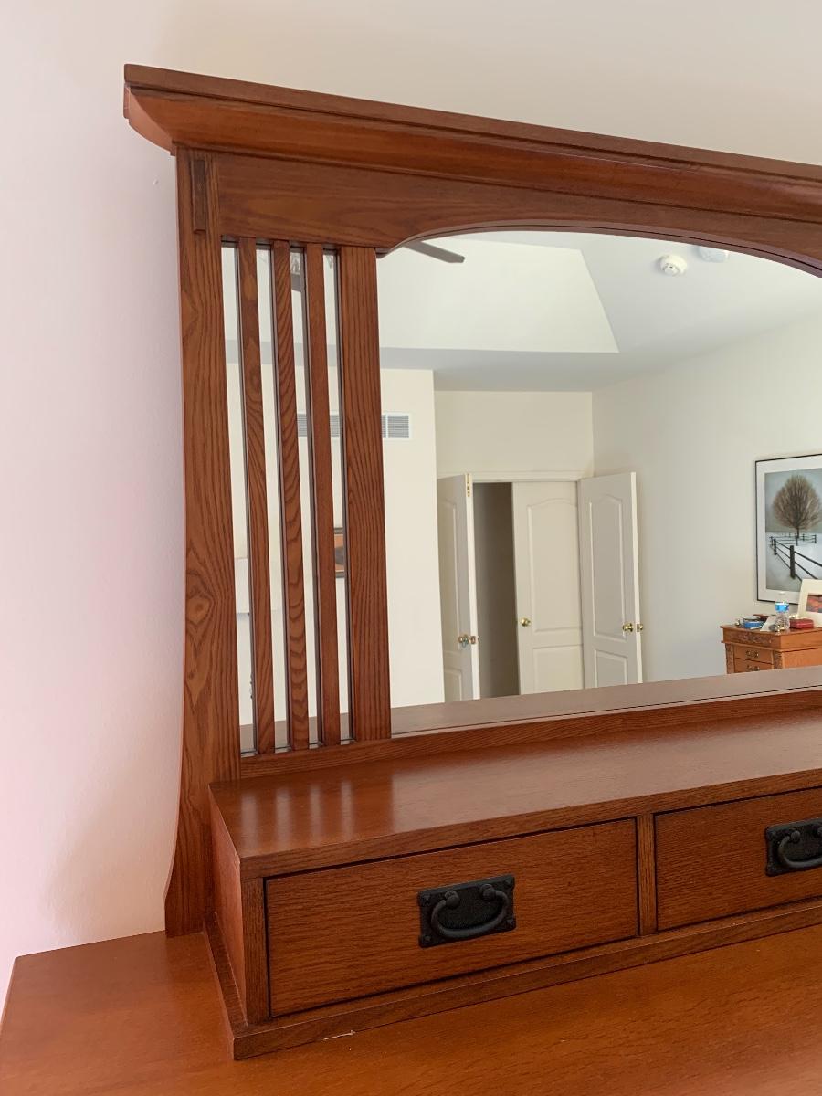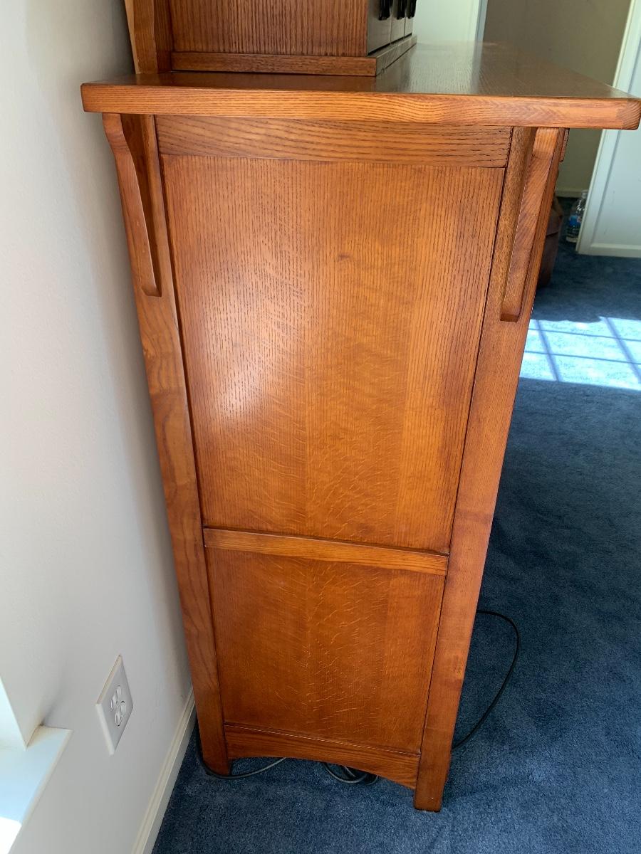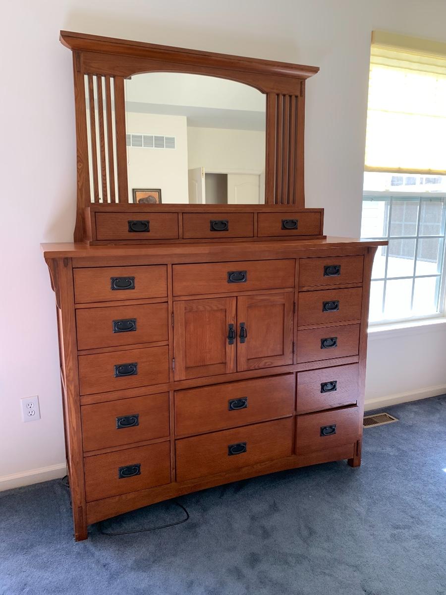 Oversized dress with a cedar lined center cabinet: oak colored.. This is a large piece of furniture help will be needed to move. Tons of storage and function along with style.